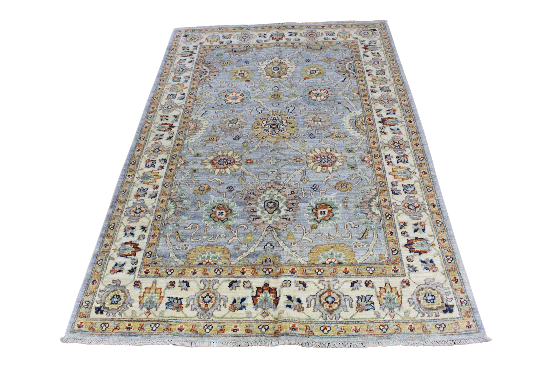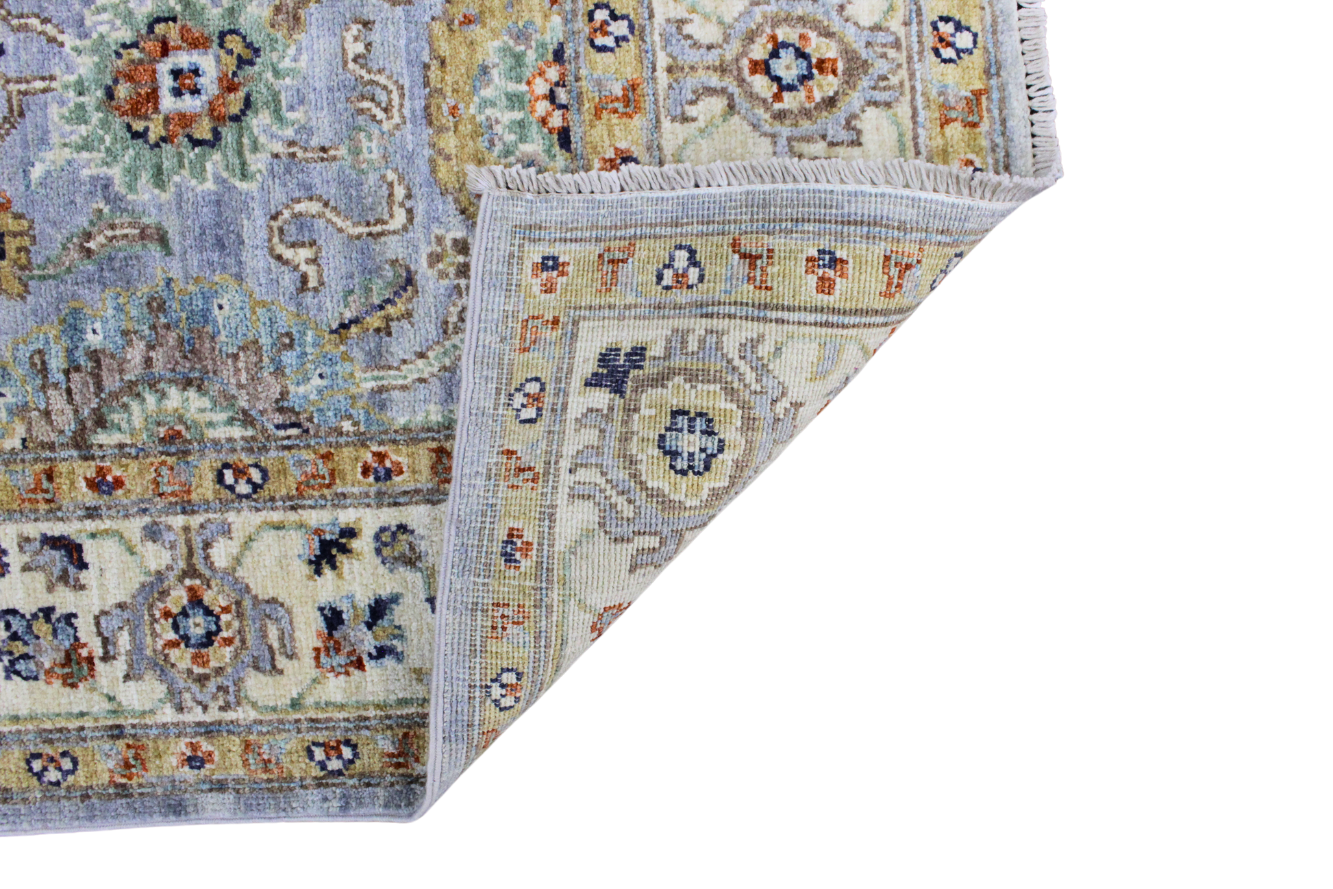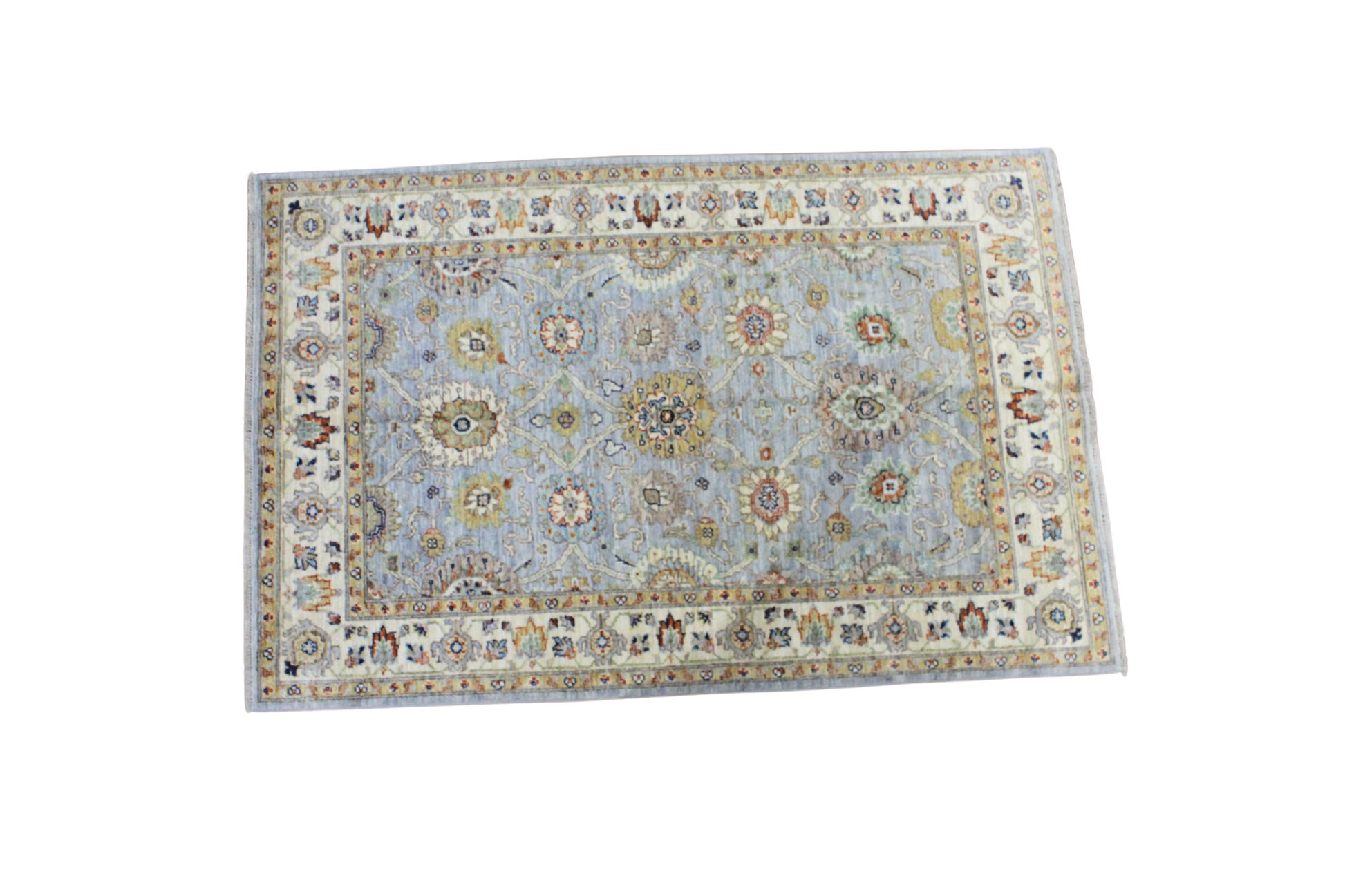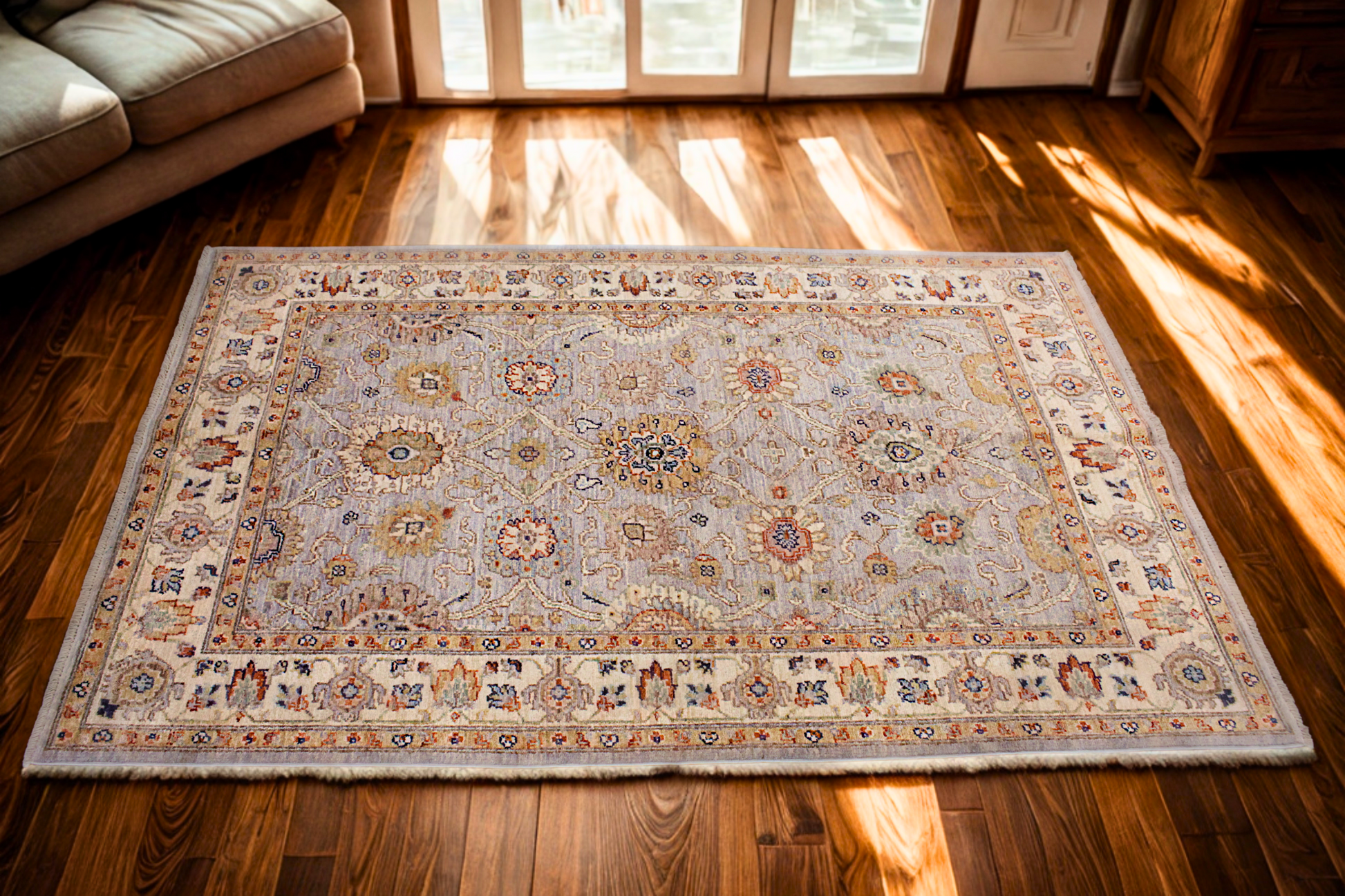 Rug 4 is a 3.11 x 6 hand-knotted Mahal rug from Afghanistan, offering a soft, serene presence through its finely detailed design and cool-toned palette. The light blue field serves as an elegant backdrop for the traditional allover floral layout, featuring palmettes, rosettes, and stylized vines in ivory, rust, gold, and navy. A creamy ivory border with classic Persian floral motifs frames the rug, adding depth and visual balance.