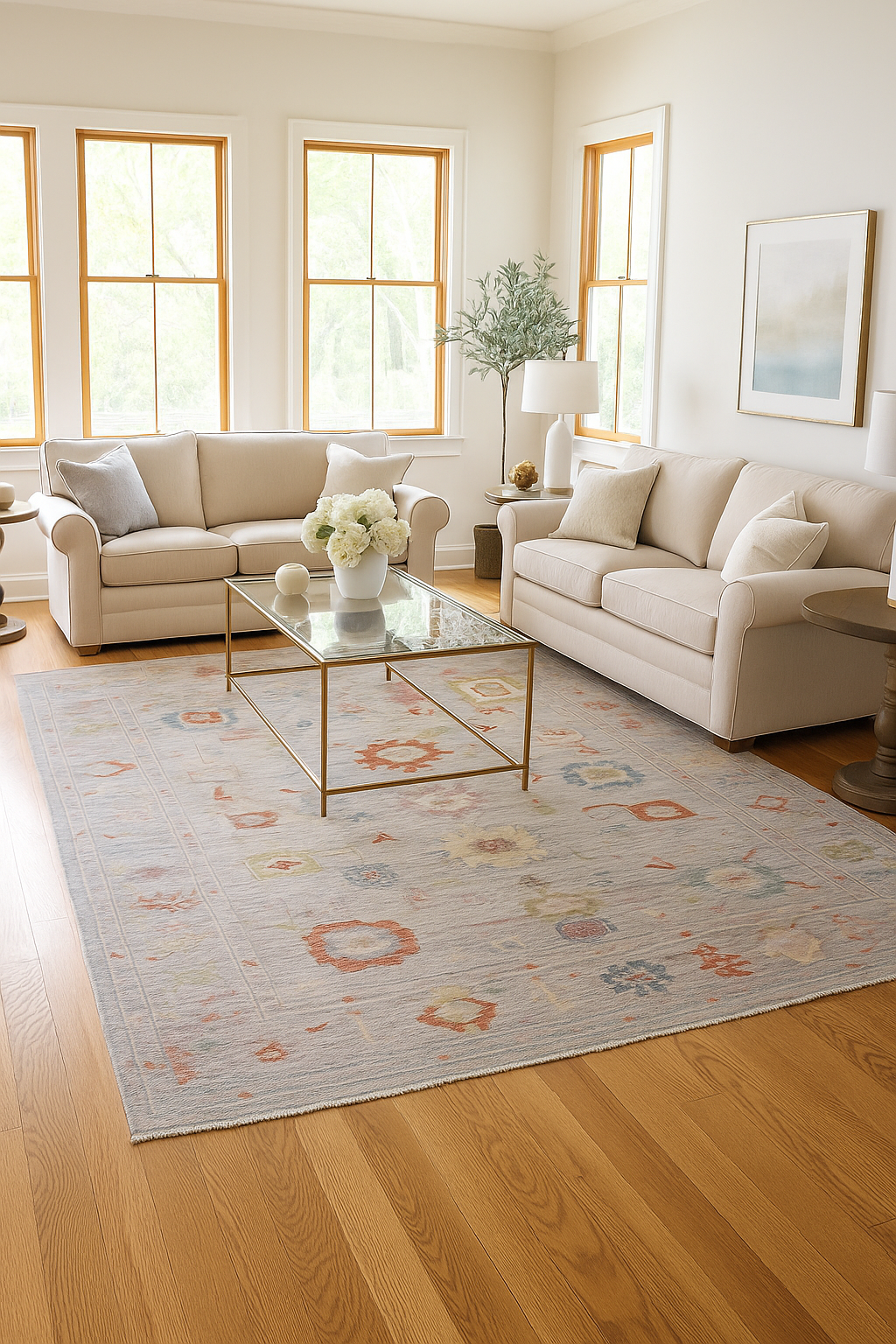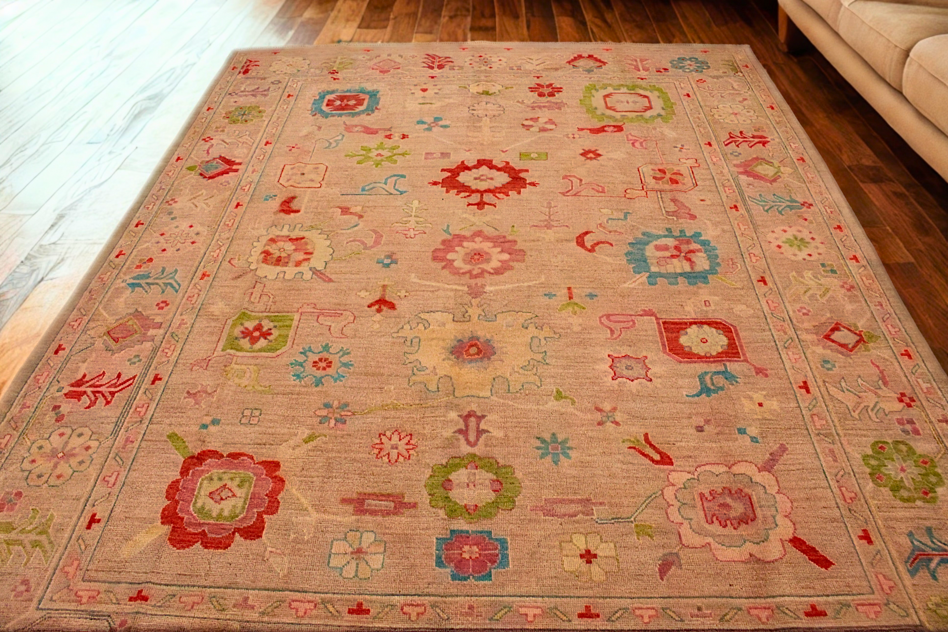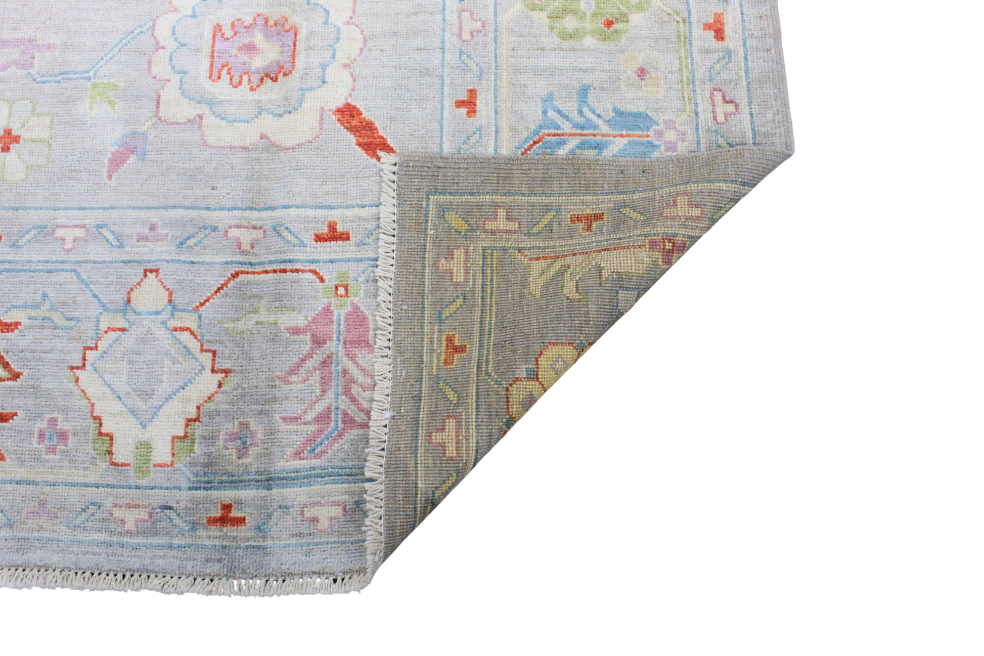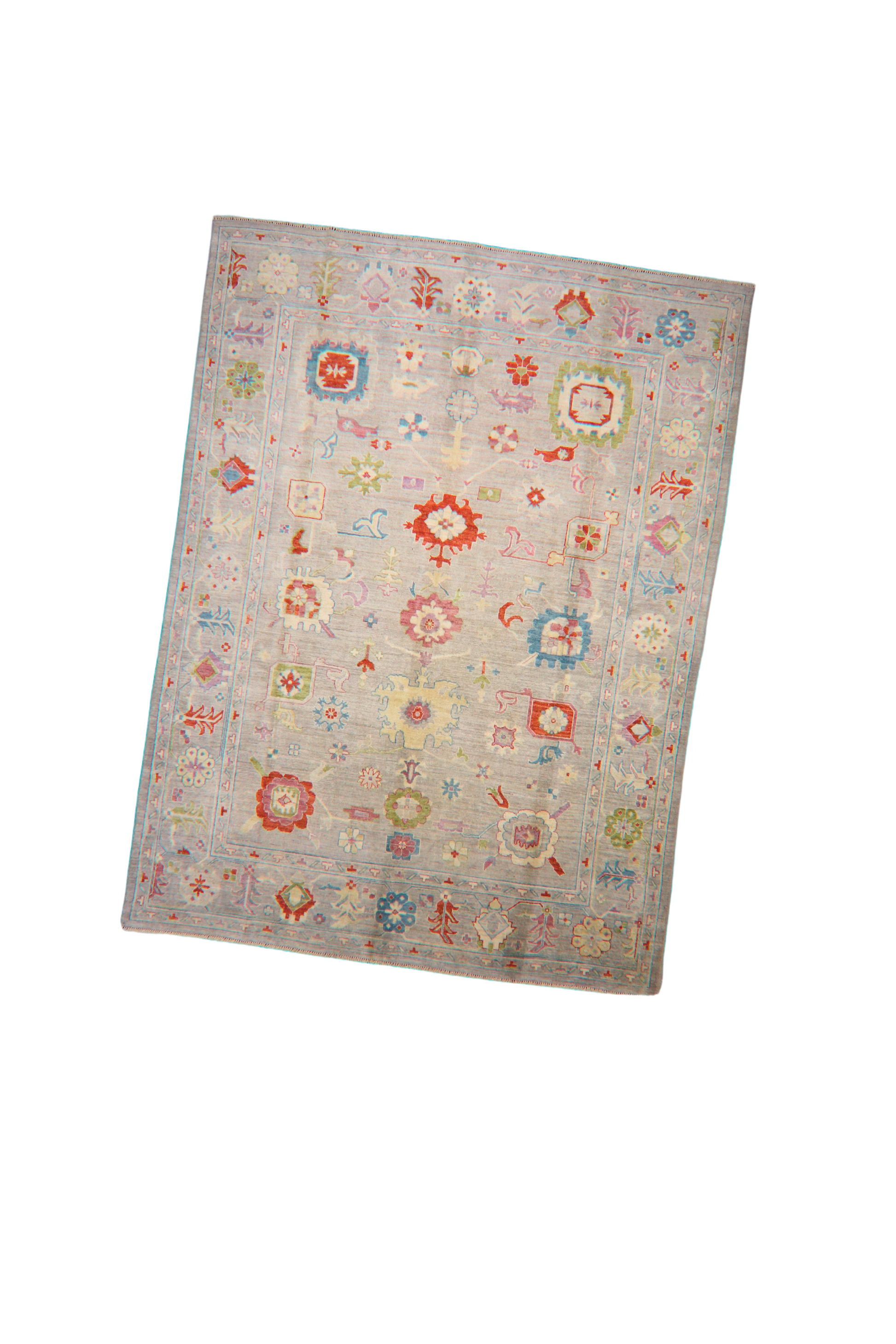 Bursting with personality, this hand-knotted Oushak rug (8.9 × 11.9 ft) is a delightful fusion of traditional craftsmanship and whimsical charm. Set on a soft stone-grey background, the rug features a vibrant spread of tribal florals, geometric medallions, and symbolic motifs in colors like ruby red, moss green, sapphire blue, lilac, and soft coral. Each motif feels like a celebration, scattered with intention to create a rhythm that energizes the eye without overwhelming.