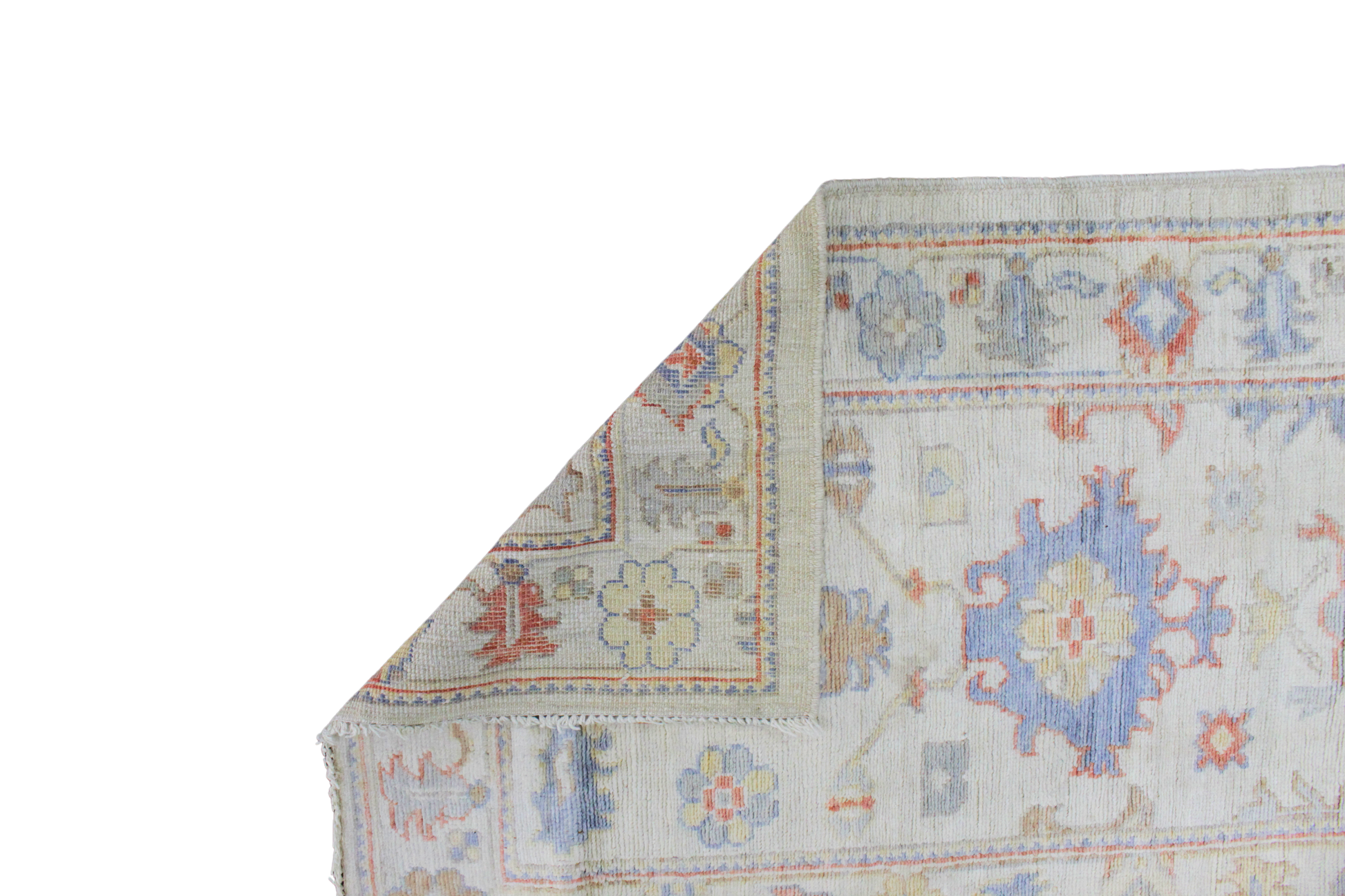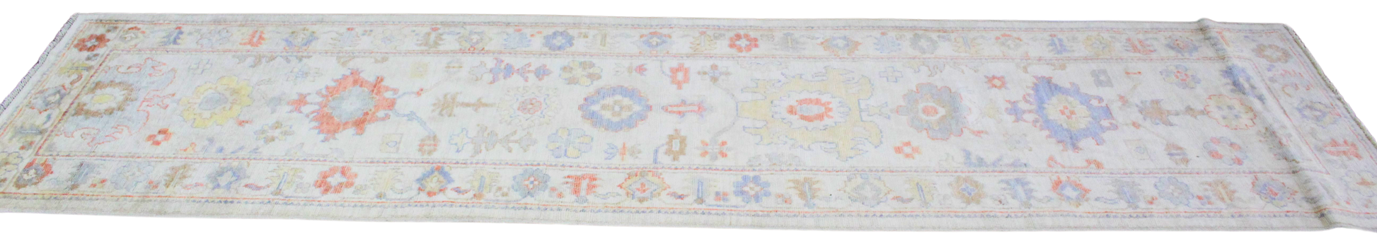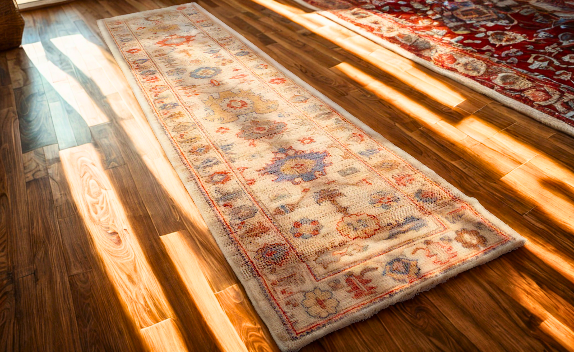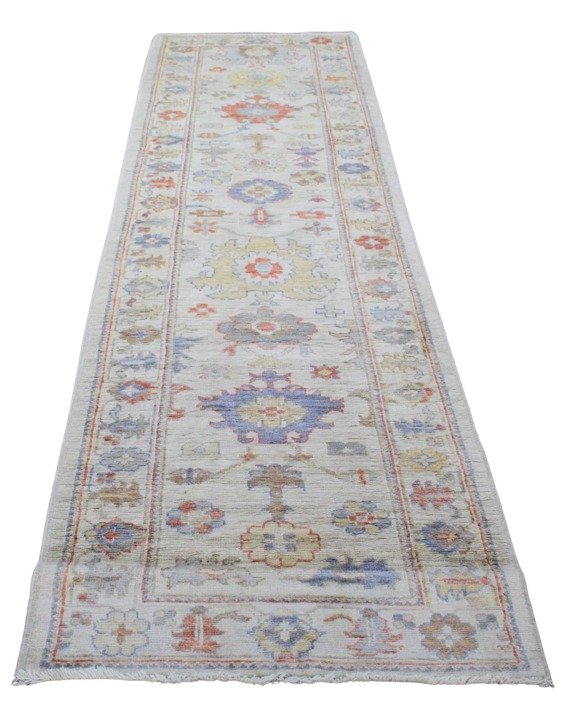 This charming Afghan Oushak runner feels like a faded echo of a summer afternoon — soft, luminous, and timeless. Its ivory-cream field carries playful floral medallions and vine motifs in gentle shades of butter yellow, sky blue, blush, and soft terracotta. The wide border frames the composition with a classic tribal rhythm, while the overall worn pastel palette brings a breezy, sunwashed elegance that works beautifully in relaxed, coastal, or transitional interiors.