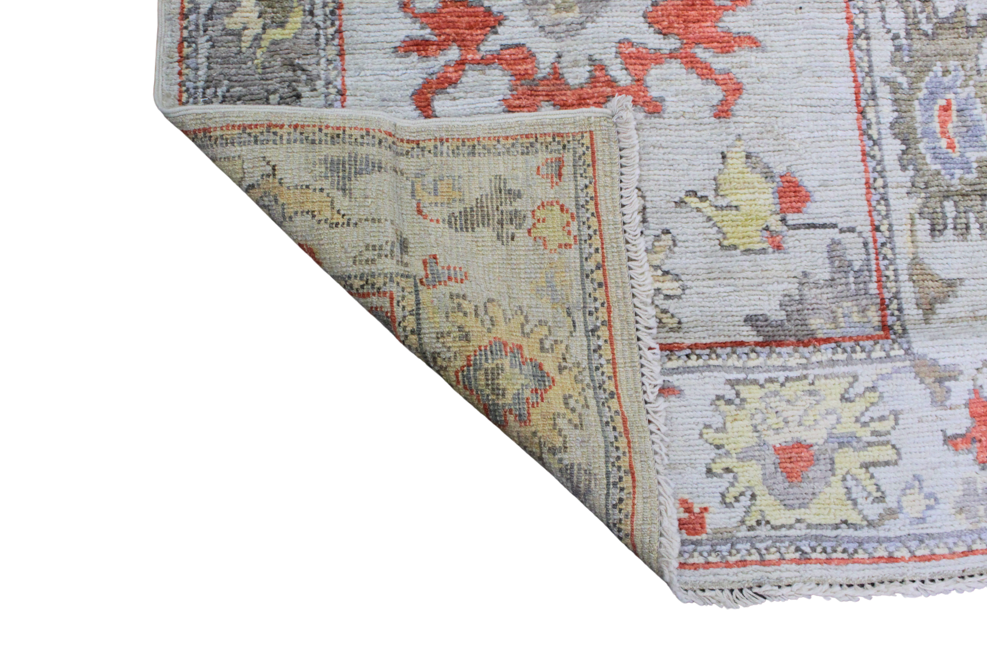 Bold yet graceful, this Afghan Oushak runner plays with scale and saturation to create a lively, organic rhythm across its creamy ground. Oversized floral medallions in shades of flame red, goldenrod, charcoal, and dusty lavender bloom down the center, framed by a tribal-style border with playful botanical details. The combination of whimsical forms and a soft, muted base makes this piece a striking yet balanced accent for contemporary, rustic, or boho spaces.
