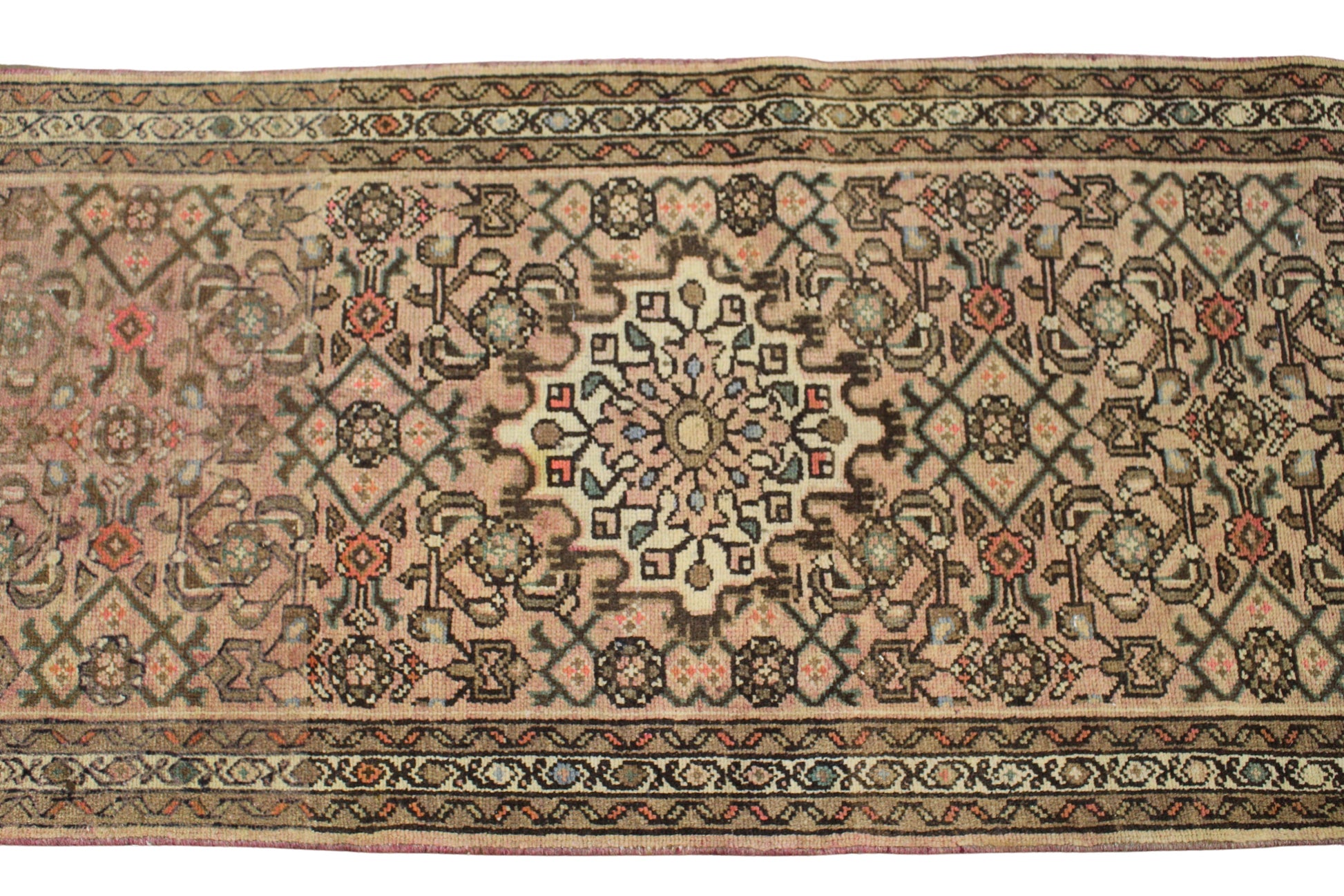 This antique Persian Hamedan runner (2.7 × 10.8 ft) offers a masterclass in balance and symmetry. At its heart lies a centered medallion — elegantly understated — surrounded by a rhythmic lattice of botanical rosettes, palmettes, and angular vinery. The design flows organically yet are carefully ordered, reflecting the refined craftsmanship of Hamedan weavers.