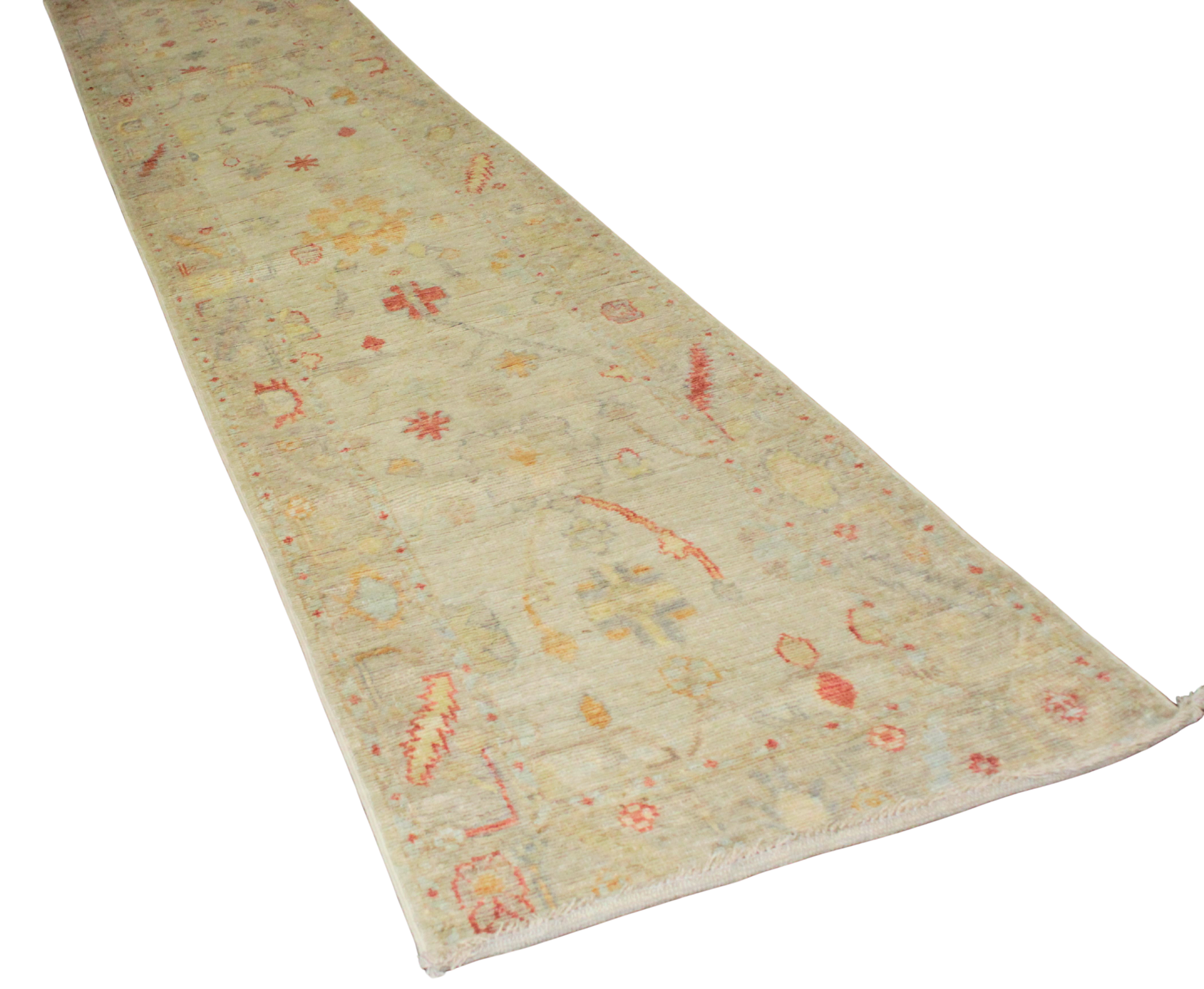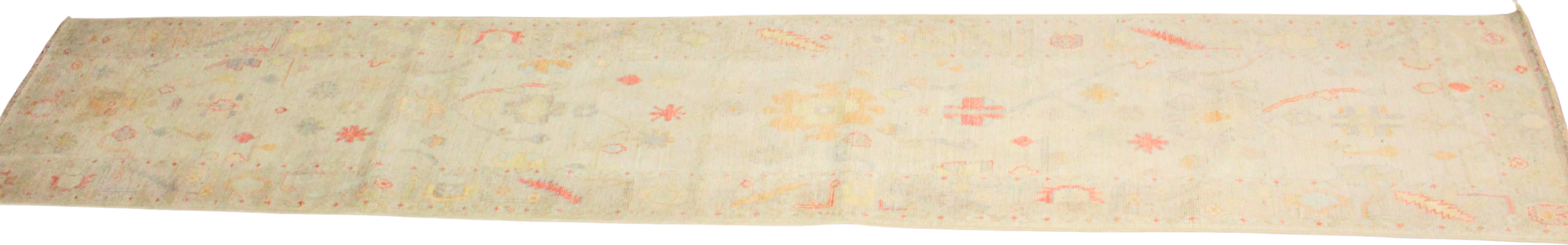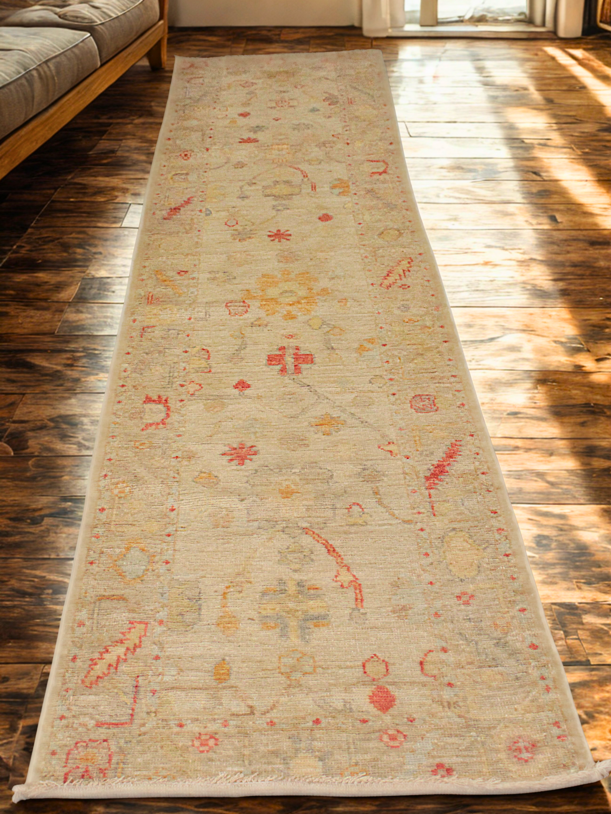 Soft and serene, this long Afghan Oushak runner is like a quiet path through a misty morning garden. Its ivory-toned field is gently patterned with scattered floral and tribal motifs in washed tones of butter yellow, faded coral, powder blue, and ash grey. The design feels whisper-light, making it perfect for brightening narrow spaces without overwhelming them. The extra length provides a beautiful flow in extended corridors or open-concept layouts.
