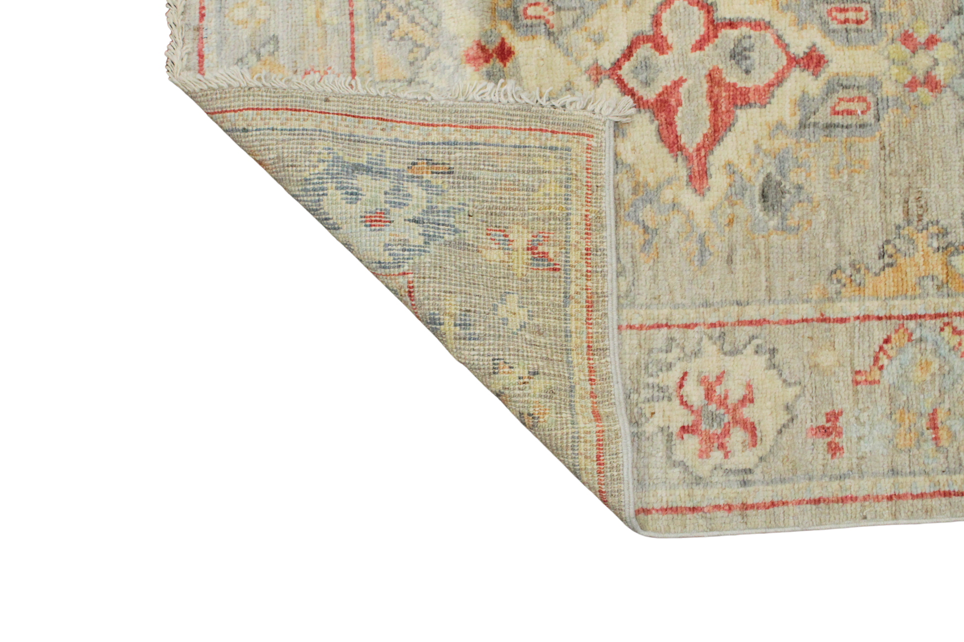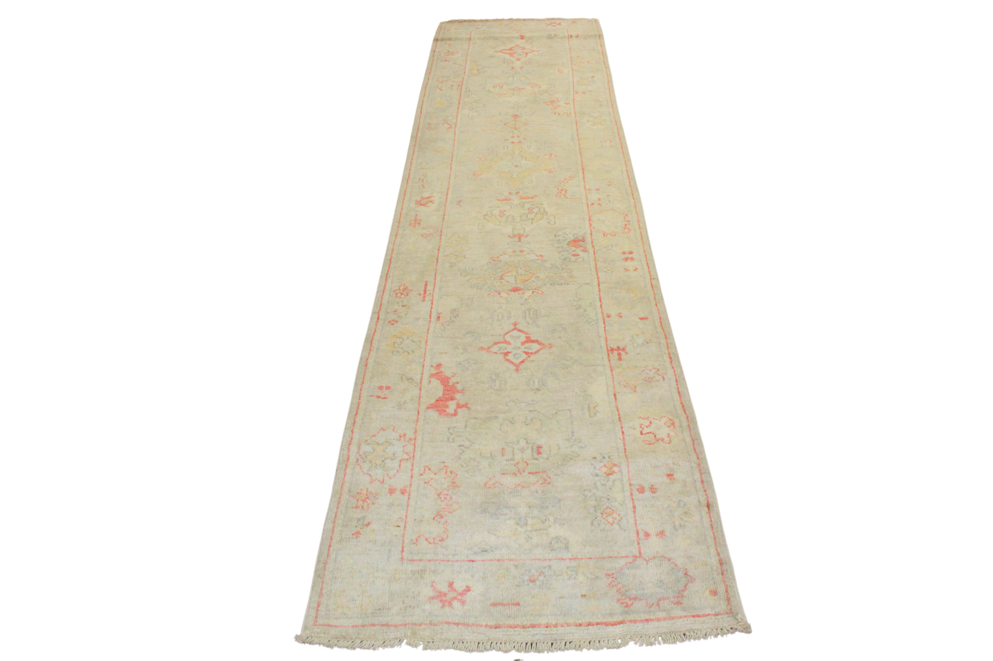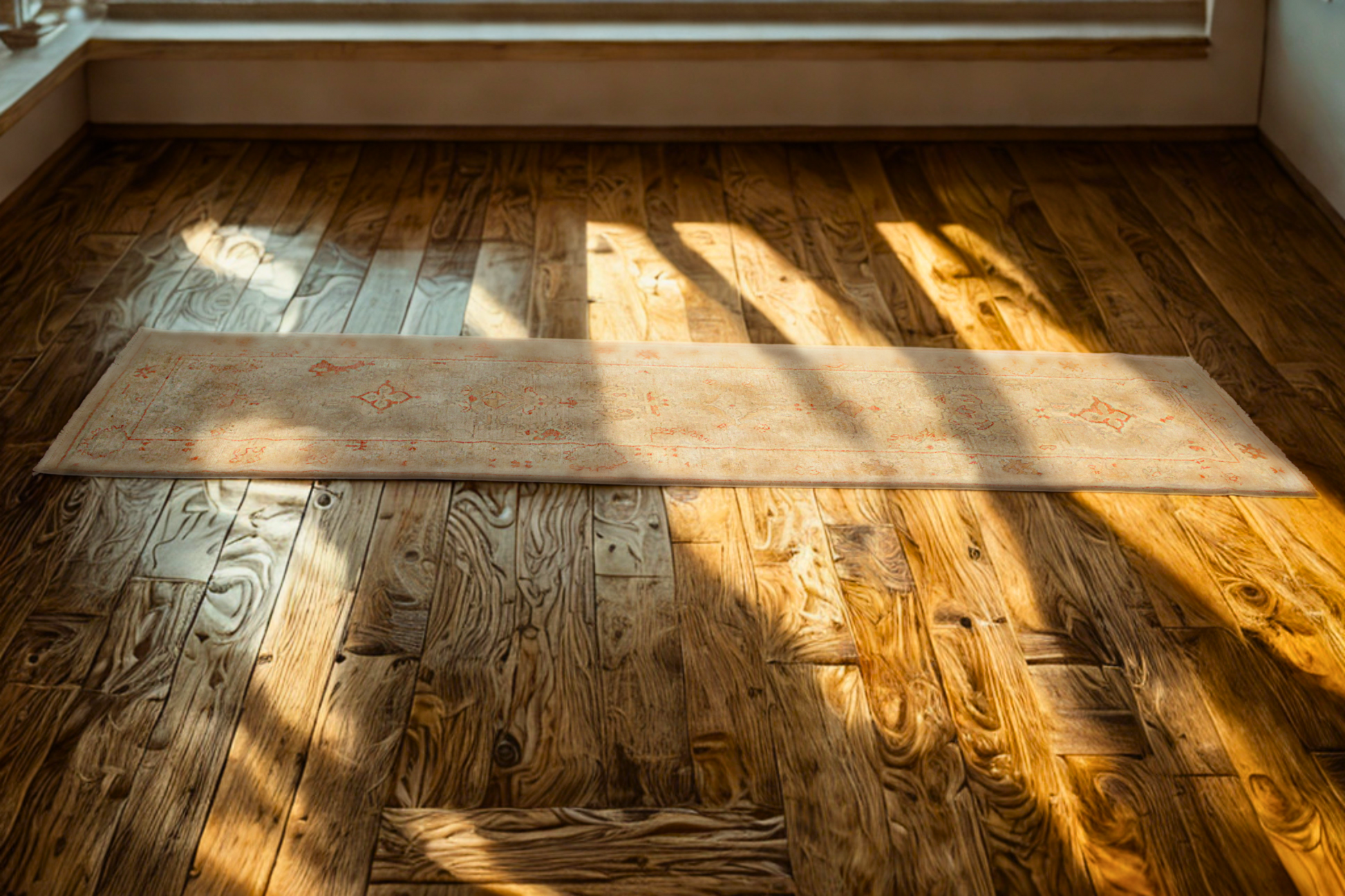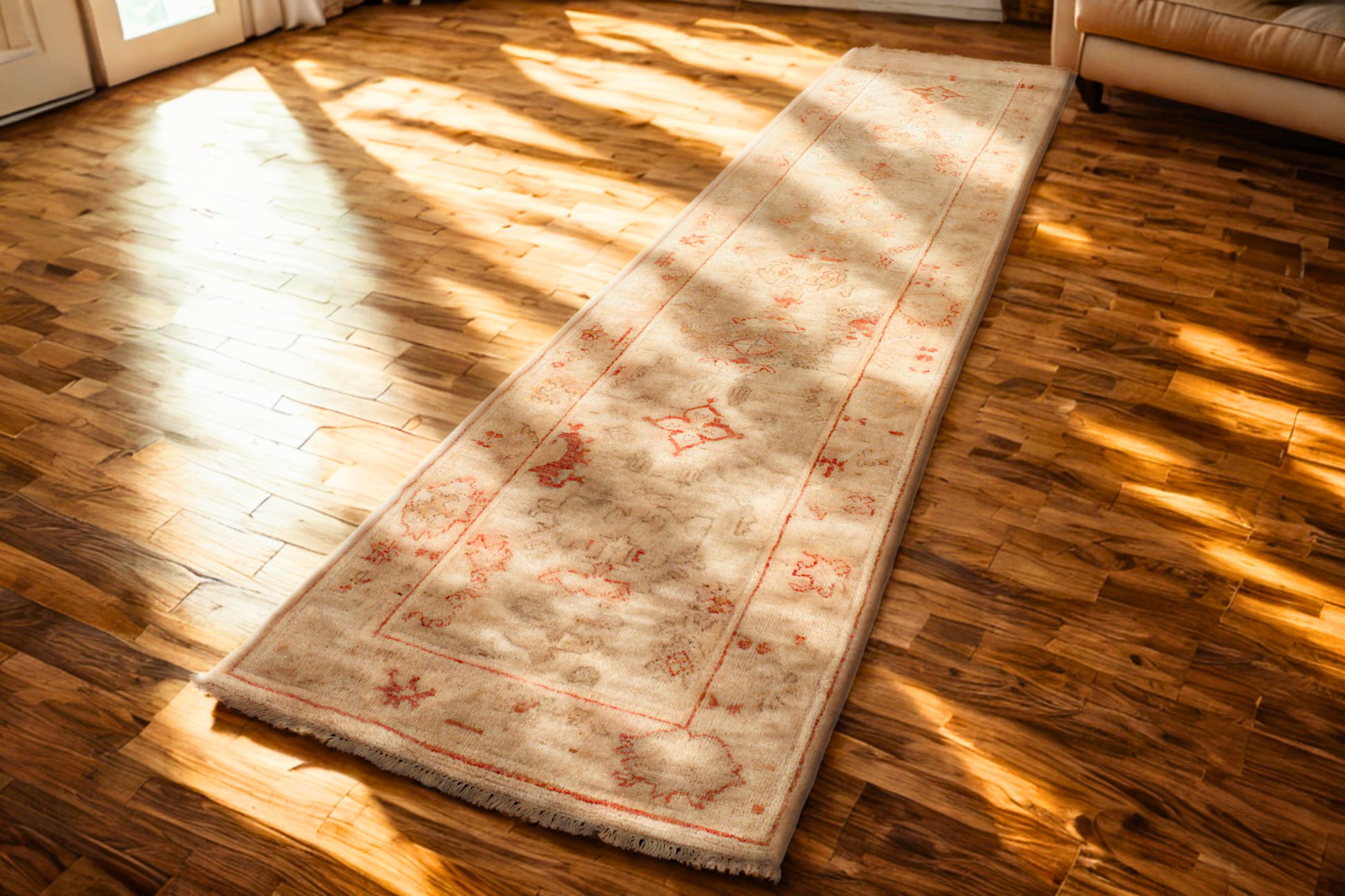 This elegant Afghan Oushak runner brings the softness of early light into your home with its pale ivory field and quiet arrangement of geometric medallions and stylized florals. Muted rose, faded gold, dusty blue, and sandstone tones drift through the design like the first hues of sunrise. The balanced, symmetrical pattern feels calm and refined, while the length makes it ideal for adding grace to long, narrow spaces.