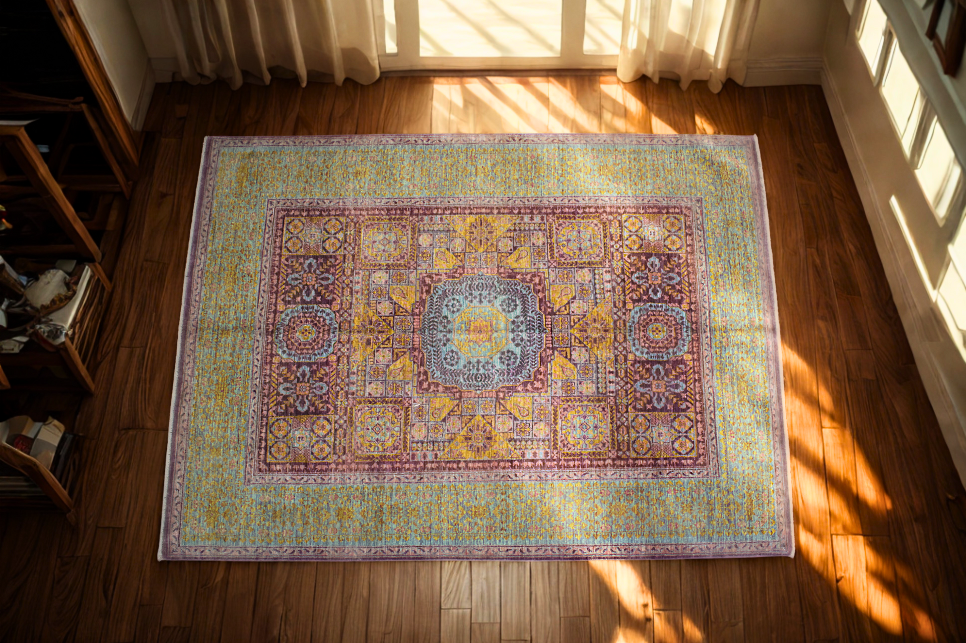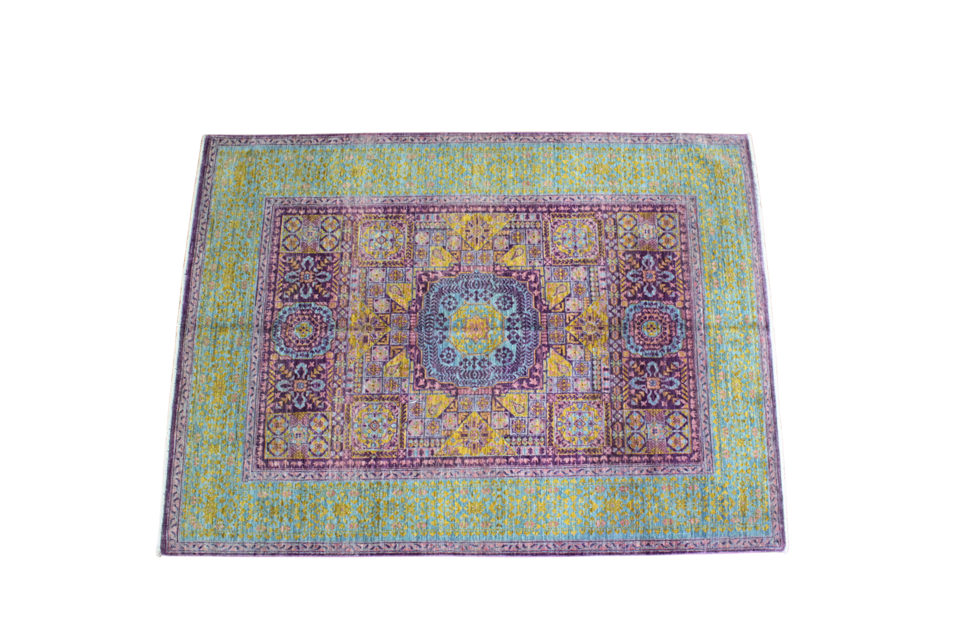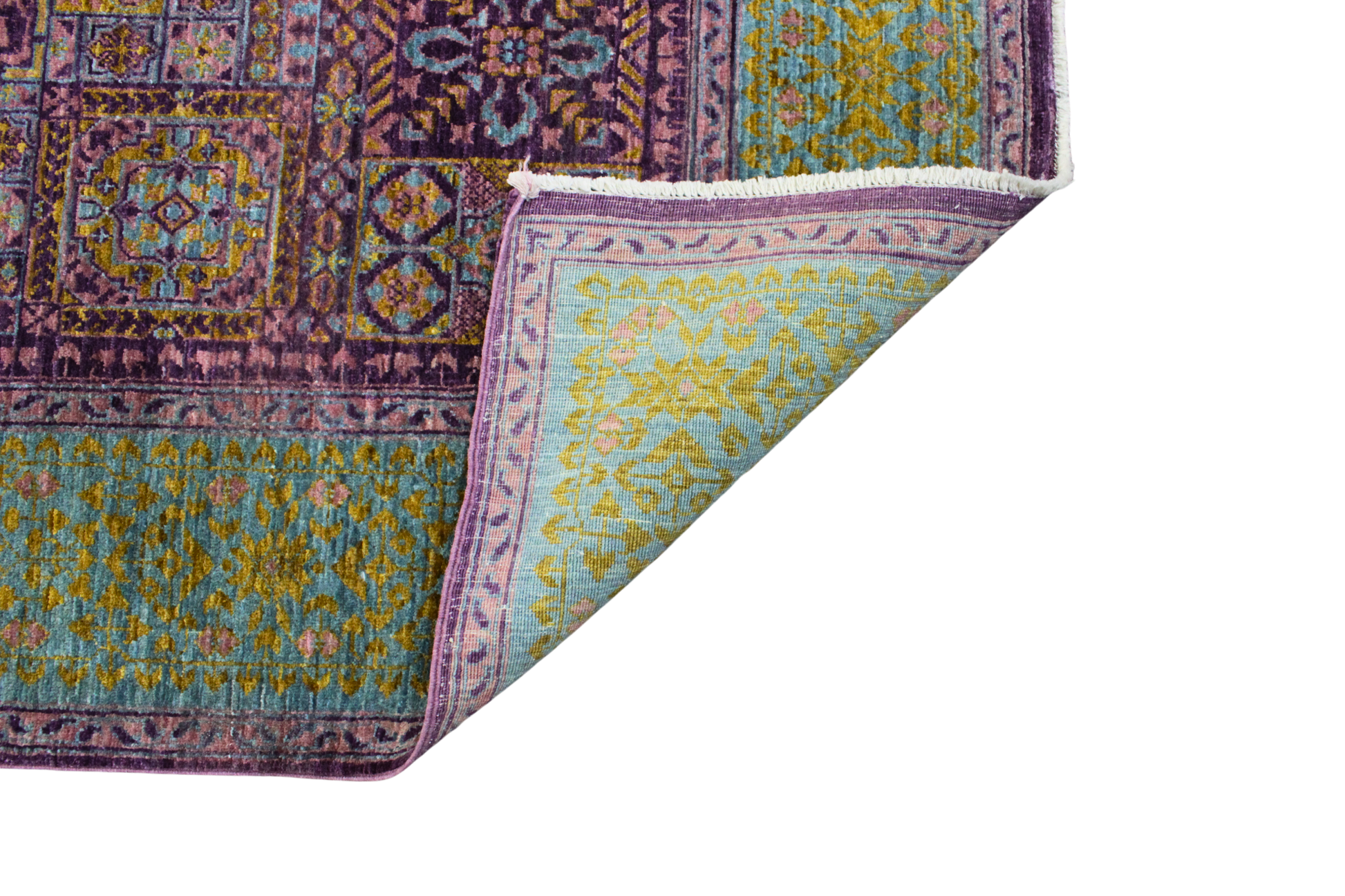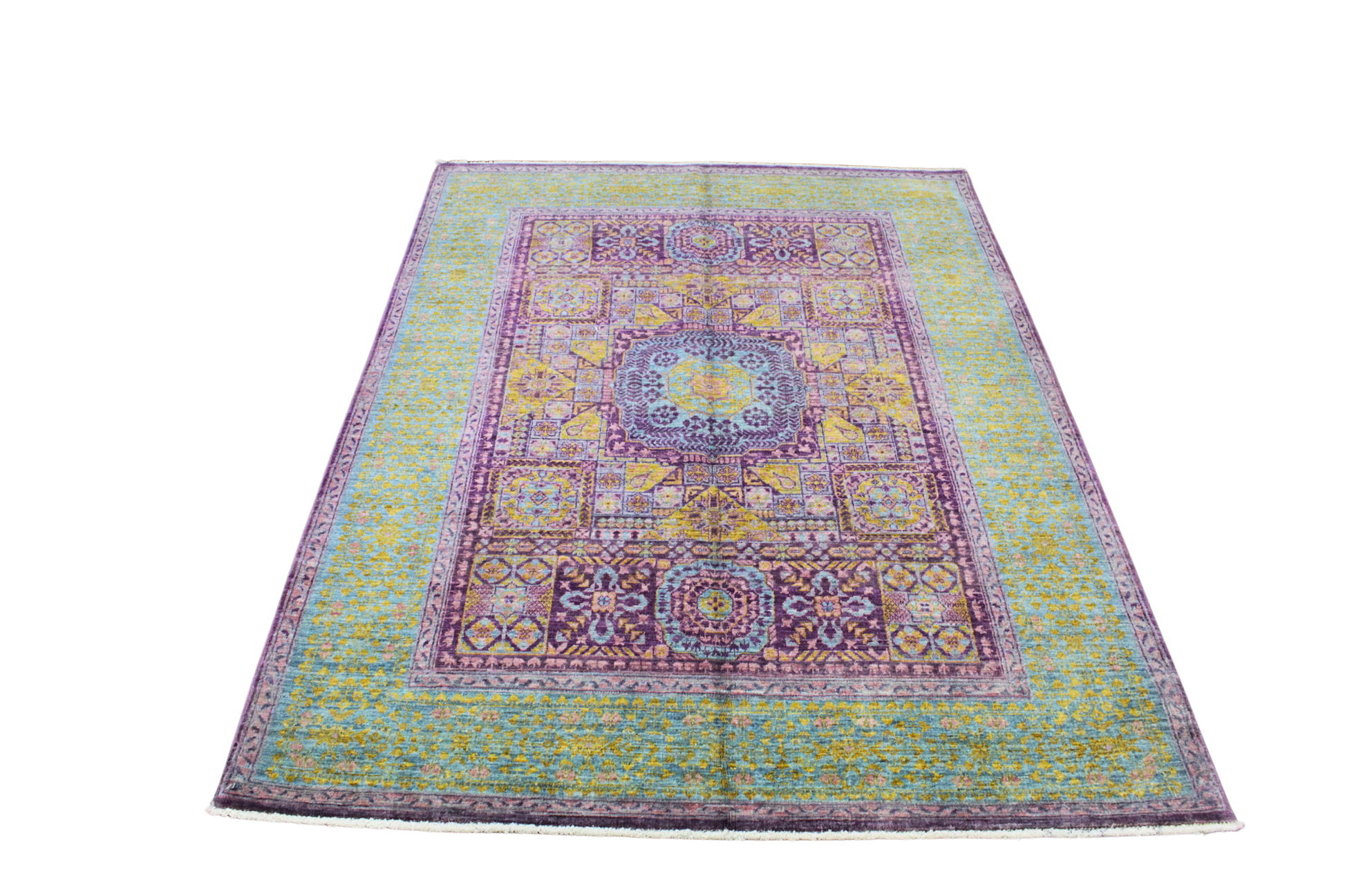 Rug 6 is a 4.11 x 6.8 hand-knotted Mamluk rug from Afghanistan, radiating energy and artistry with its bold geometry and vivid jewel-tone palette. The rug features a detailed, symmetrical medallion at its heart—surrounded by intricate tile-like motifs in rich purples, deep aquas, and golden saffron tones. A vibrant turquoise border encircles the composition, adding contrast and depth while drawing the eye toward the finely balanced central field.