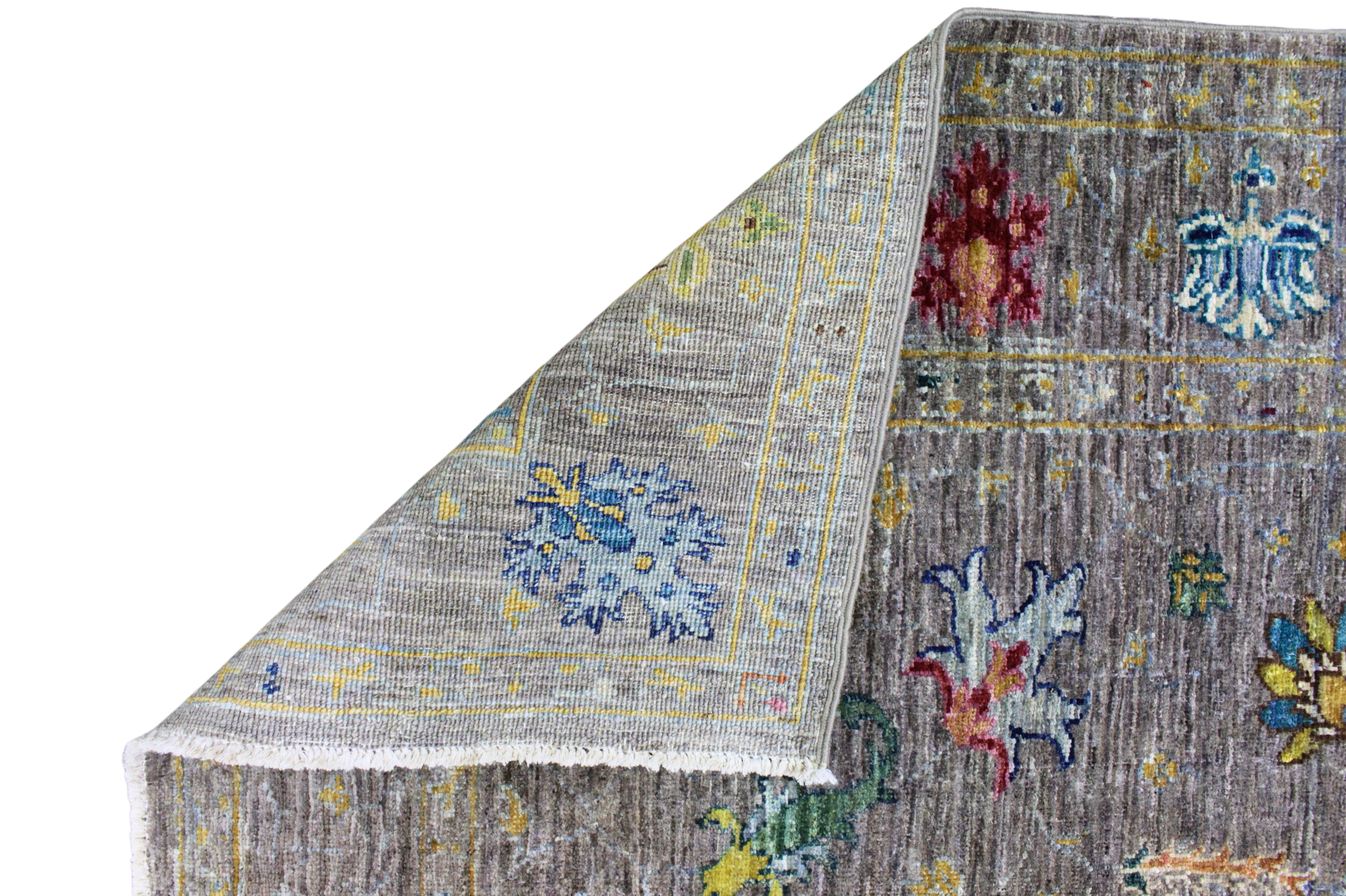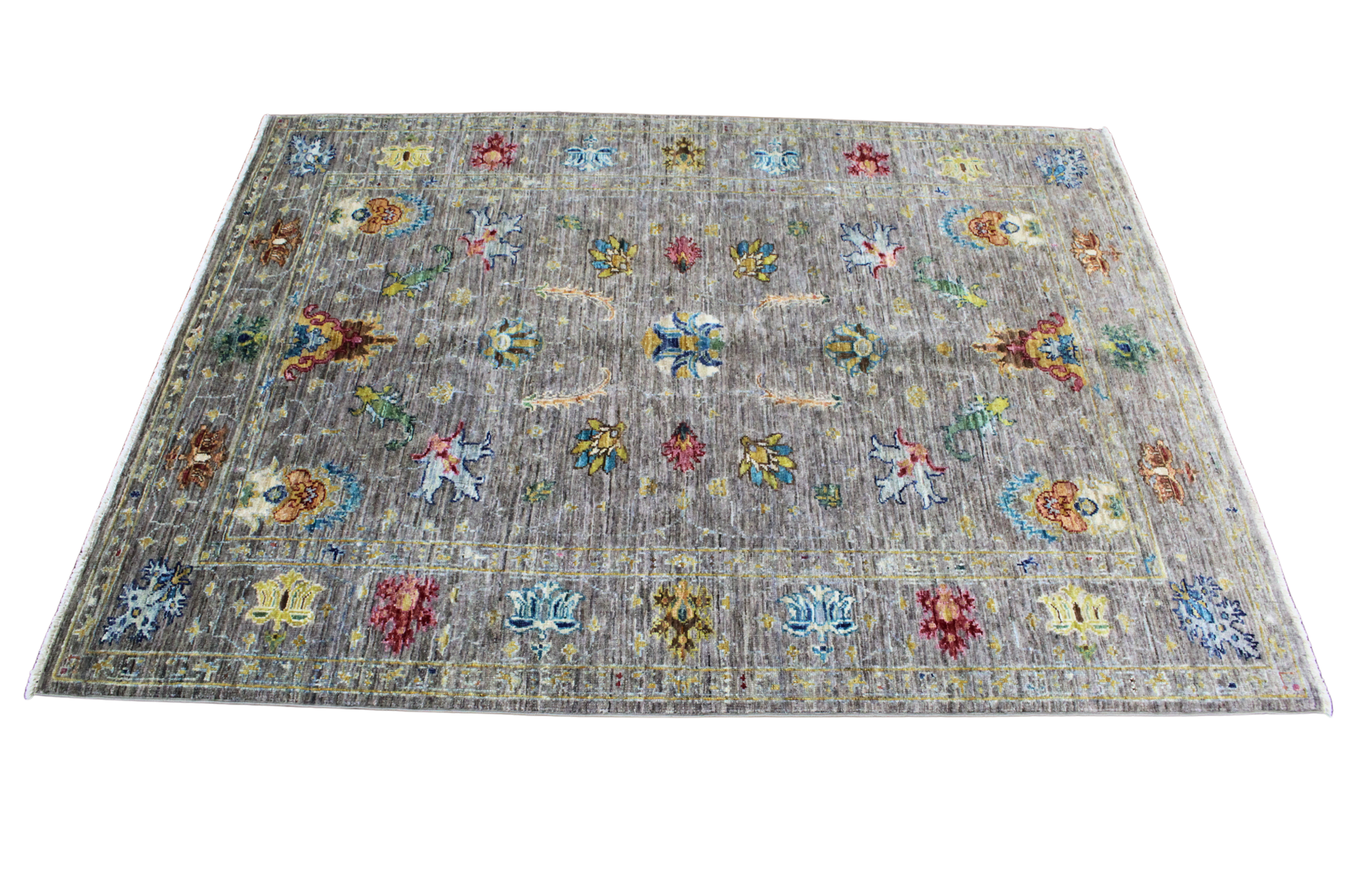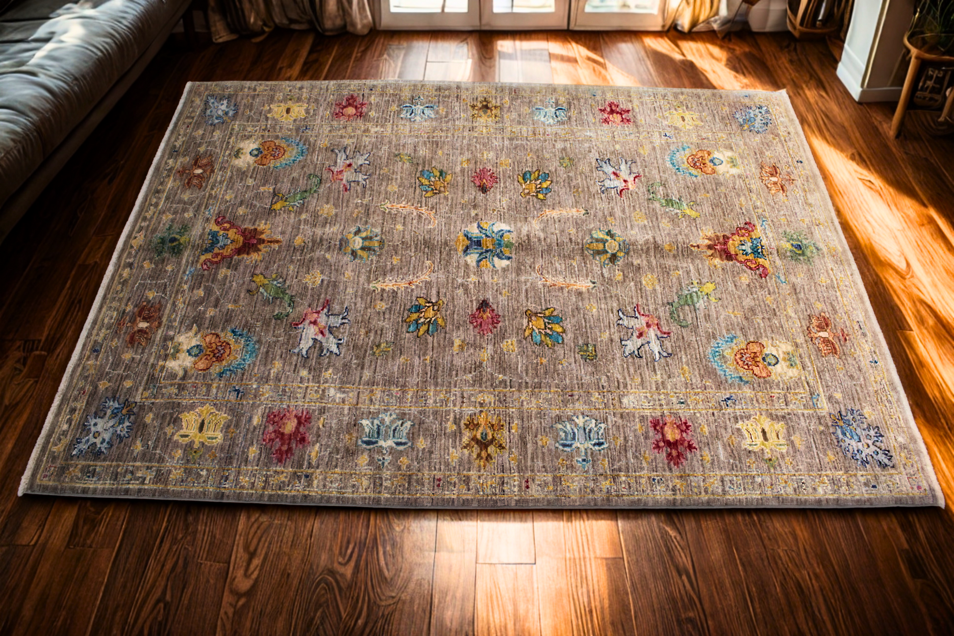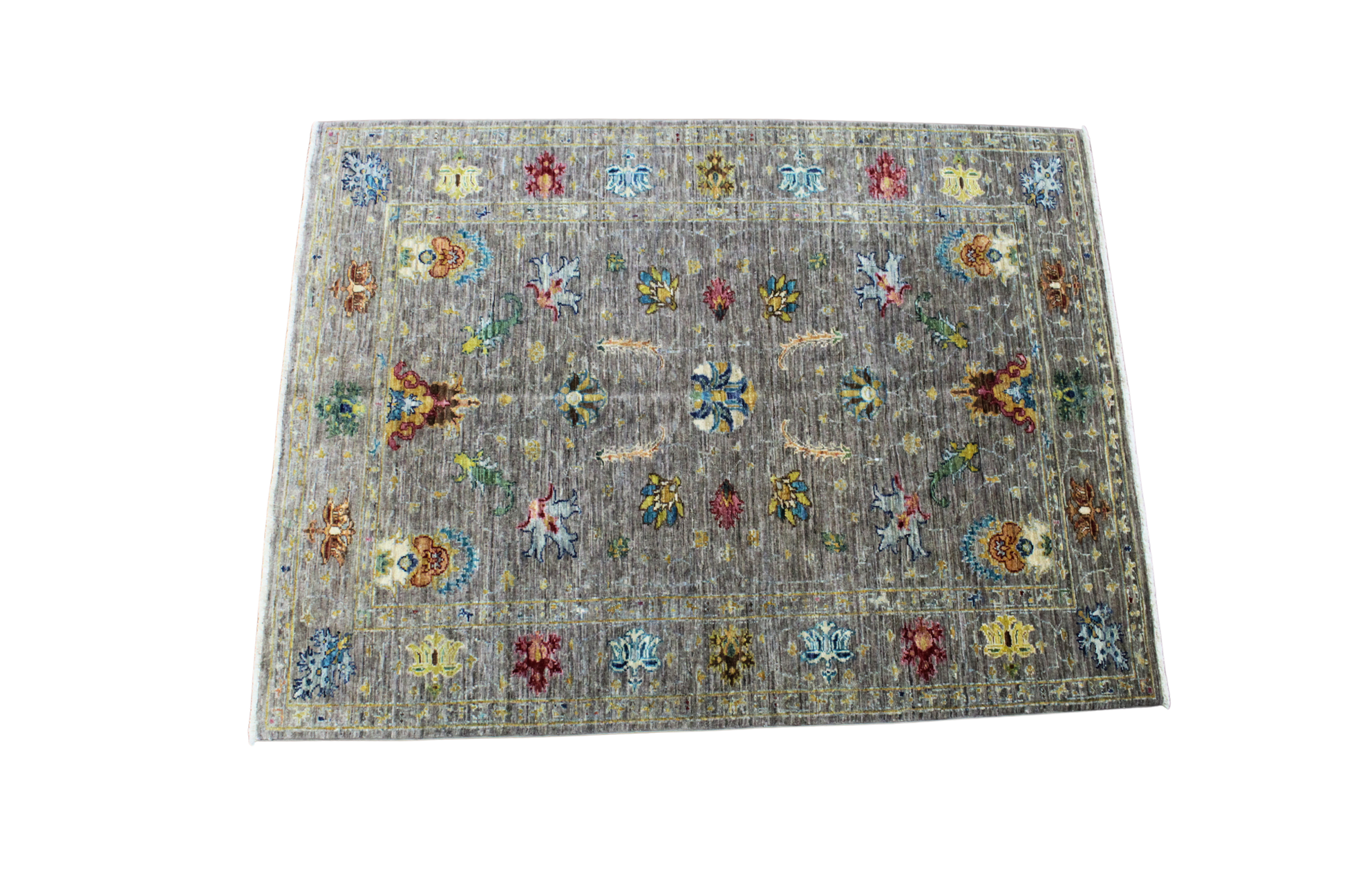 Bold yet balanced, this Afghan Tabriz rug (4.1 × 5.4 ft) brings refined drama to your space. Set against a rich graphite gray ground, its intricate floral motifs and palmettes bloom in a vibrant spectrum of jewel tones—turquoise, ruby, amber, sapphire, and emerald—giving the piece an almost luminous quality. The field is beautifully framed by a wide border that echoes the same vivid hues, adding cohesion and structure.