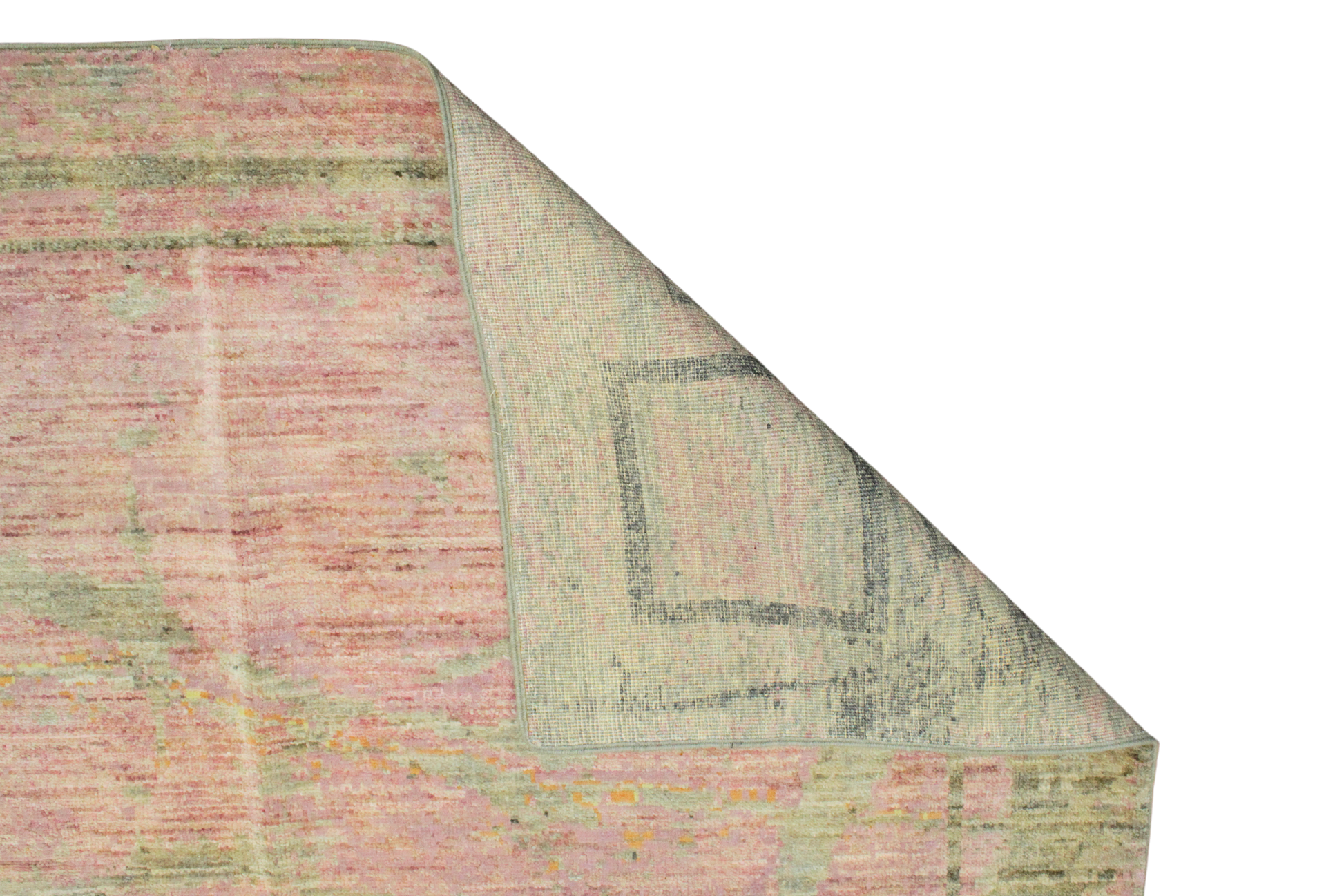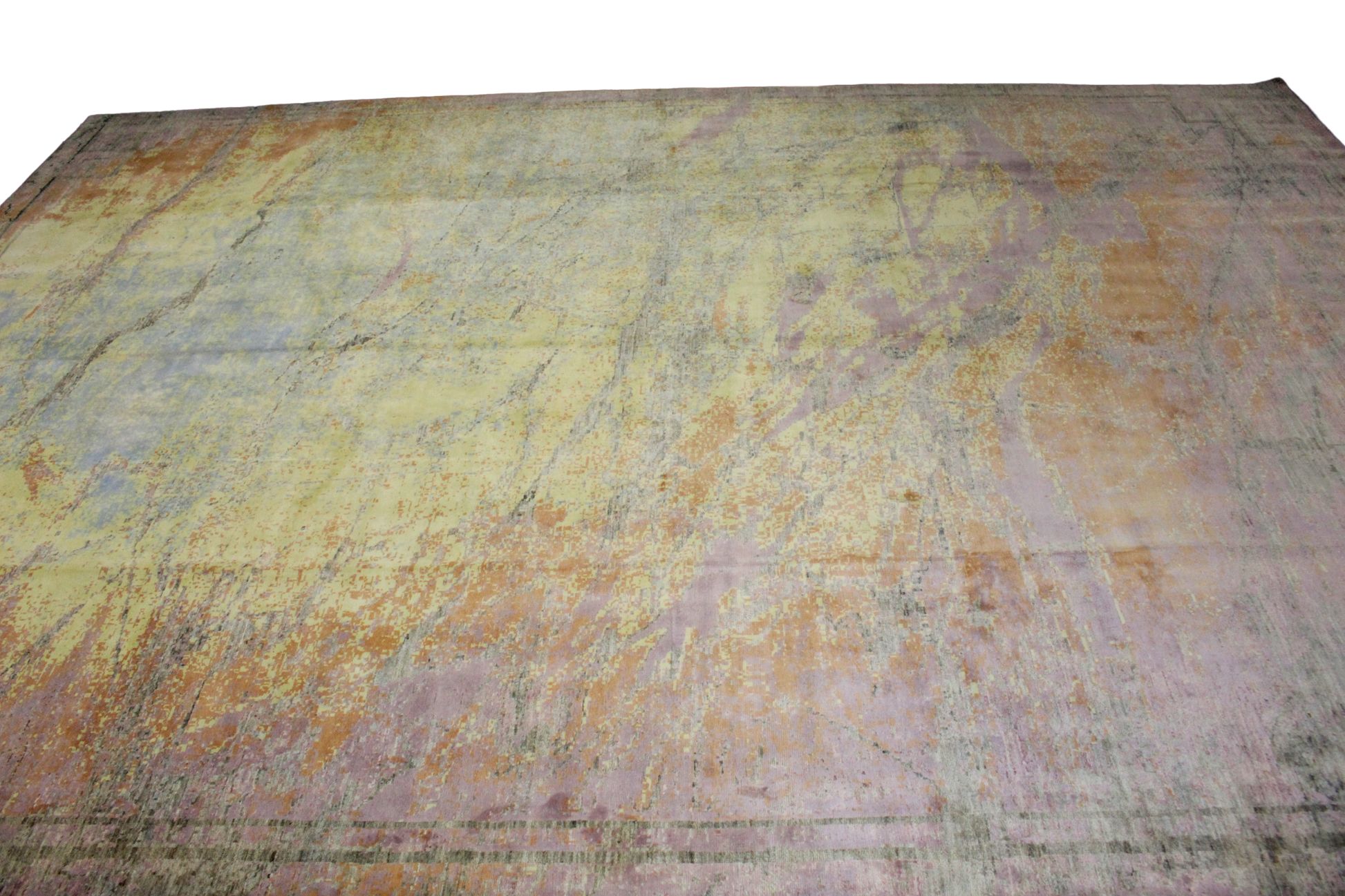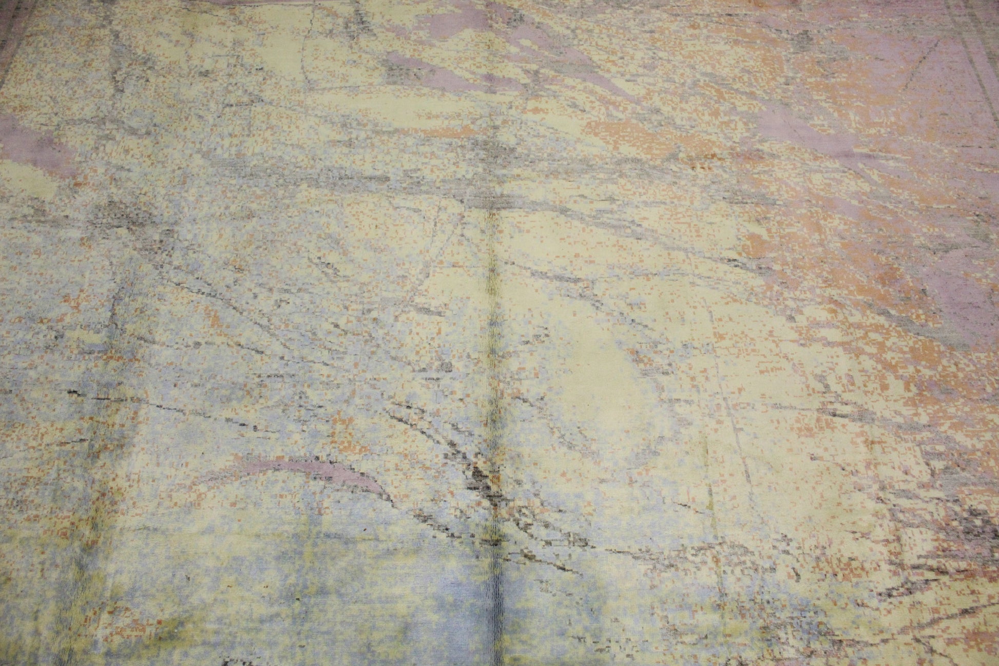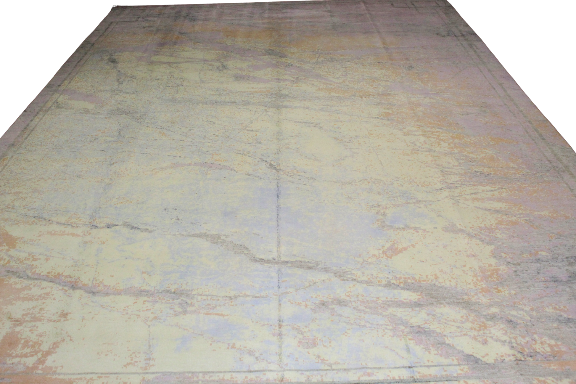 Radiating the ethereal beauty of sunlight over natural stone, this modern Afghan rug (9.11 × 14.3 ft) captures the organic elegance of marble veining with an artful, painterly touch. Its surface is awash in soft pastels — muted amber, pale lilac, powder blue, and champagne — layered in delicate streams across a warm ivory field. Subtle linear borders frame the composition, adding gentle structure without disrupting the fluidity.