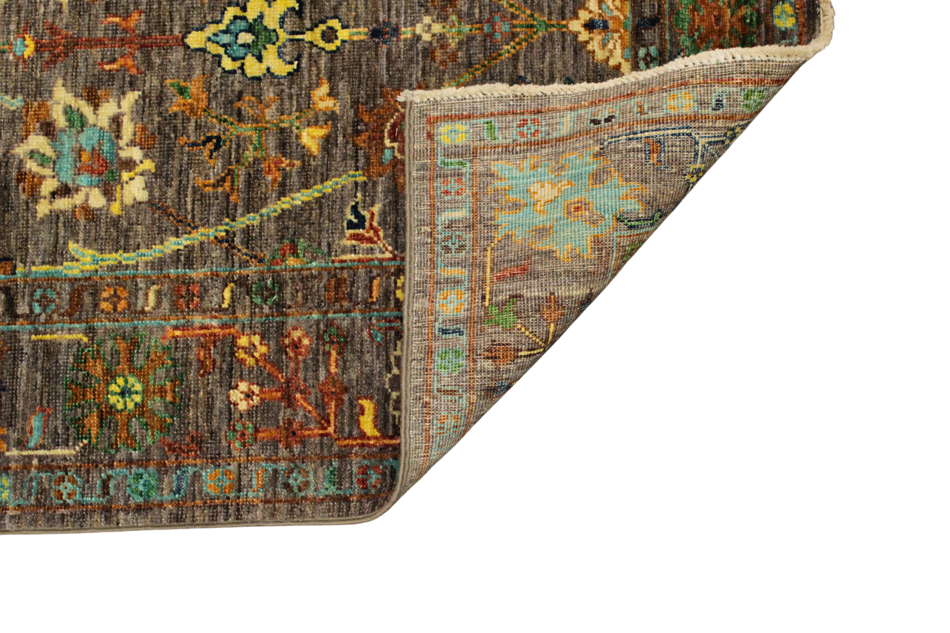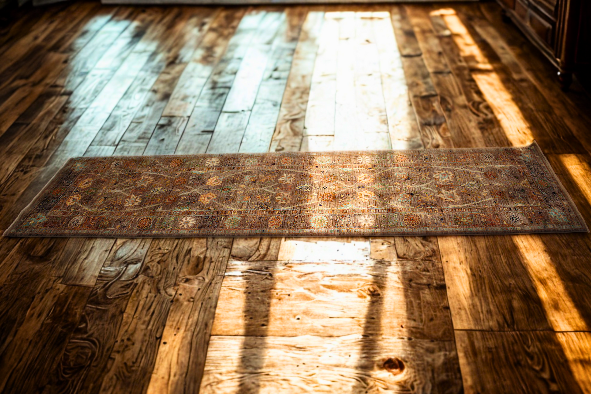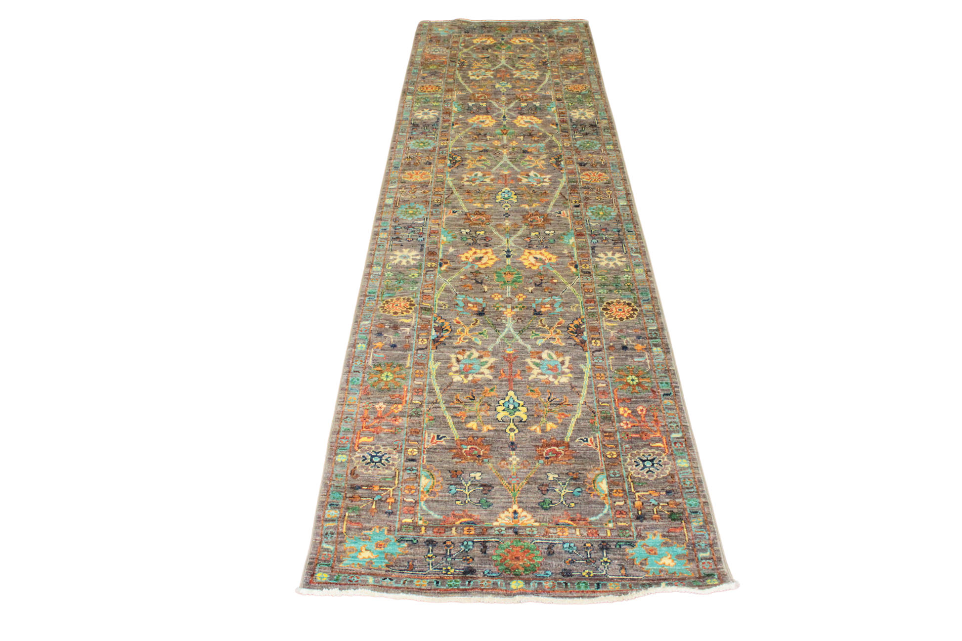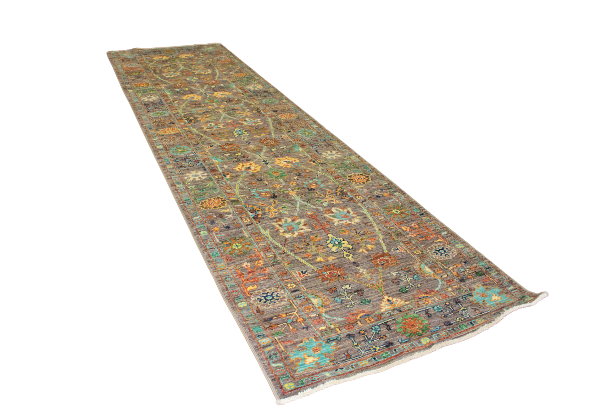 A deep, mysterious palette sets this Afghan Tabriz runner apart, evoking the atmosphere of an enchanted garden at dusk. The charcoal ground is brought to life with soft teal, goldenrod, ivory, and coral blooms, elegantly woven into a repeating mirrored layout that feels both structured and romantic.