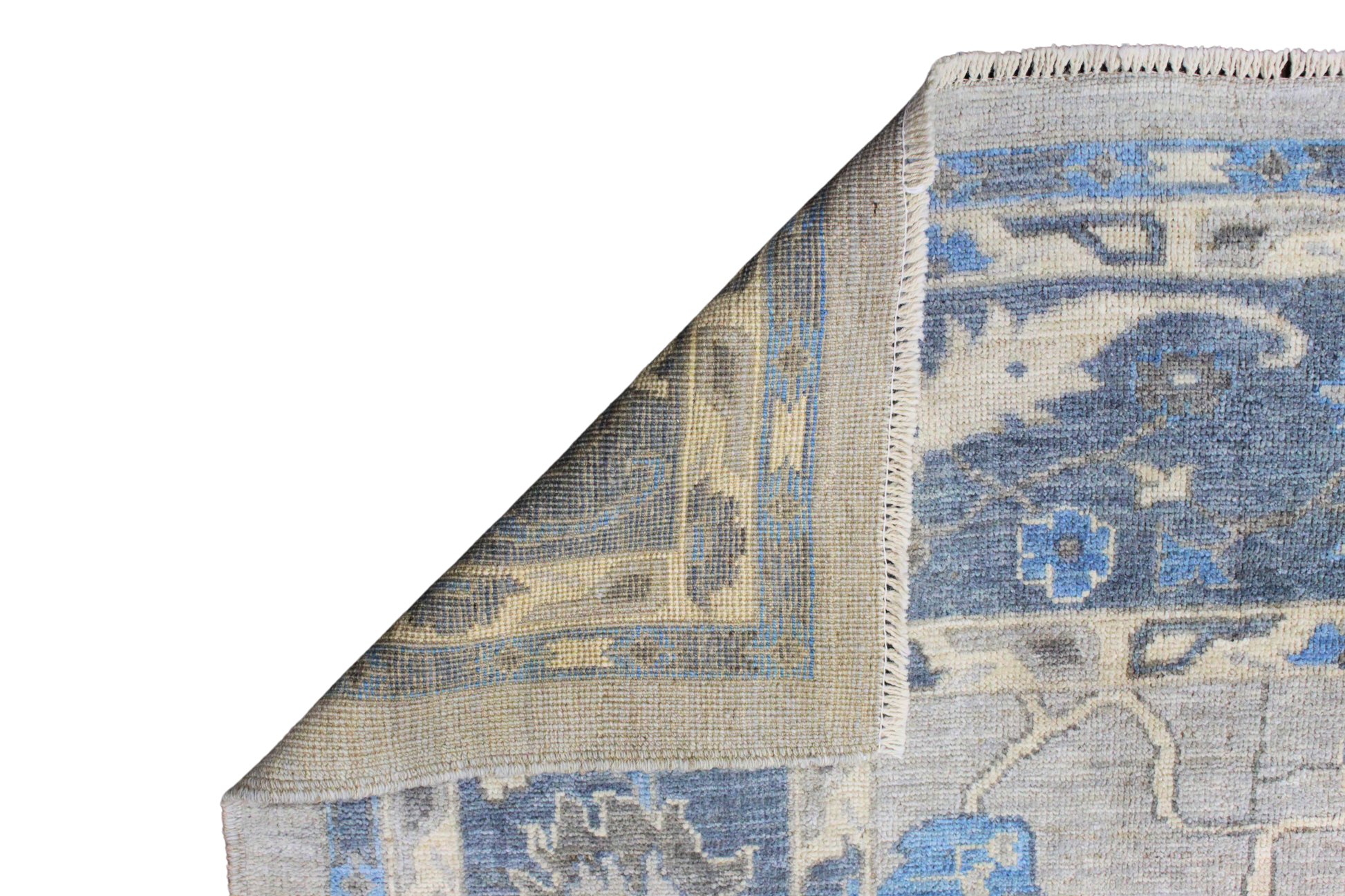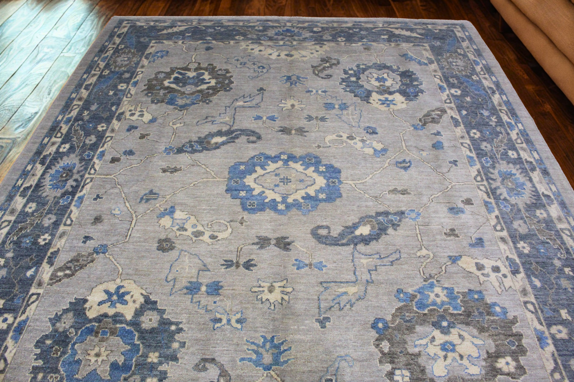 Cool, serene, and richly detailed — this Afghan Oushak rug (8.11 × 11.5 ft) brings an air of quiet elegance into any living space. Its soft, silvery gray field acts as a peaceful backdrop for the floral medallions and vine motifs rendered in layered tones of denim blue, midnight navy, ivory, and charcoal. The overall palette is cool and understated, with just enough contrast to give depth without overwhelming the eye.