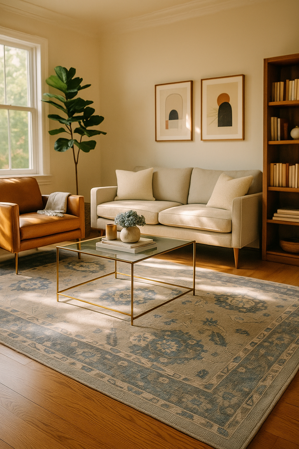 Woven with a traditional Oushak pattern adapted through Afghan craftsmanship, the rug balances old-world sophistication with a contemporary softness. The design flows effortlessly from center medallion to border, with stylized flowers and scrolling tendrils arranged in a loose, open format that allows the negative space to breathe — ideal for transitional or modern interiors.