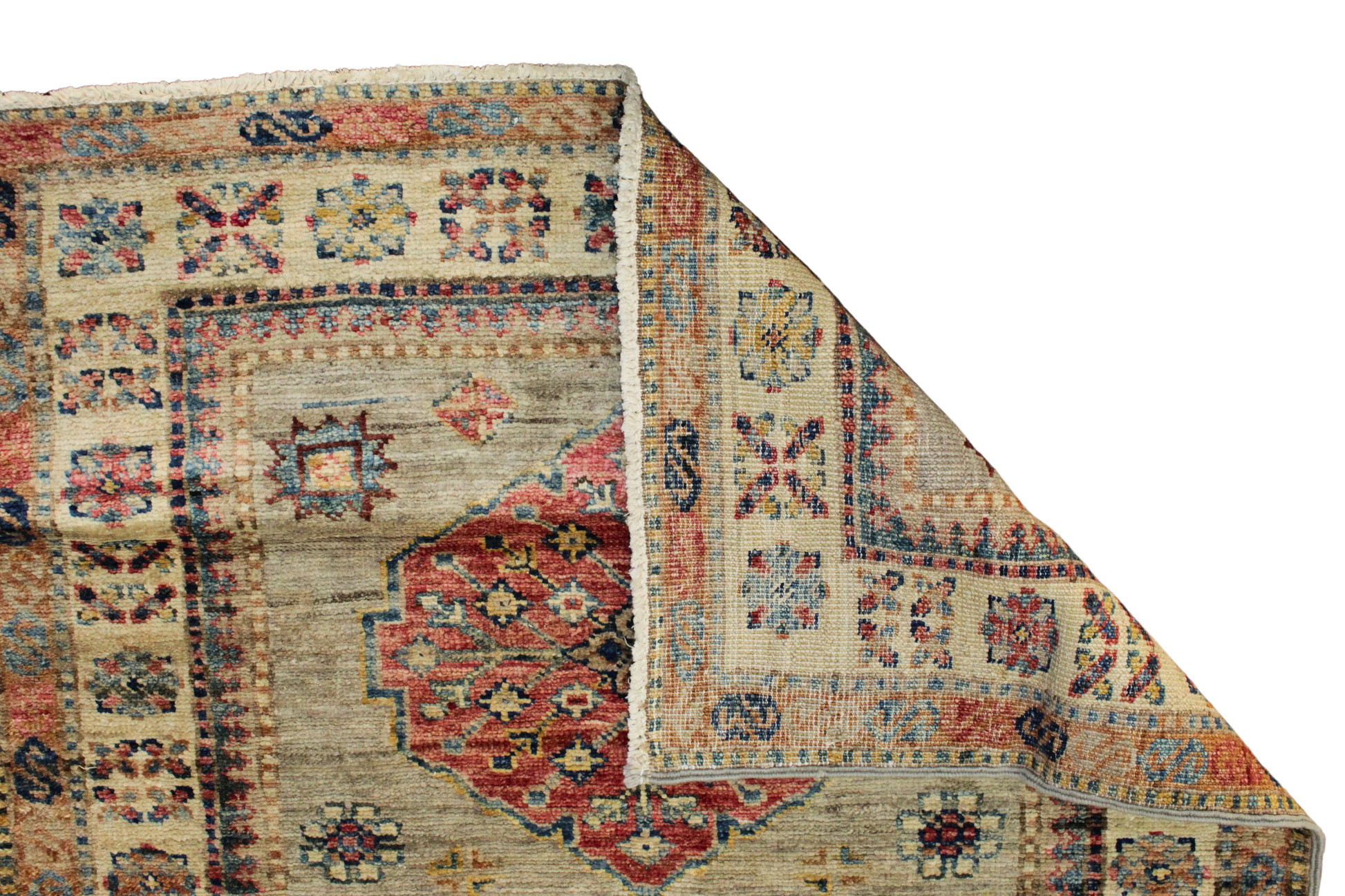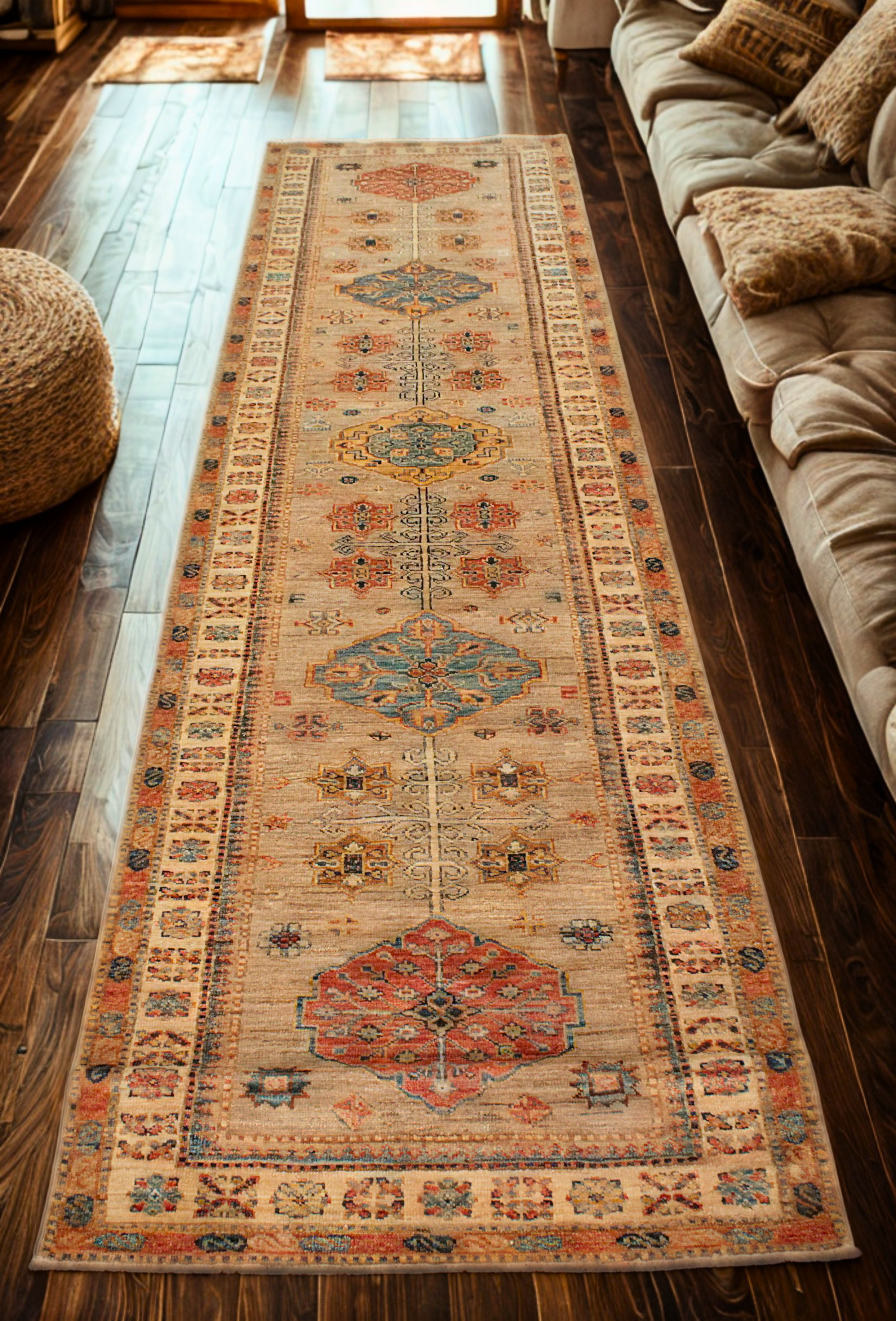 Bold and structured, this Afghan Kazak runner commands attention with its strong geometry and saturated palette. A central vine anchors the composition, linking a series of richly rendered medallions in crimson, indigo, golden wheat, and soft denim. The ivory-toned border features tribal rosettes and ram's horn motifs, echoing the classic Caucasian influence. With its crisp symmetry and confident colorwork, this runner brings strength and character to transitional spaces.
