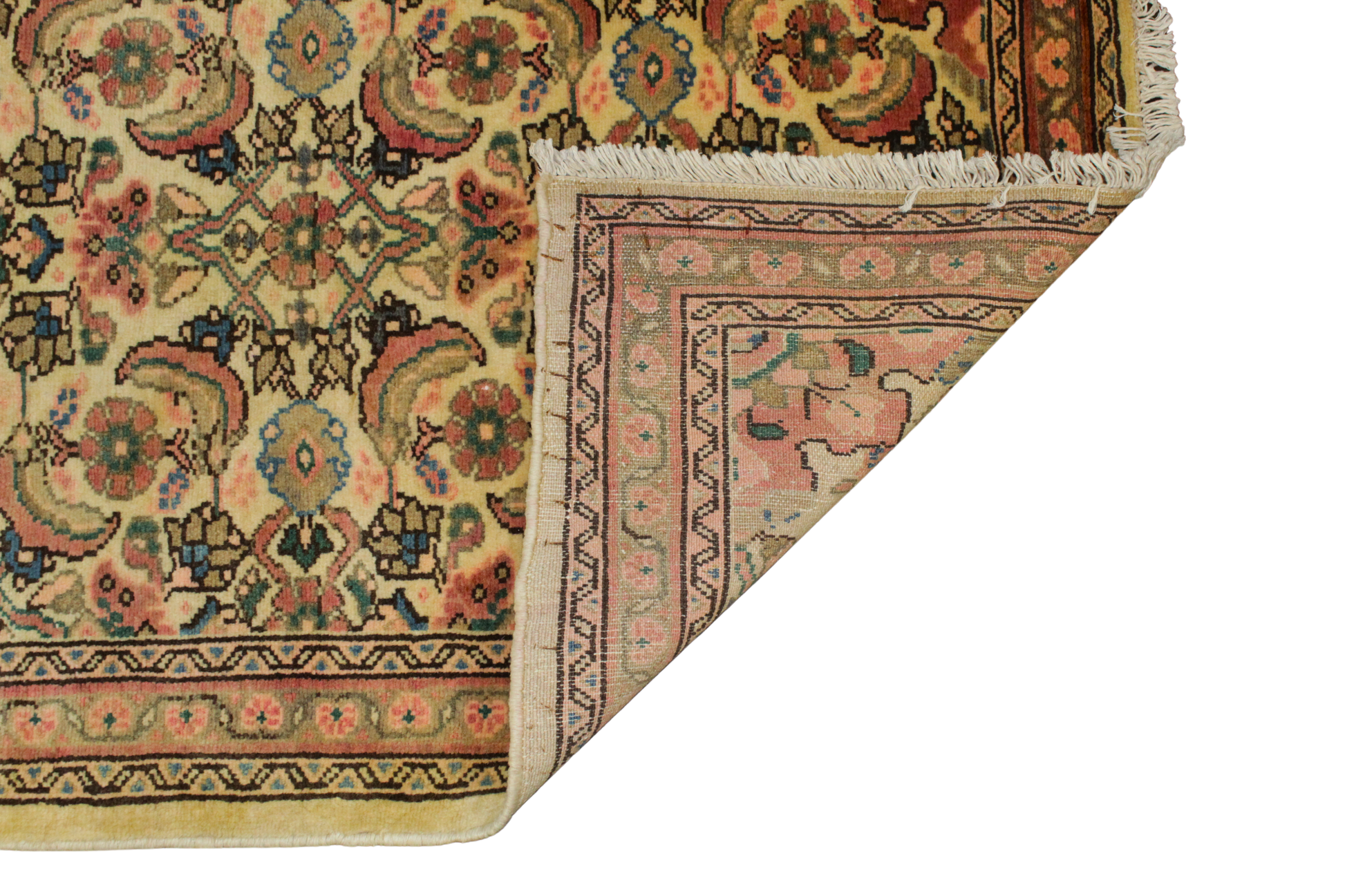 The palette features subtle tans, faded rose, dusty teal, and earthen brown, unified under a gracefully aged patina that speaks to its authenticity. The warm outer border, filled with a series of alternating rosettes and vine motifs, frames the piece with classic Persian balance.