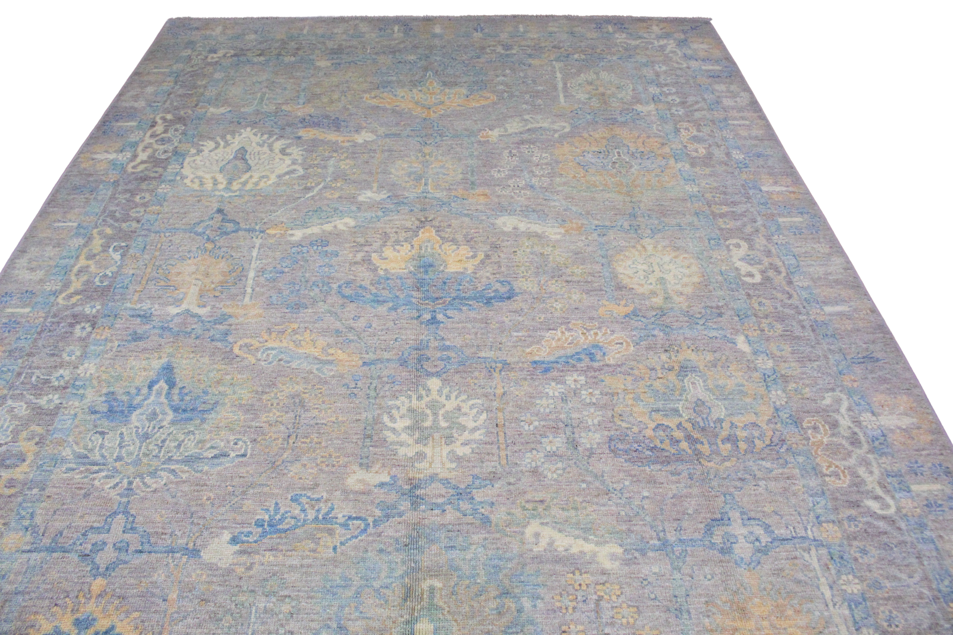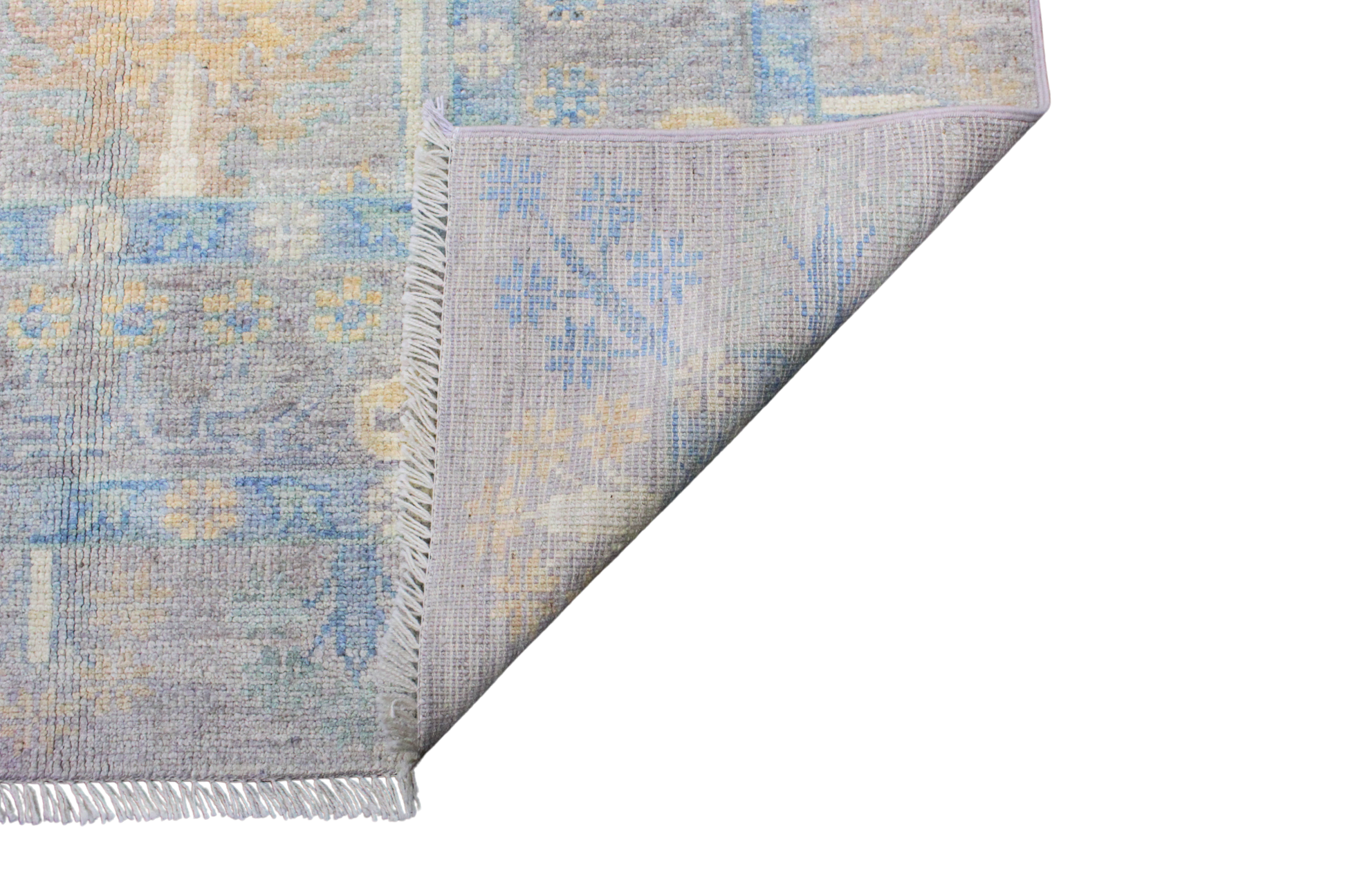 Ethereal and subtly majestic, this hand-knotted Afghan Oushak rug (8.9 × 11.7 ft) evokes the fading light of an early morning sky over a desert landscape. Its delicate palette — a harmonious blend of misty blues, faded gold, soft teal, and weathered sand tones — radiates calm and understated luxury.