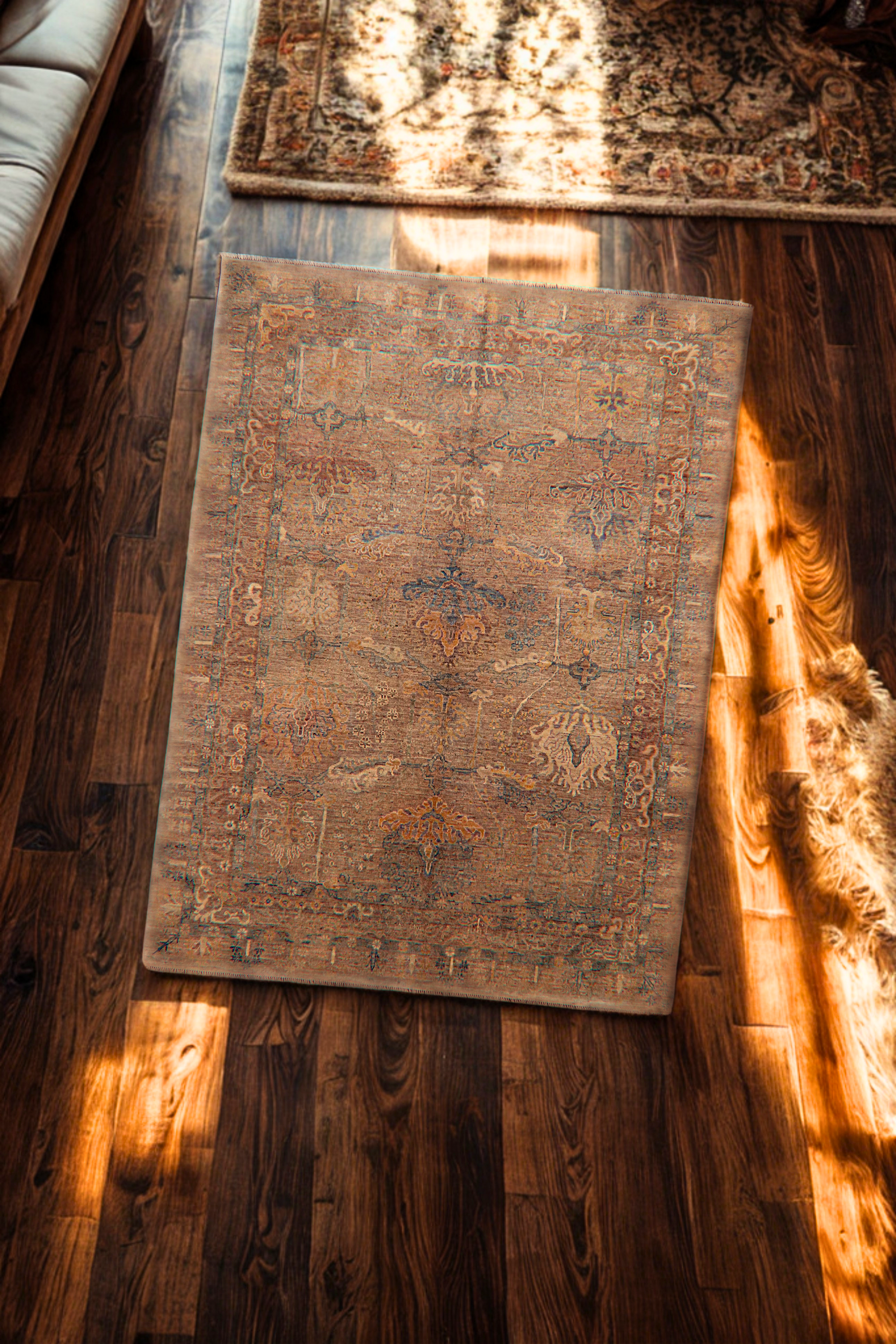 The central field features stylized botanical motifs, loosely arranged in a time-worn, open layout that lets the design breathe. Paired with a wide, decorative border rich in floral scrollwork, the rug delivers timeless Oushak charm with a faded, antique look — ideal for modern, coastal, or transitional interiors that favor quiet beauty over bold color.