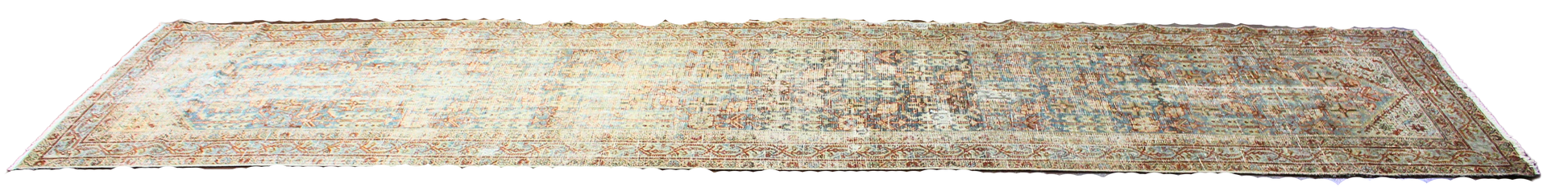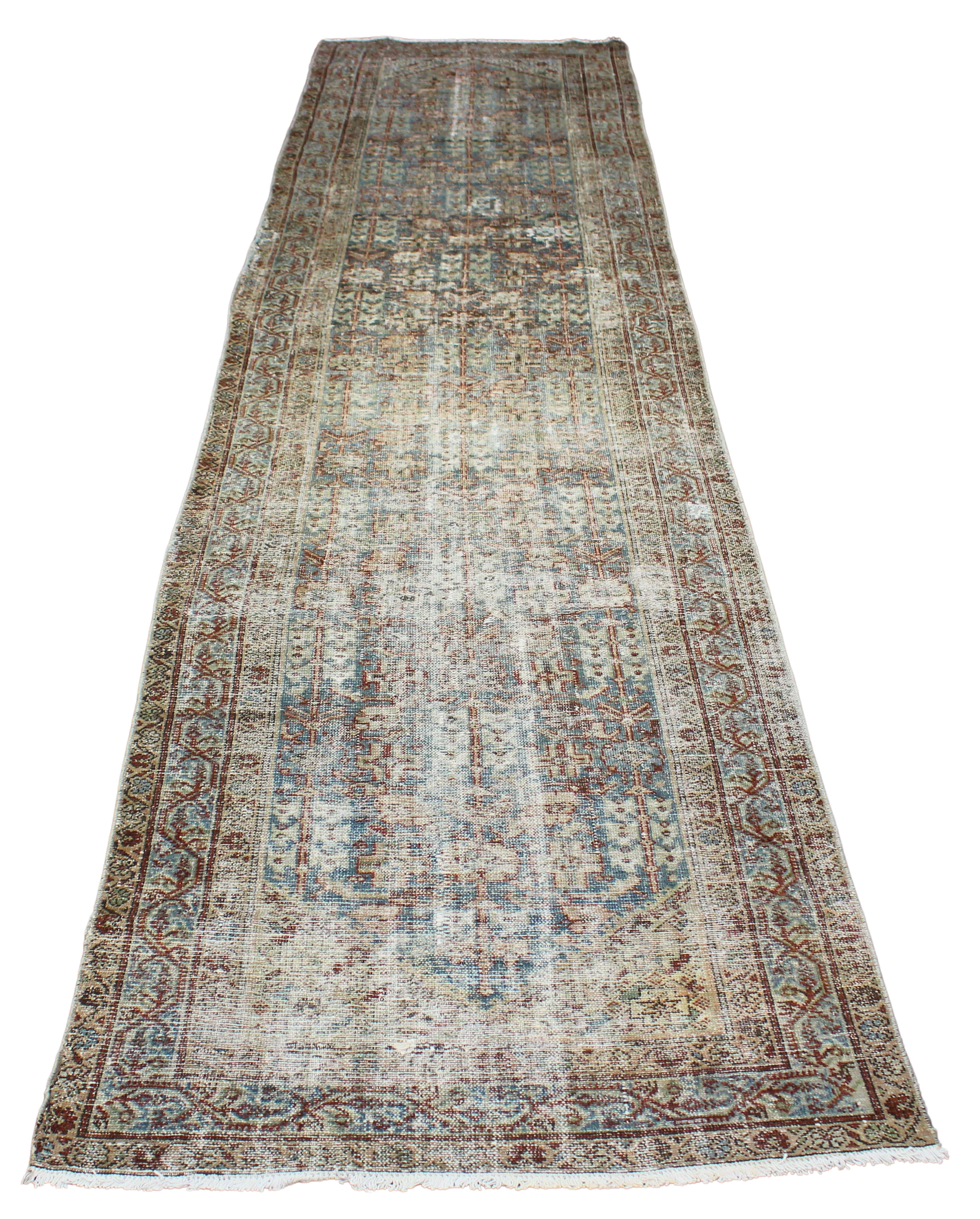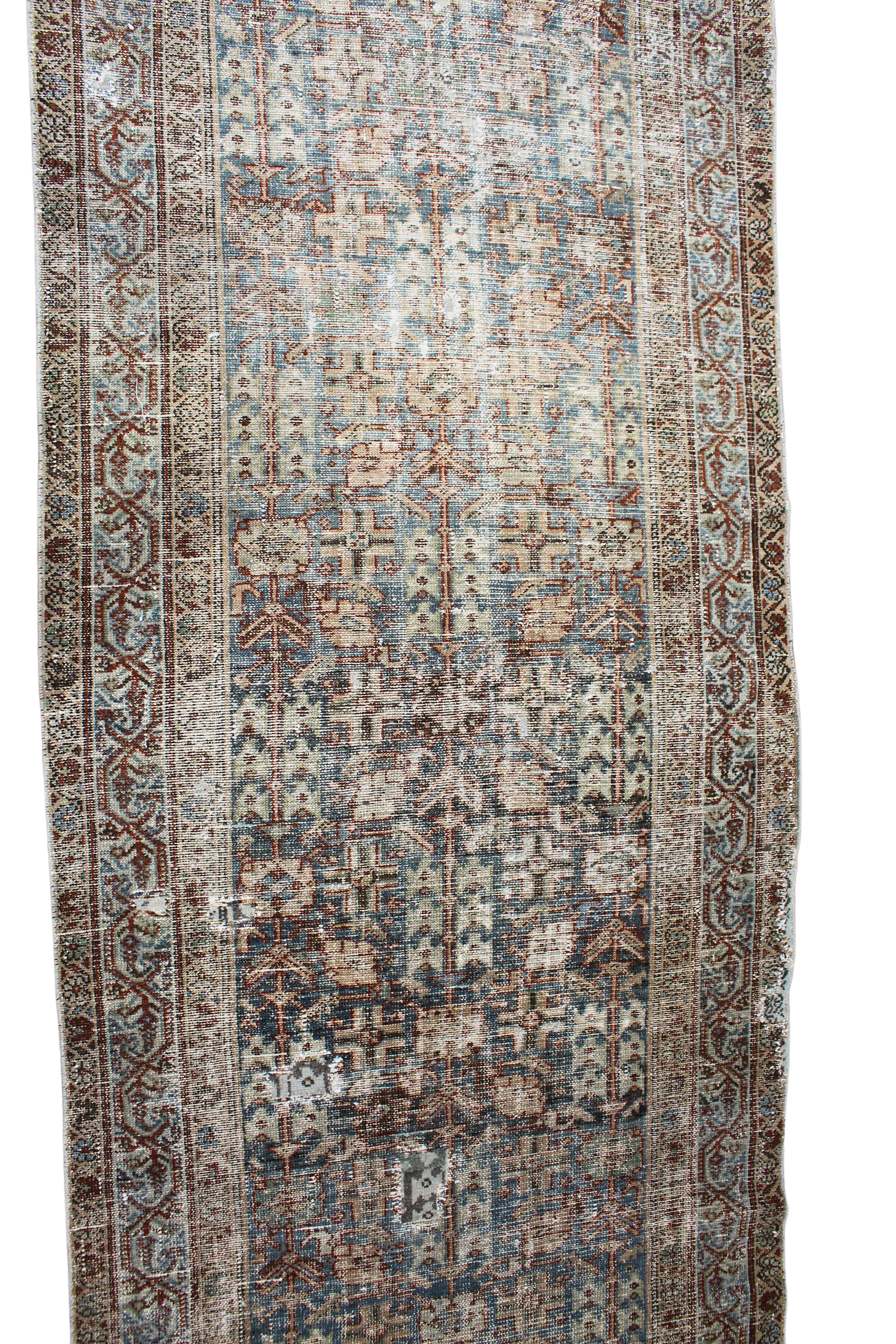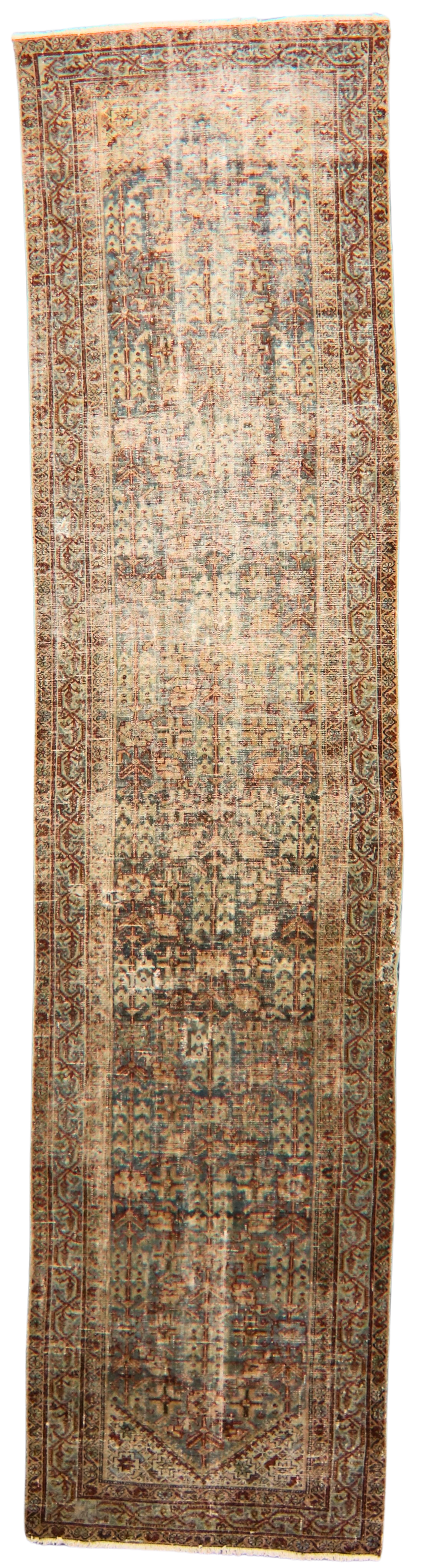 Softly faded and soulfully aged, this antique Malayer runner from persian (3.4 × 12.7 ft) carries the quiet dignity of a well-traveled heirloom. The once richly colored field has gently mellowed into a misty palette of cool greys, seafoam greens, and antique browns — a signature patina that can only be achieved through a century of natural aging.