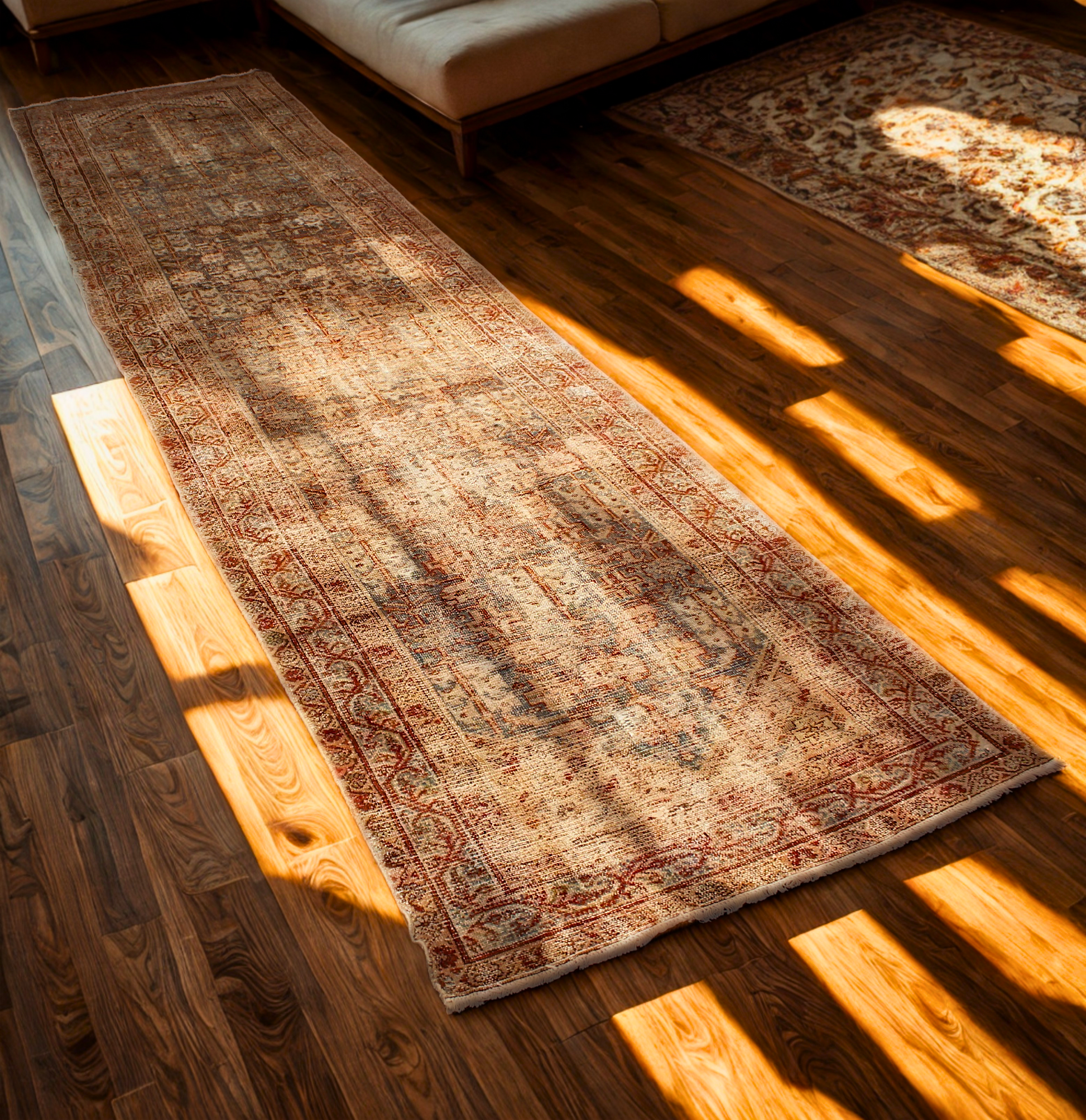 Perfect for interiors that celebrate antique character and subdued beauty, this runner’s worn aesthetic blends effortlessly into neutral or rustic-modern spaces, where texture and authenticity speak louder than color.
