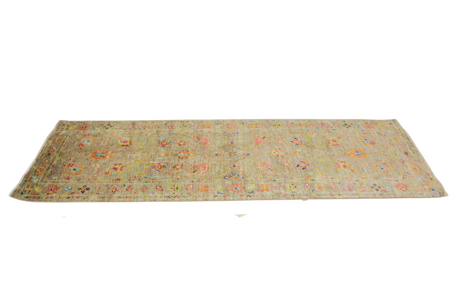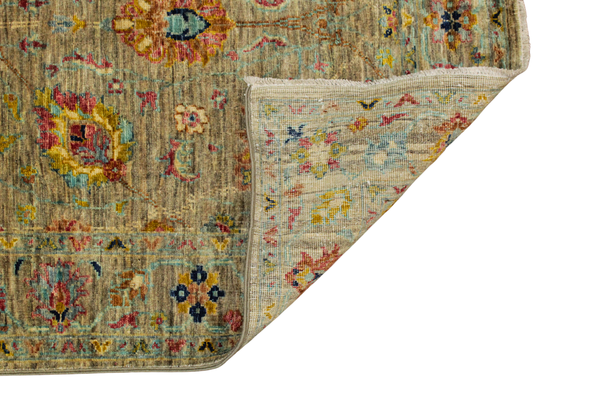 Rich in color and finely detailed, this Afghan Tabriz runner features a warm olive-toned field adorned with intricate floral sprays, rosettes, and curling vines in tones of ruby, gold, soft aqua, and midnight blue. The design is both refined and abundant, with a layered, painterly quality that reflects the Persian Tabriz tradition. Its lush palette and tight weave make it a statement piece that bridges classic and contemporary interiors with ease.