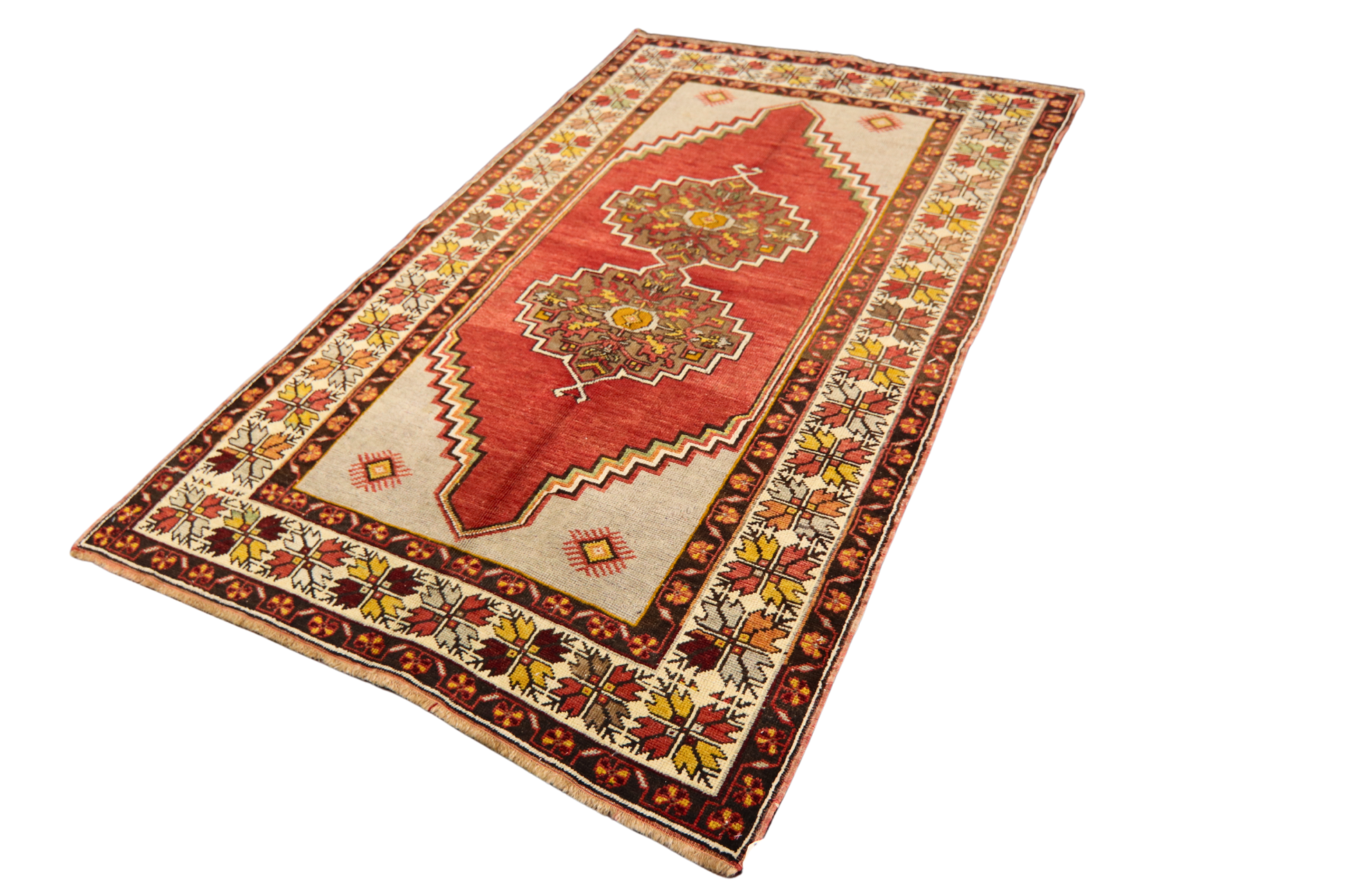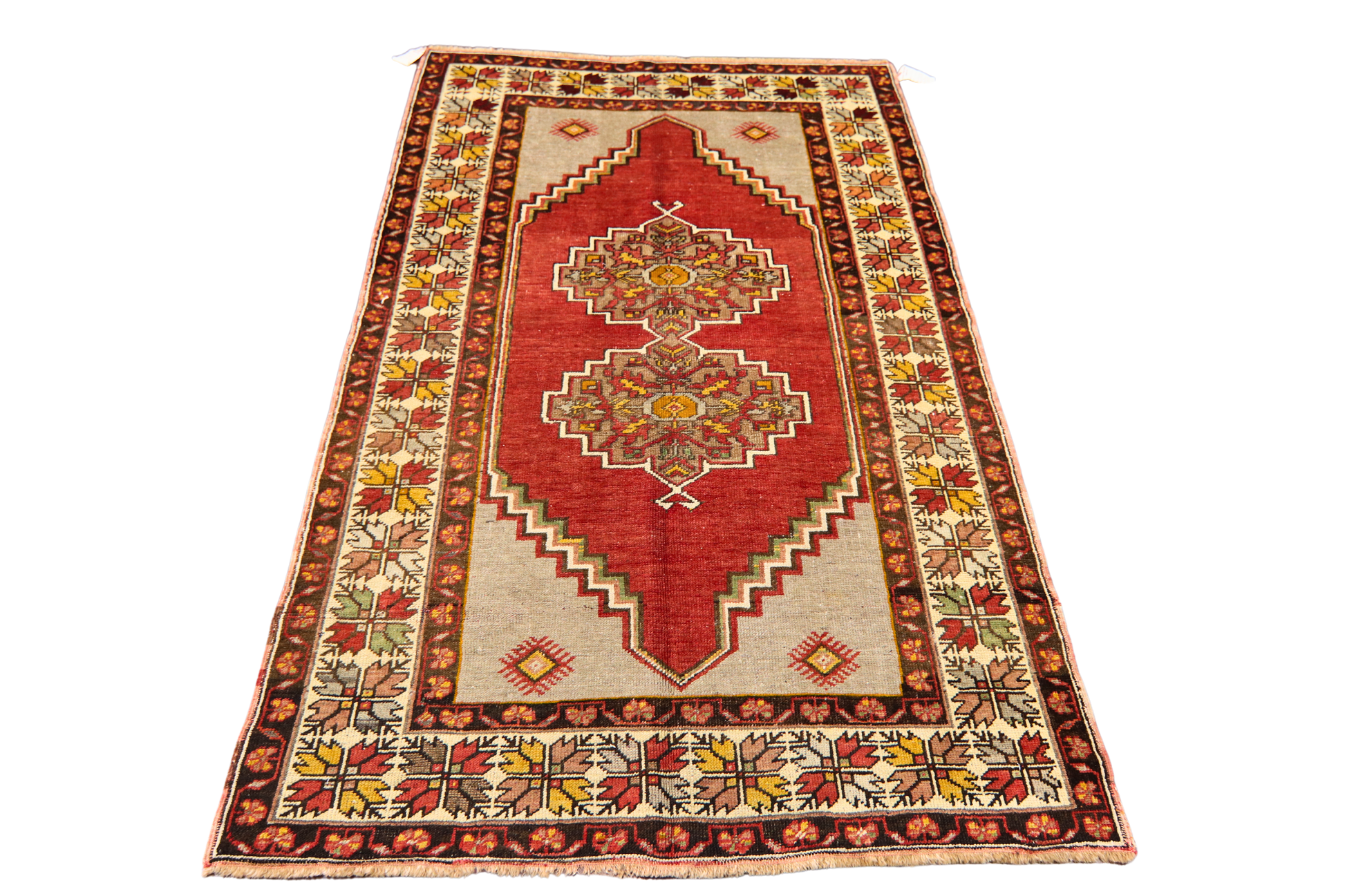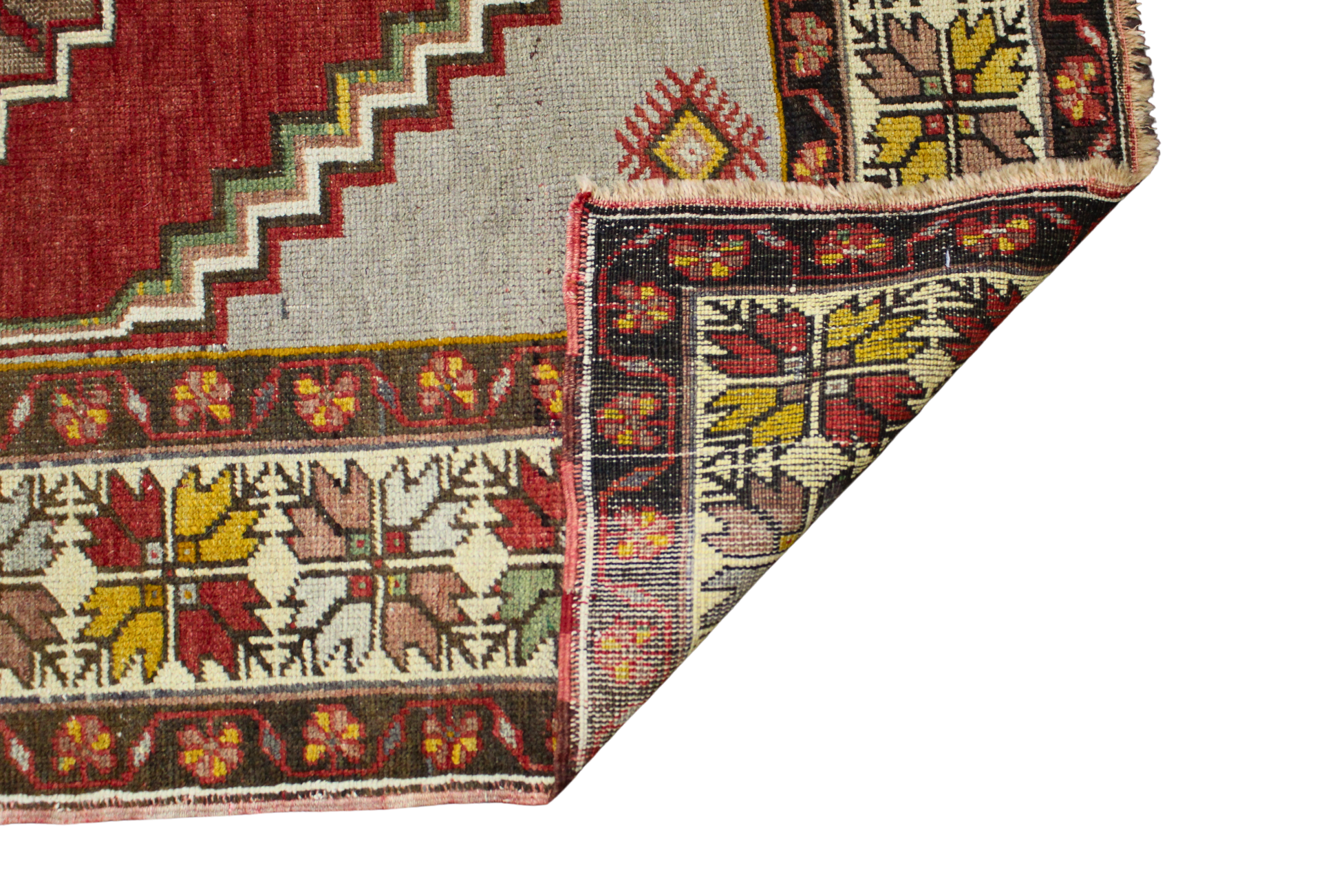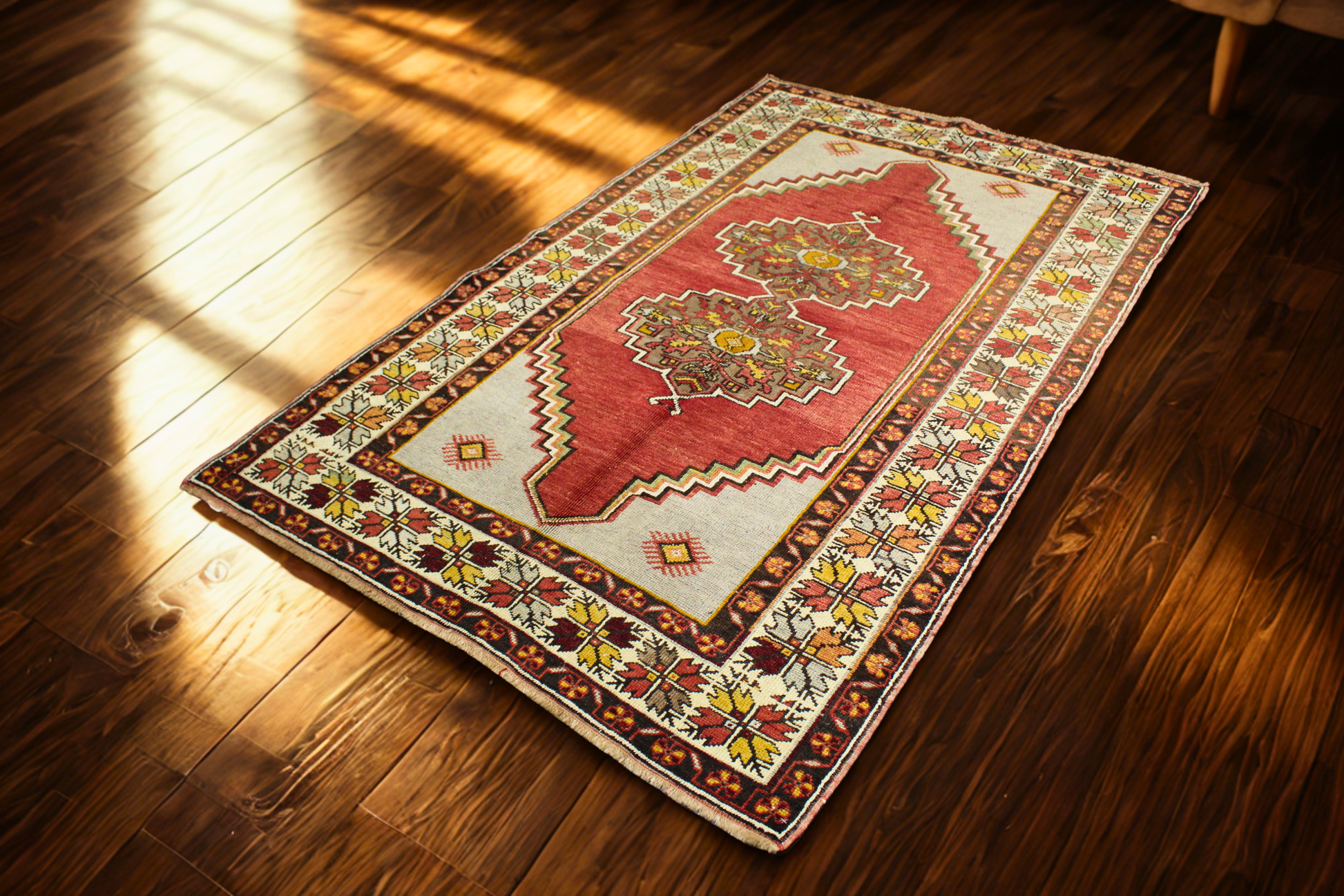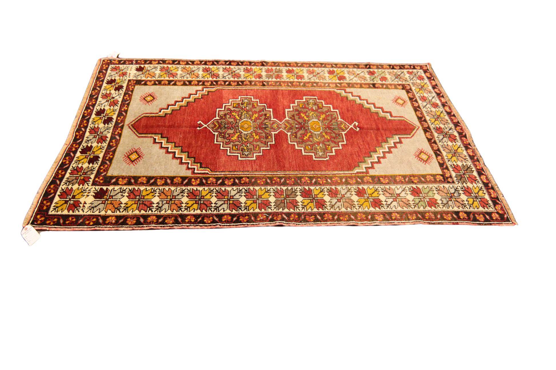 This antique Oushak runner from Turkey (2.11 × 6.5 ft) brings a bold and lively rhythm to narrow spaces with its geometric twin medallions set against a deep rust-red field. The sharply contoured central design, with angular edges and serrated outlines, is flanked by warm ivory corners and a playful lattice of diamond motifs.