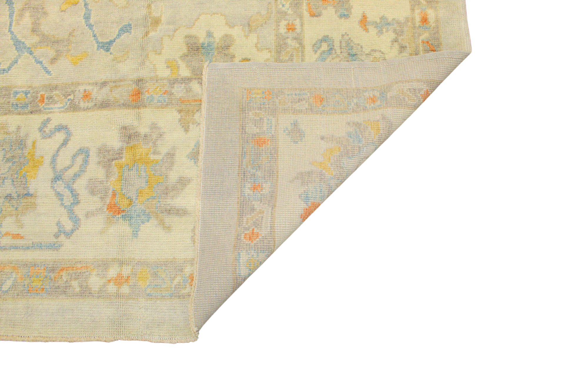 A celebration of balance and vibrancy, this hand-knotted Afghan Oushak rug (9.3 × 13.7 ft) brings a sense of movement and playfulness to a traditional framework. The ivory field is animated with a dense composition of angular vines, stylized blossoms, and lattice-like connections, rendered in golden ochre, soft teal, coral, blue-gray, and rust. The light border offers an airy frame that anchors the intricate field while maintaining visual openness.