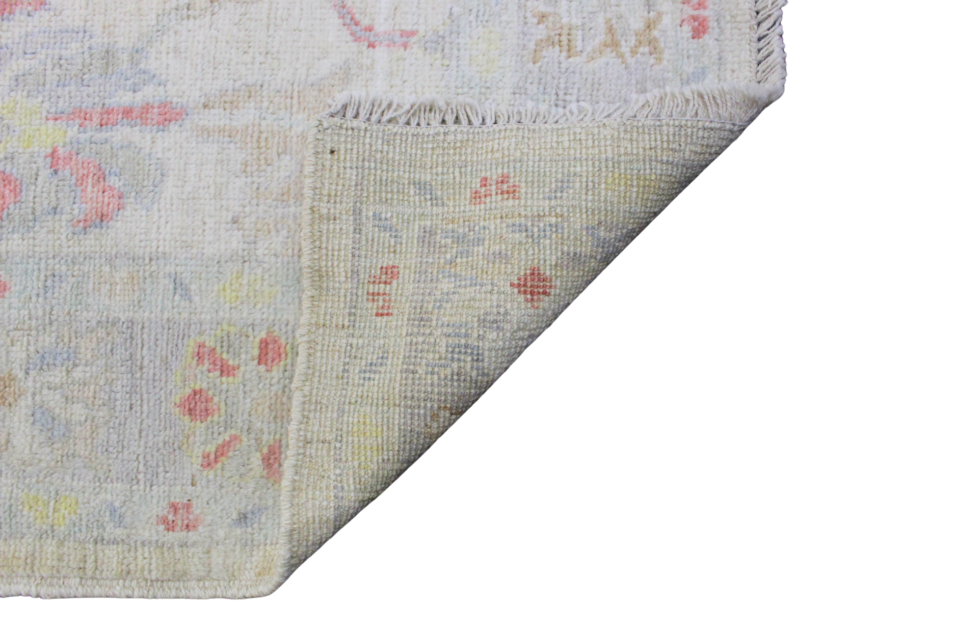 With its airy pastel tones and weathered charm, this hand-knotted Afghan Oushak rug brings a quiet sophistication to any setting. The soft ivory field is gently adorned with stylized floral and medallion motifs in muted shades of blush, sky blue, faded gold, and stone gray. The delicate abrash across the surface lends a sense of graceful age and timeless appeal.