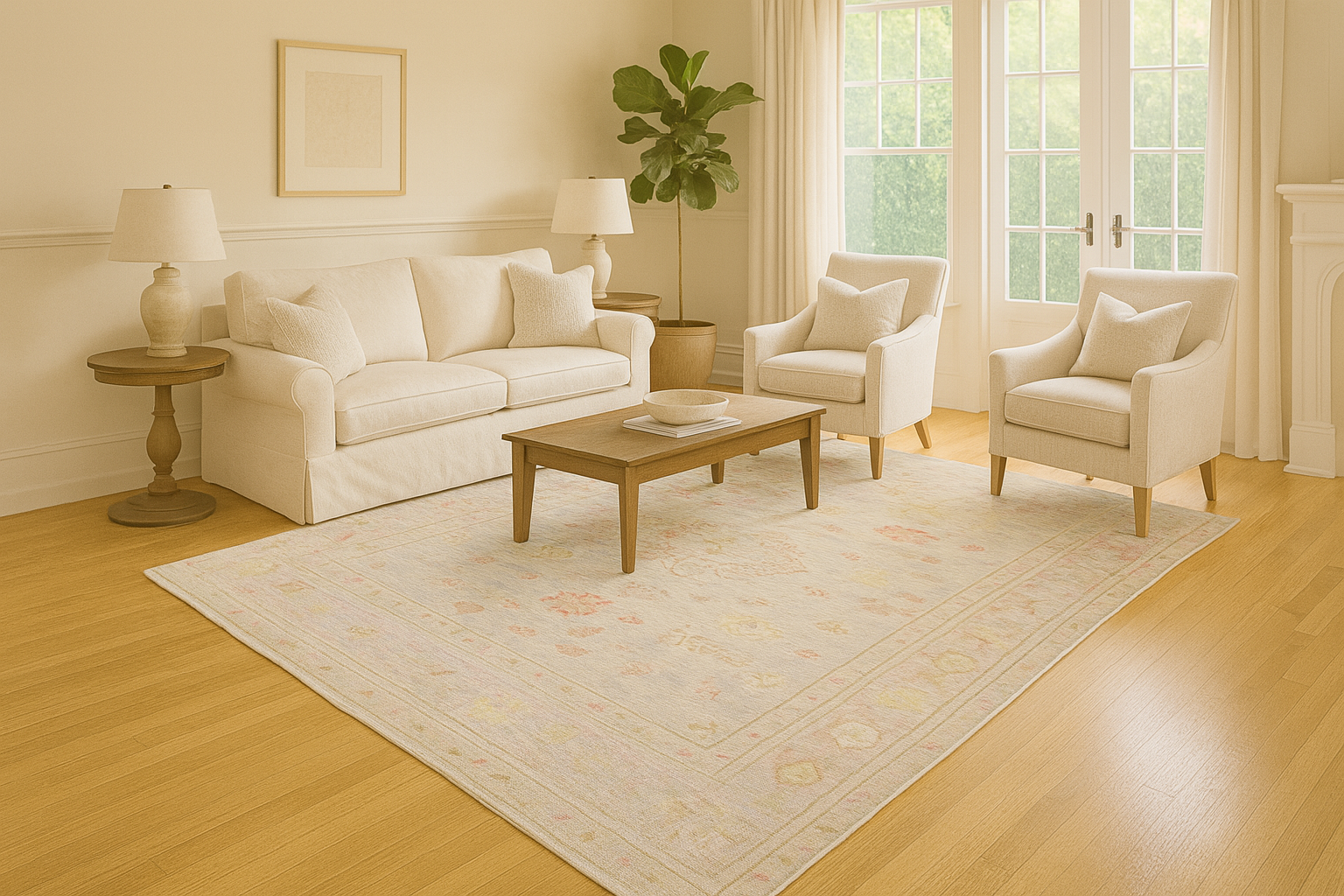 This piece is ideal for softening up an entryway, under a coffee table, or as a cozy layer in a reading nook. Its transitional palette and traditional Oushak geometry make it a versatile addition to both modern and classic interiors.