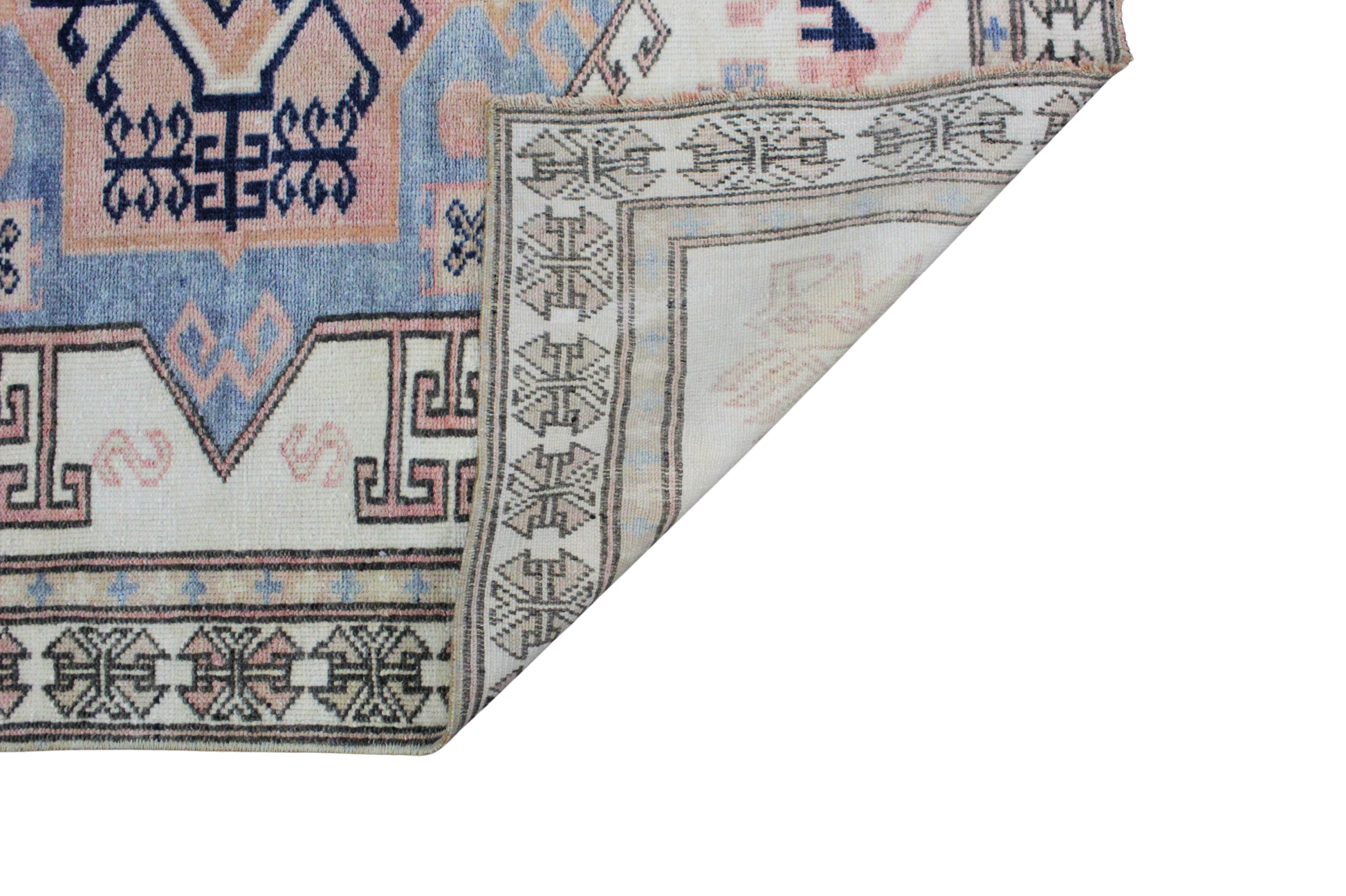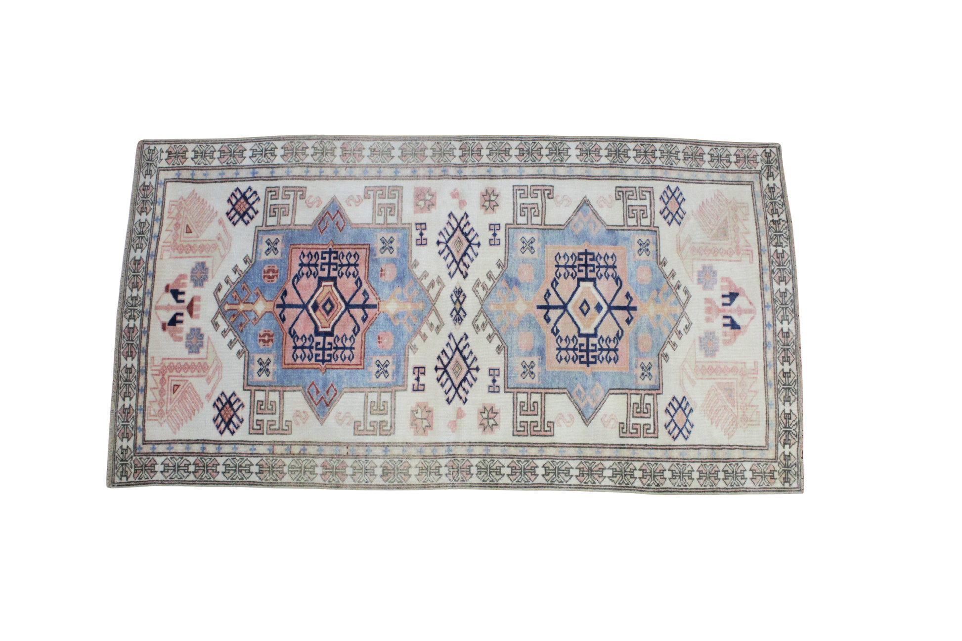 Add a gentle elegance to your home with this charming Oushak runner, handwoven in Turkey. Measuring 2.10 × 5.5, it’s the perfect piece for a hallway, entryway, or even beside a bed. This rug features a delicate balance of blush, ivory, soft sky blue, and hints of navy, arranged in a symmetrical layout of tribal medallions and subtle motifs. The washed-out aesthetic gives it a timeless, lived-in feel — ideal for interiors with a soft, transitional style.