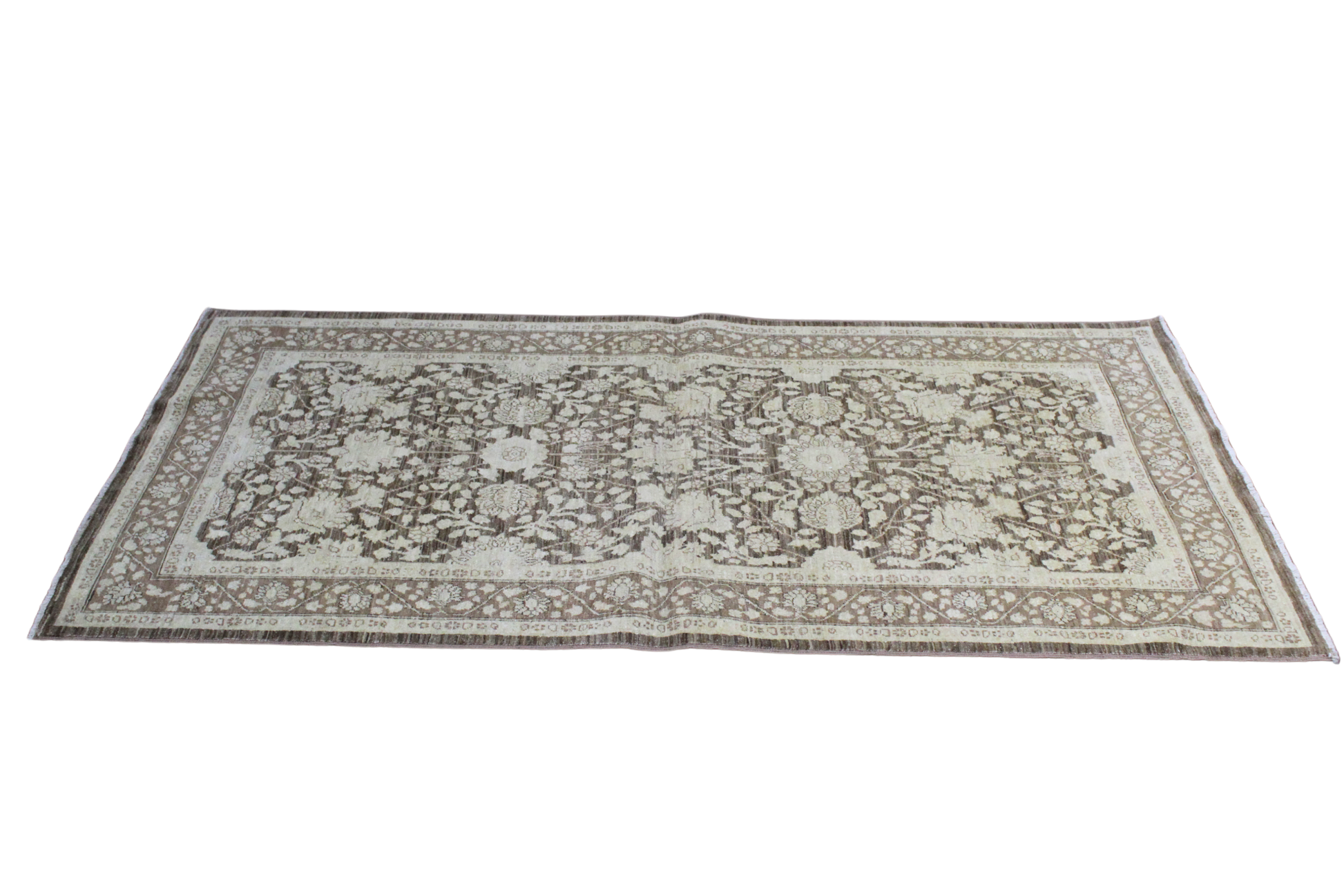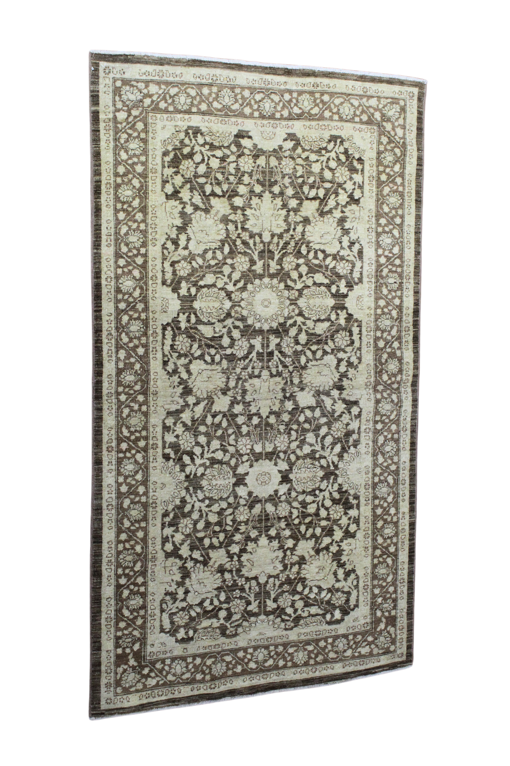 Sized at 3' x 5'4", this hand-knotted Afghan Tabriz rug is a masterclass in precision and classical design. Its finely woven floral pattern radiates outward in mirrored symmetry, with delicate vinework and palmettes rendered in a refined palette of taupe and cream. The detailed border adds visual structure and echoes the motifs within, creating a sense of harmony and elegance.