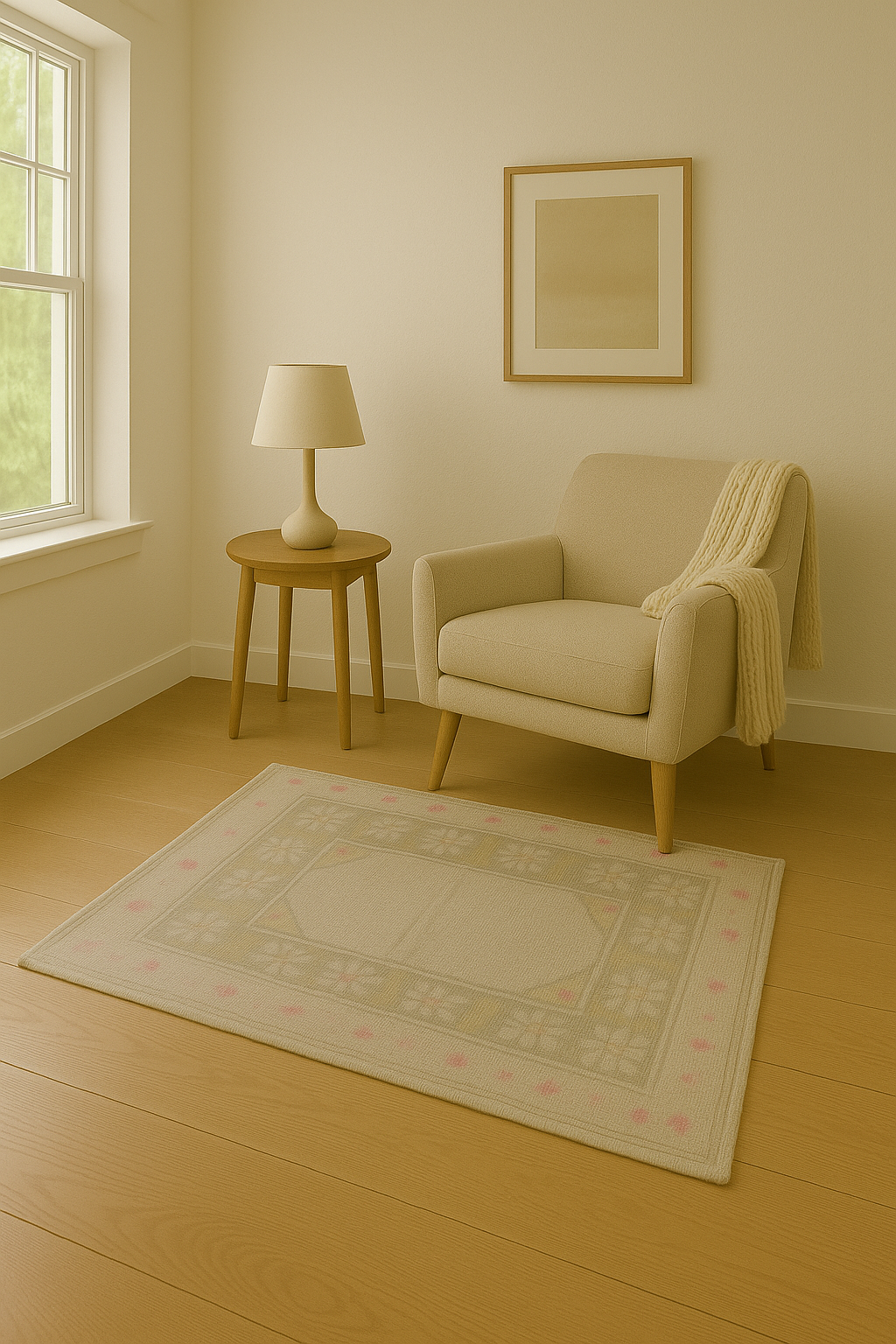 The rug features a serene ivory prayer field, subtly framed by a powdery sage border, punctuated with petal-pink floral motifs that dance gently across the surface. Pale celadon and dusty rose tones speak to the grace of natural aging, giving the rug an ethereal quality that's both feminine and timeless.