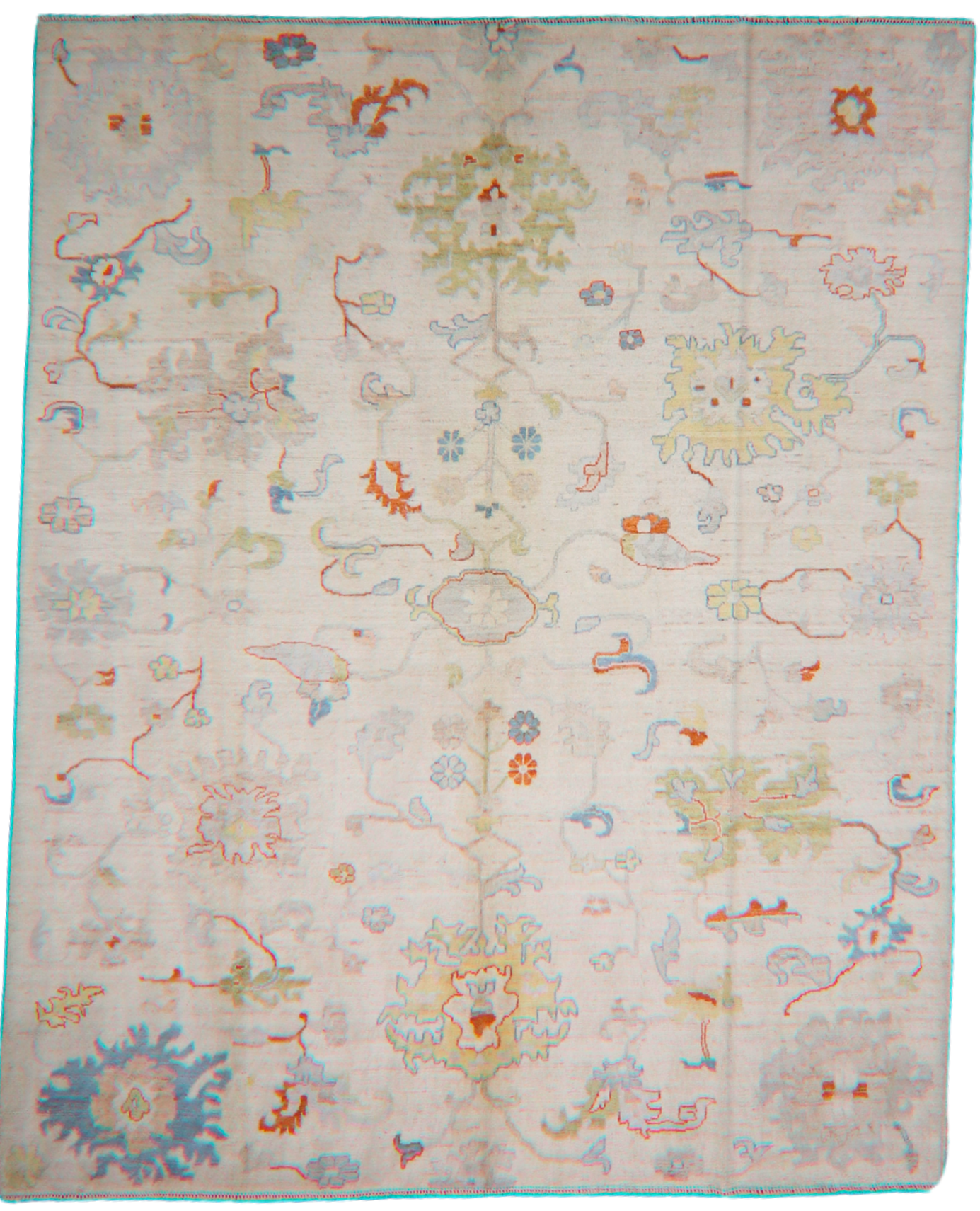 A lighthearted and airy take on traditional Oushak design, this 8 × 10 ft hand-knotted rug from Afghanistan features a whimsical scatter of oversized floral motifs, vines, and stylized palmettes on a soft ivory background. The palette is fresh and uplifting, with touches of celadon green, soft blue, terracotta, and muted coral that lend it a playful yet elegant presence.