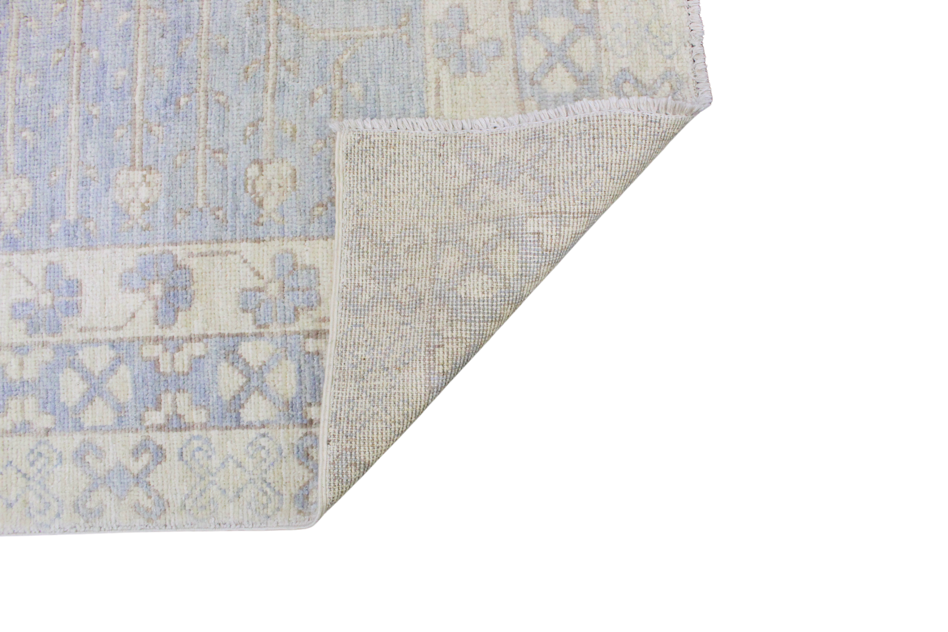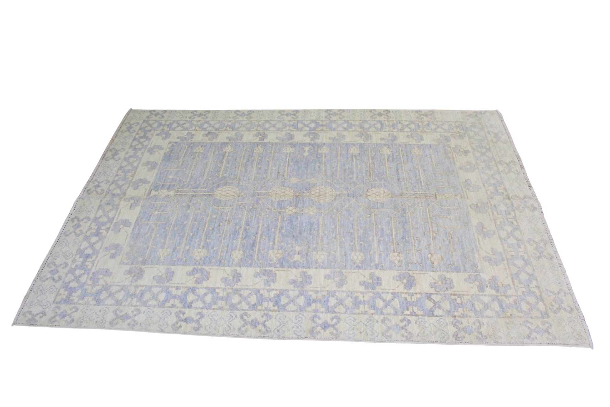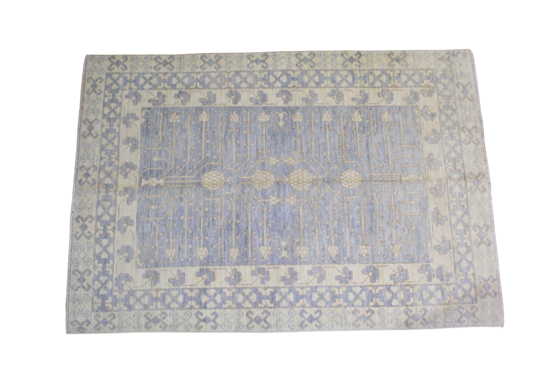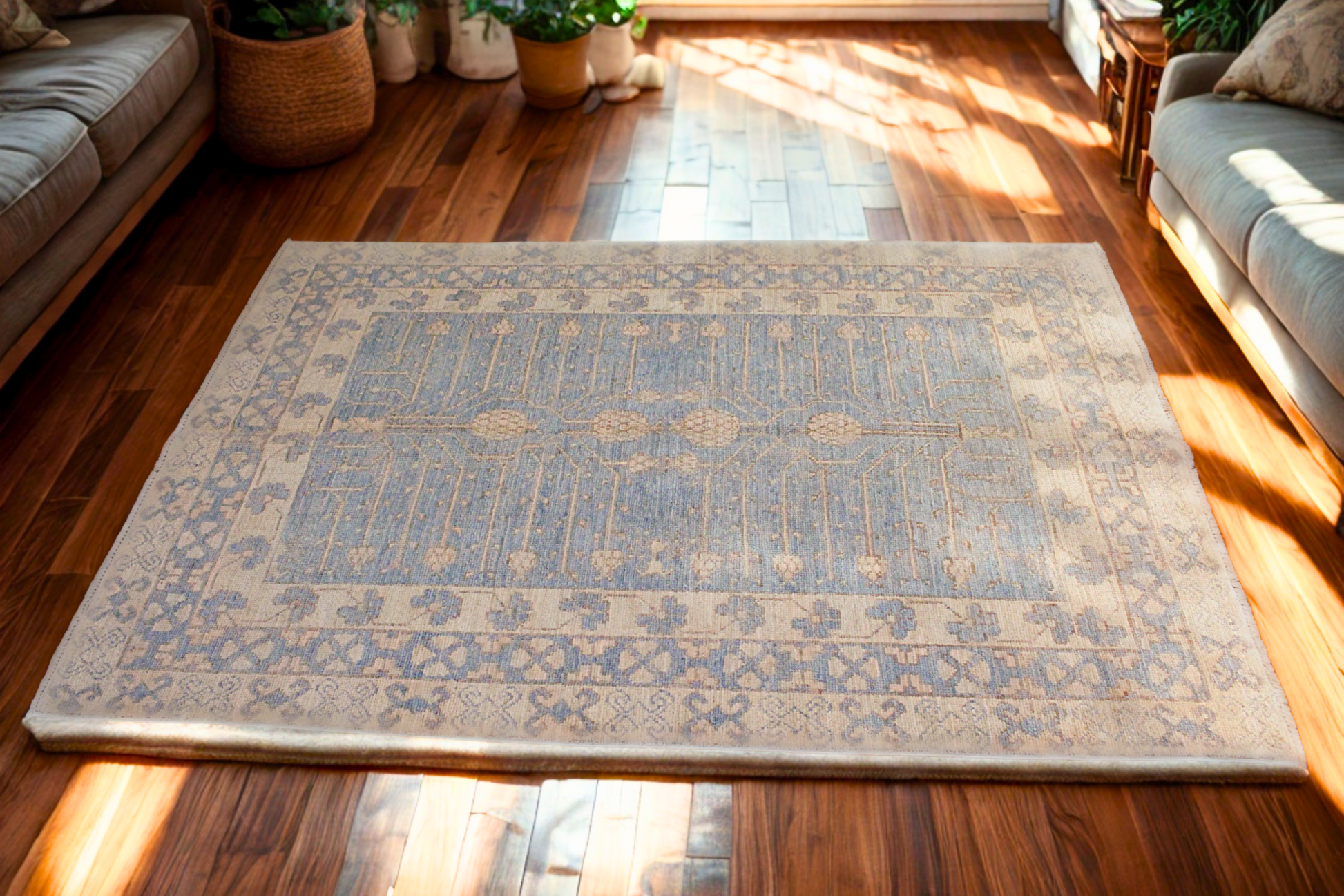 This 4.2 x 5.10 ft Afghan Khotan rug is a masterclass in understated elegance. Hand-knotted with precision, it features a soothing palette of faded denim blue and ivory—ideal for light, neutral interiors or anyone seeking a balance of vintage charm and modern clarity.