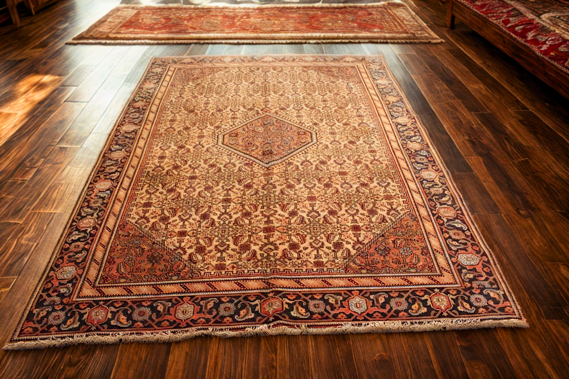 This striking 6.8 × 9.5 ft antique Tabriz rug from Persia showcases masterful craftsmanship and visual rhythm. At the heart lies a sharp medallion in a rich brick-red, set against a dense lattice of repeating boteh motifs and stylized blossoms in ivory, soft gold, and navy. Corner spandrels echo the medallion’s intricate detailing, seamlessly framed by a floral border of scrolling palmettes and vines.