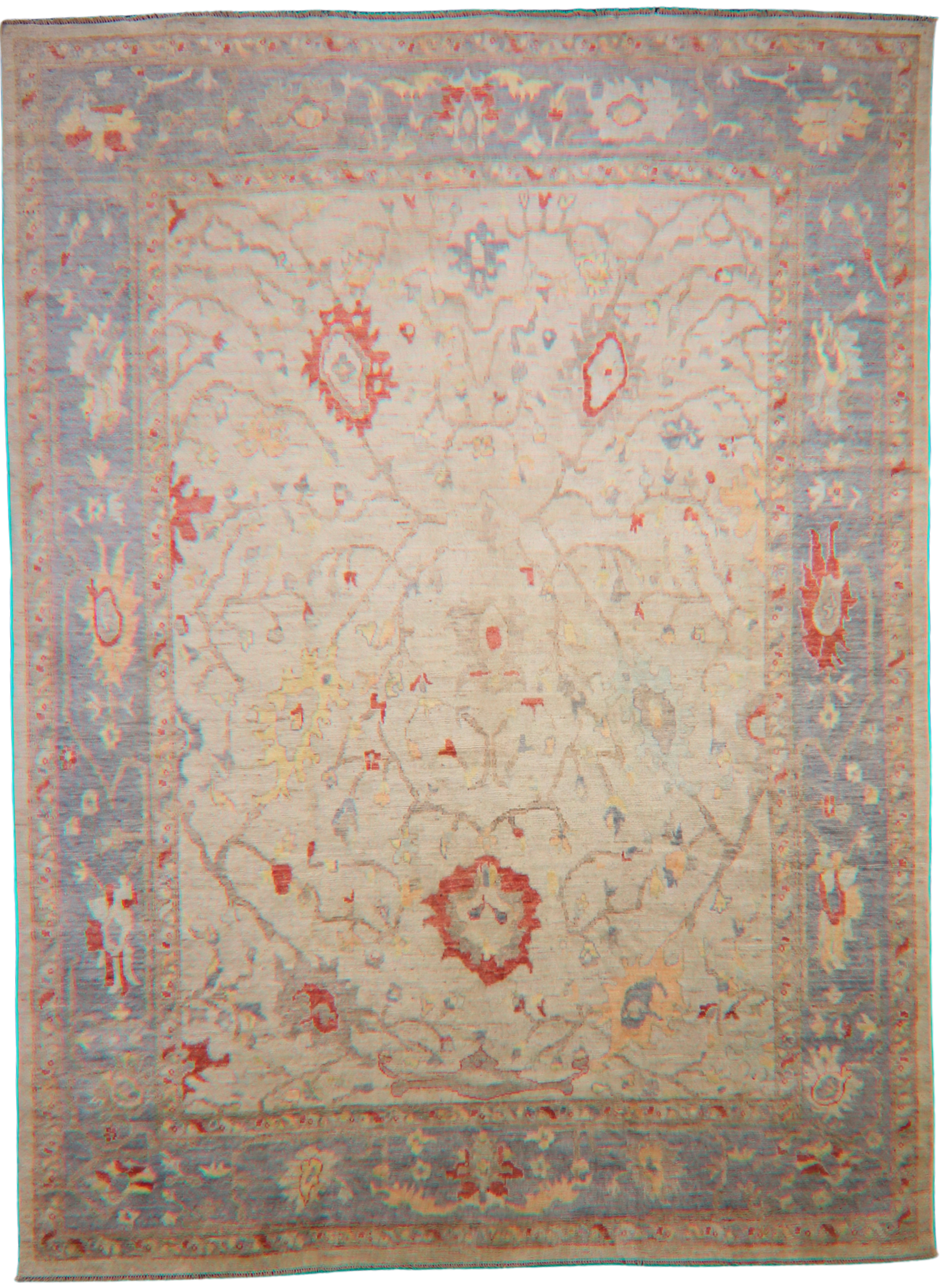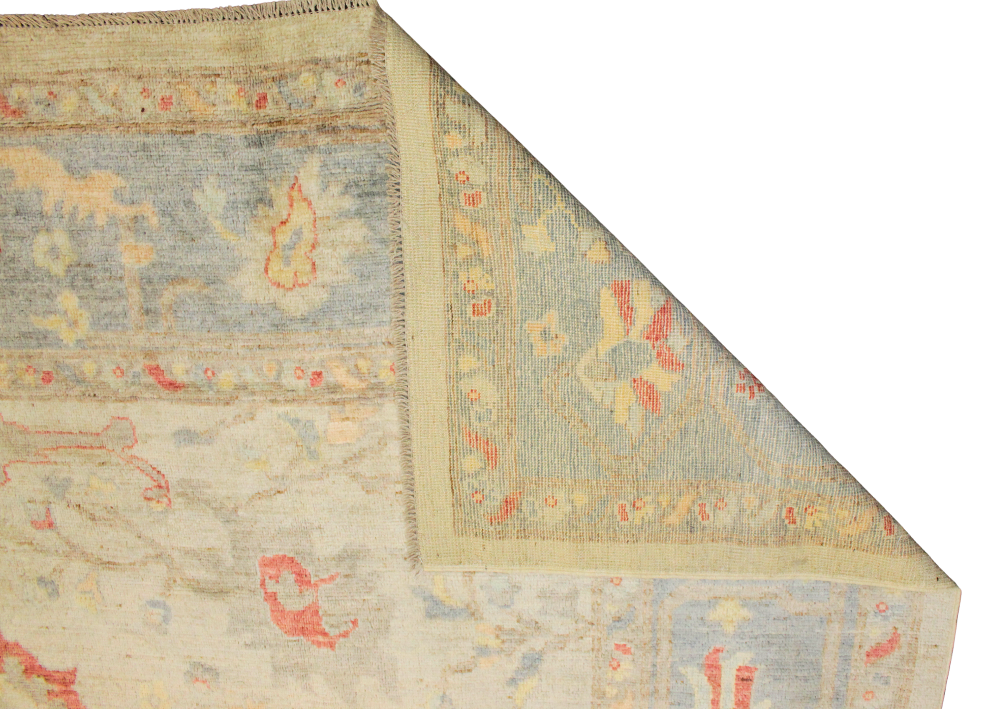 Balancing elegance with bold simplicity, this Afghan Oushak rug (9.9 × 13.3 ft) features a creamy beige field that sets the stage for whimsical, large-scale botanical motifs in blush, coral, sky blue, and soft gold. The cool-toned border provides contrast with its powdery blues and scattered floral medallions, drawing the eye inward. The composition feels open and airy, yet anchored by traditional Turkish symmetry.