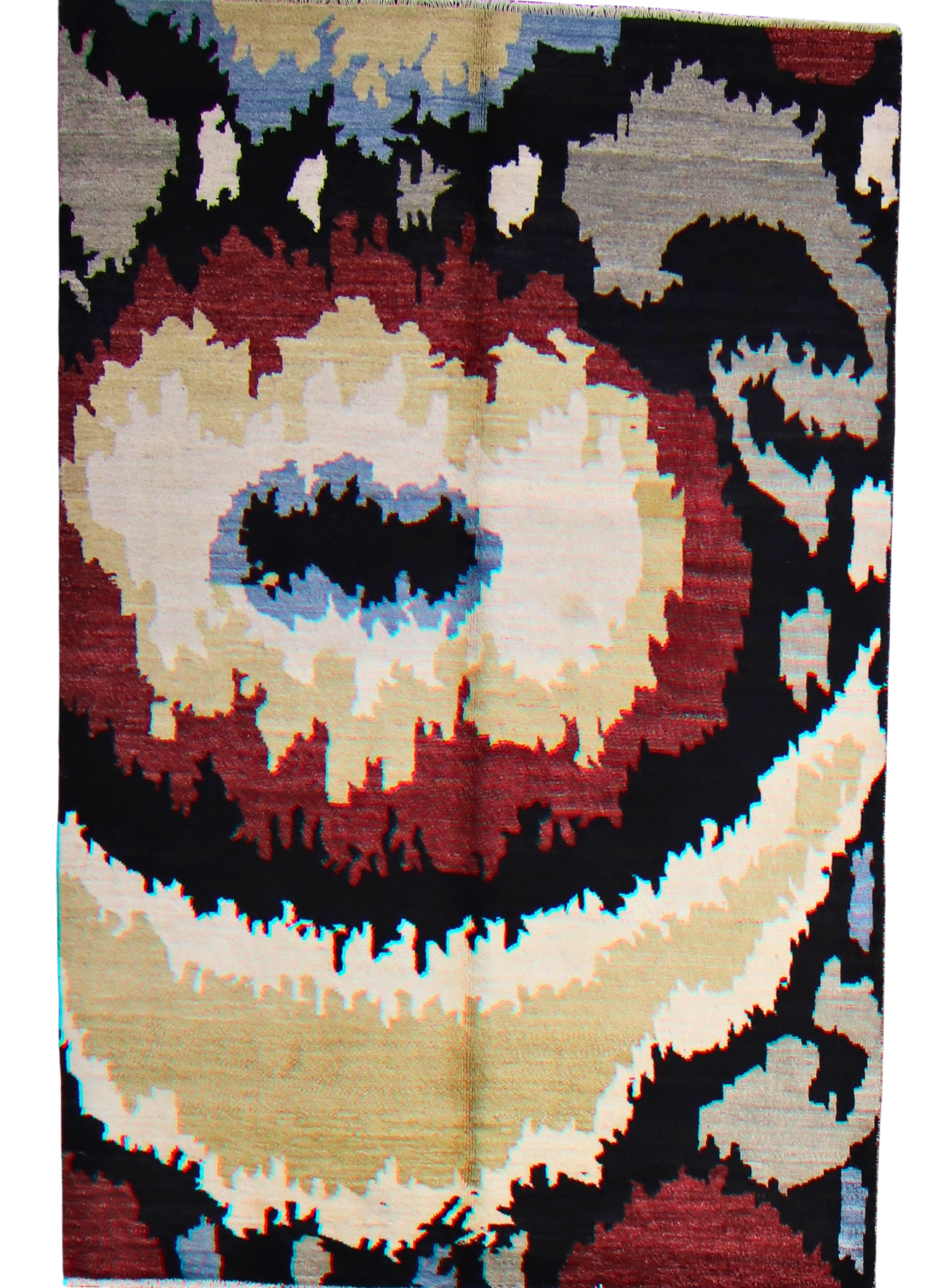 Commanding and contemporary, this Afghan Ikat rug (6.6 × 8.3 ft) makes a dramatic statement with its oversized, abstract floral motif. Inspired by the ancient Ikat dyeing technique, the design features a bold palette of charcoal black, burgundy, parchment beige, icy blue, and ivory, woven into a mesmerizing pattern that radiates energy and rhythm.