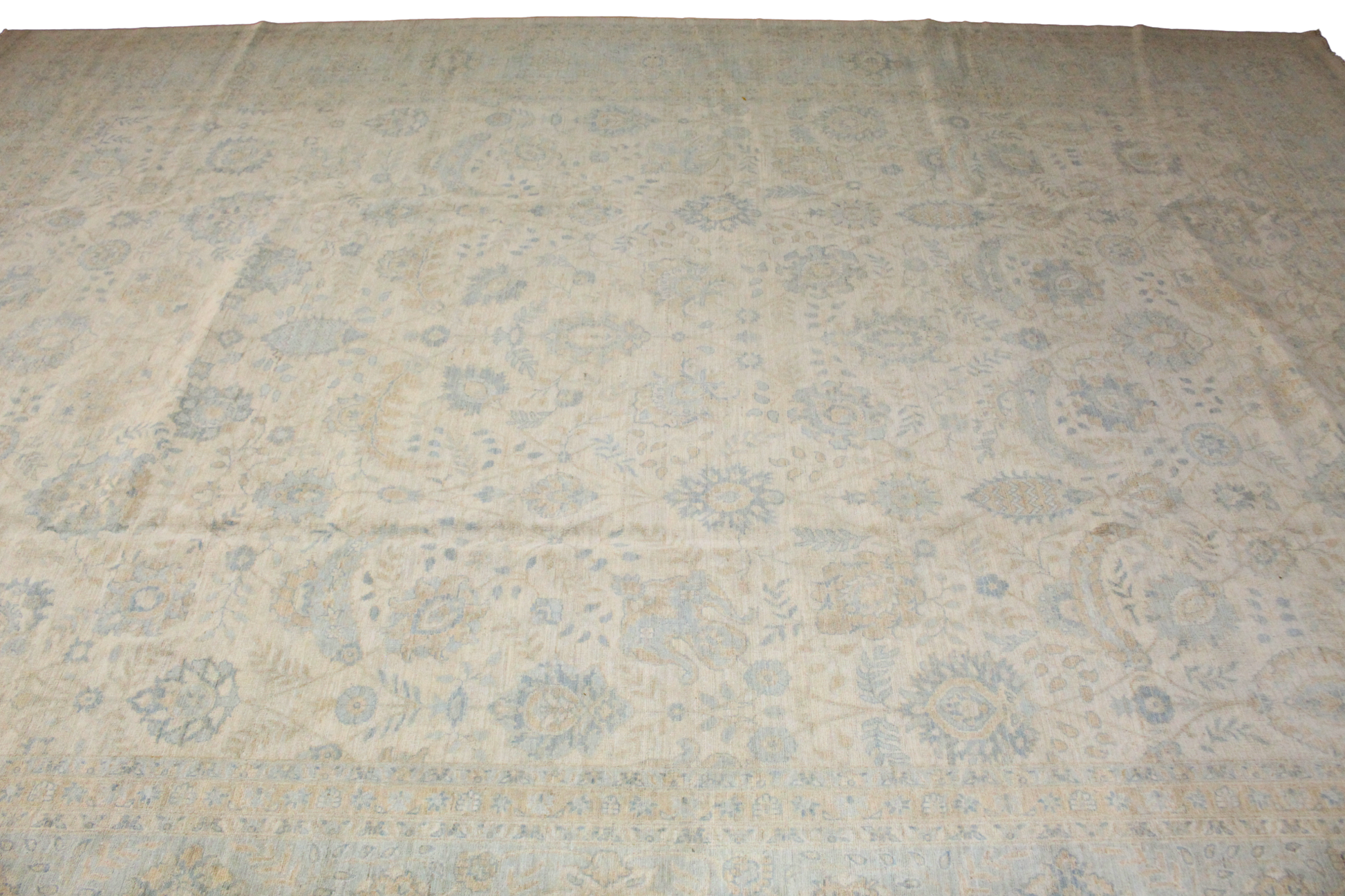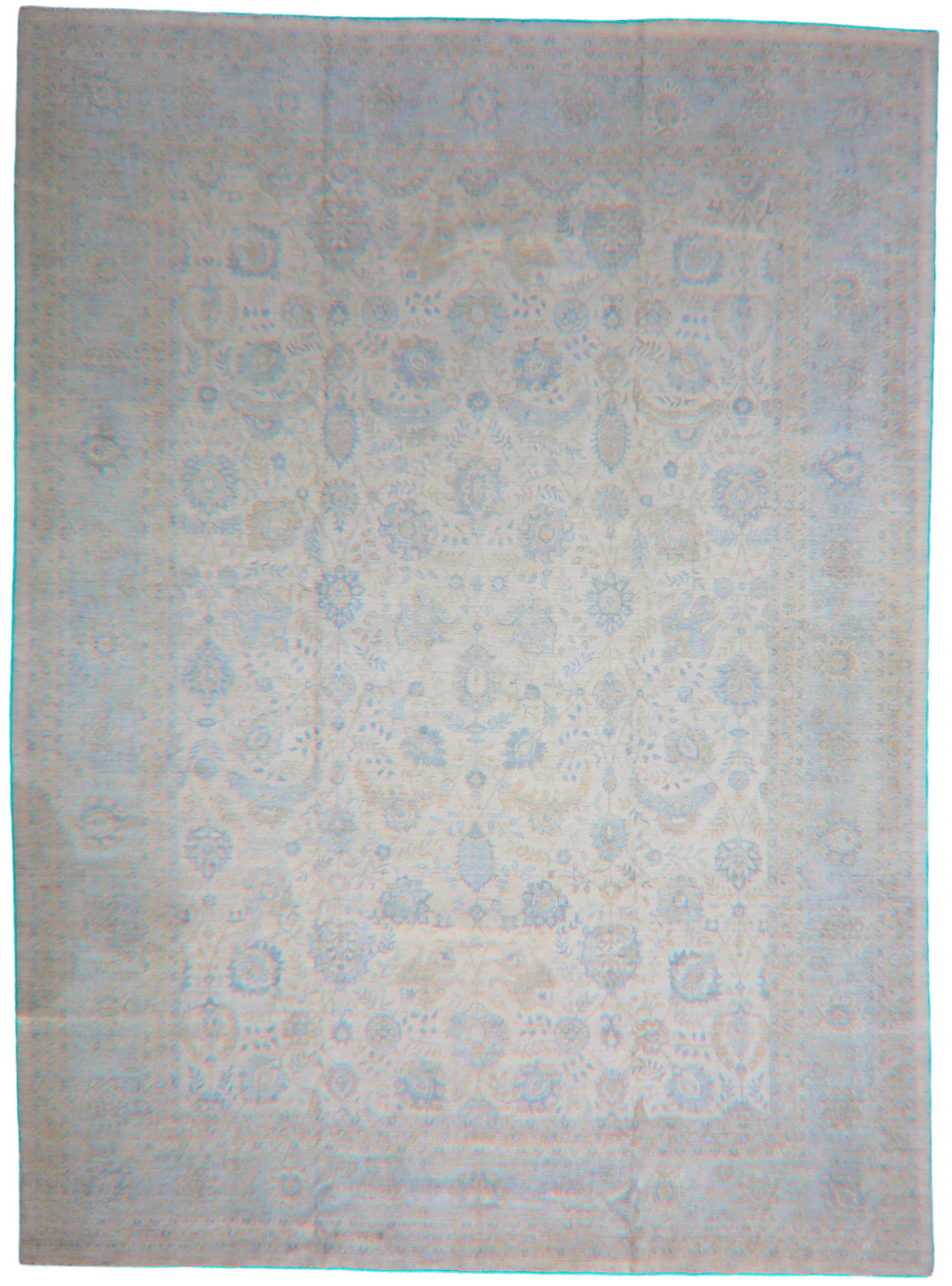 A soft dream woven into form, this fine Afghan Tabriz rug (9.9 × 13.4 ft) is a masterclass in understated sophistication. Its intricate floral field, rendered in silvery blue and pale ivory, unfolds like lacework beneath a sheer mist. The design draws inspiration from classical Persian gardens, with curling vines, stylized palmettes, and medallion echoes that seem to shimmer and fade with the light.