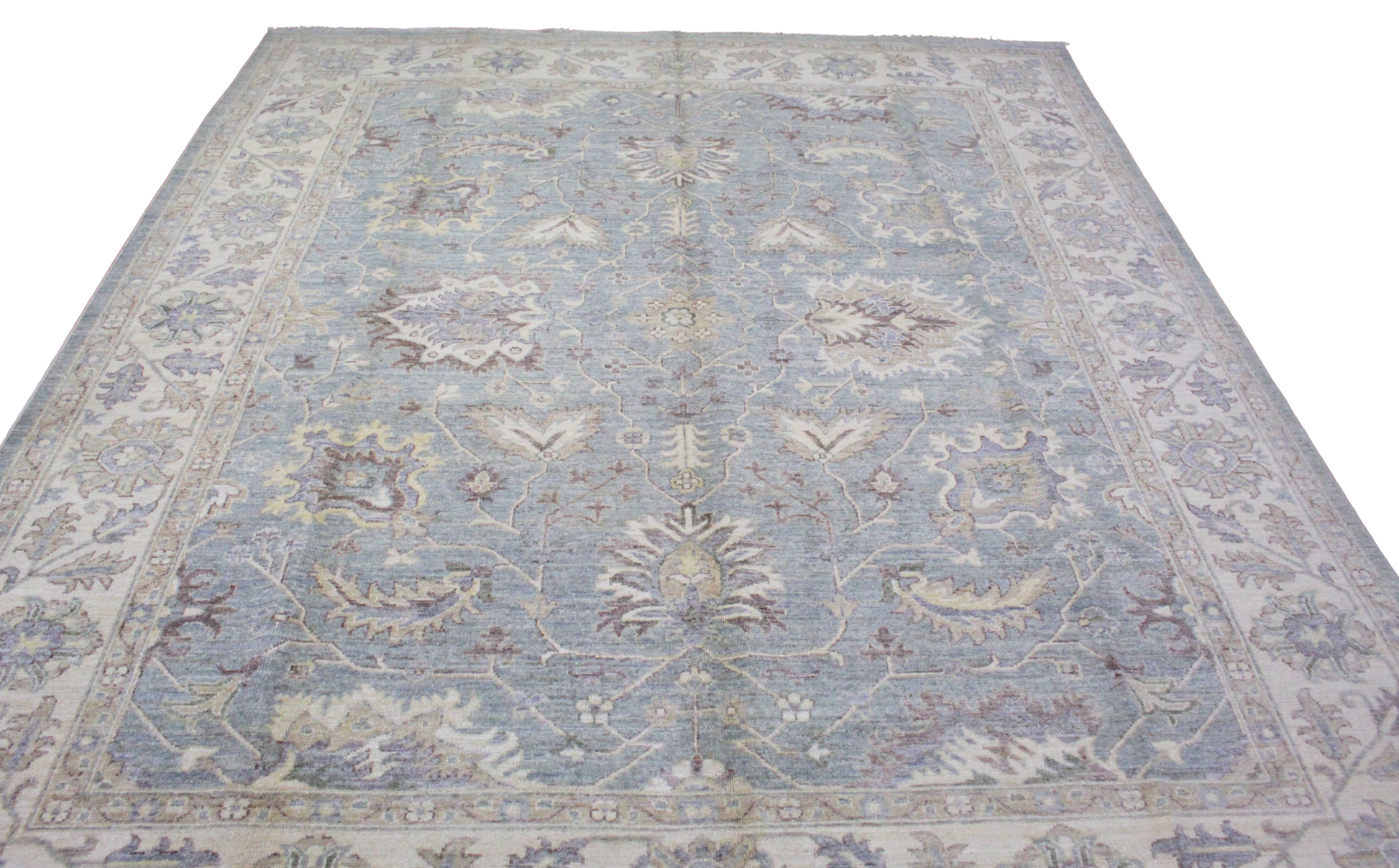 Infused with a tranquil palette and timeless artistry, this hand-knotted Afghan Oushak rug (8.1 × 9.10 ft) delivers an air of relaxed sophistication. The soft celadon-blue field is gracefully populated with classical botanical motifs, flanked by a harmonious ivory border featuring stylized florals and scrolling vines. Each detail is rendered with deliberate softness, lending the piece a calming presence.