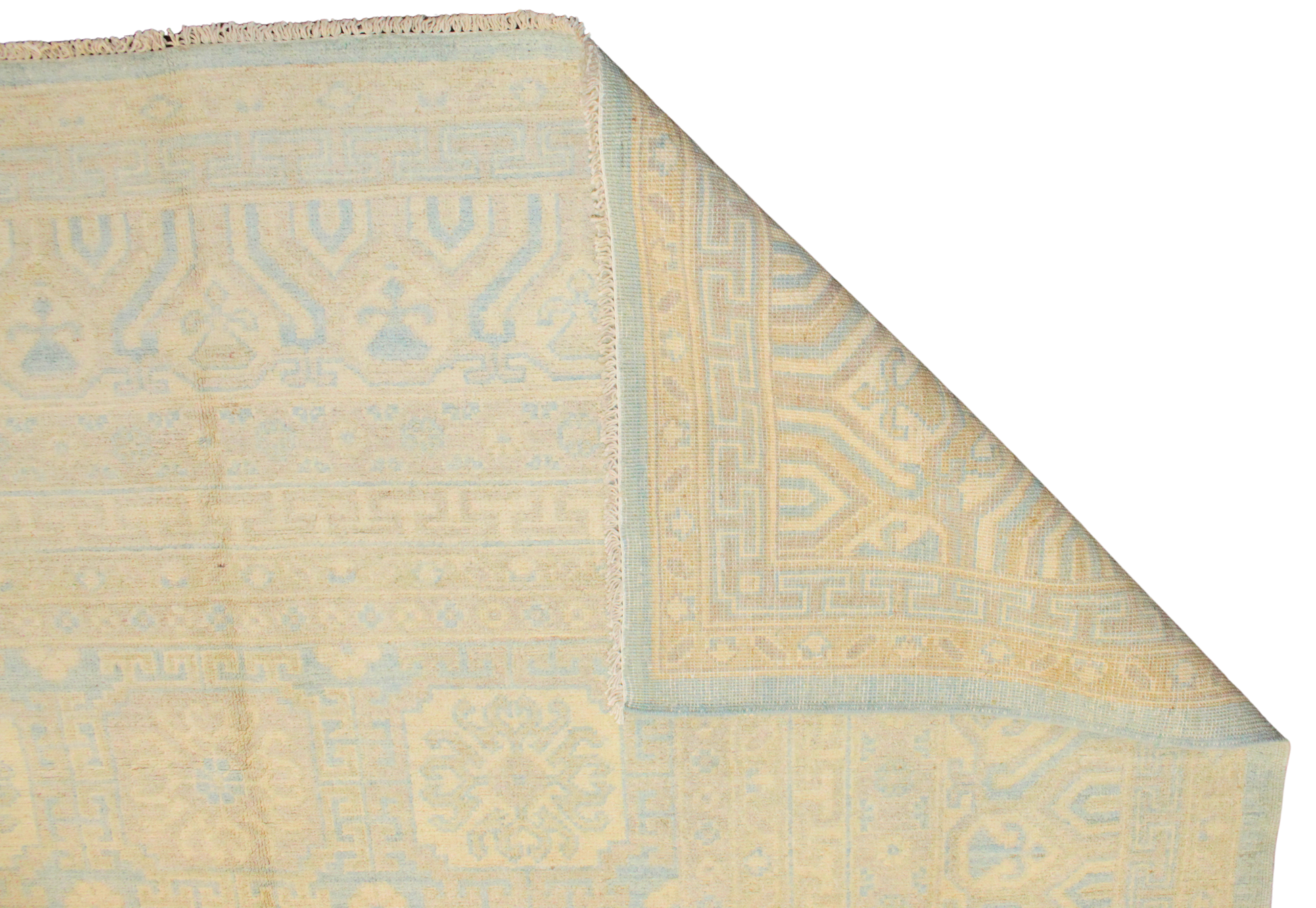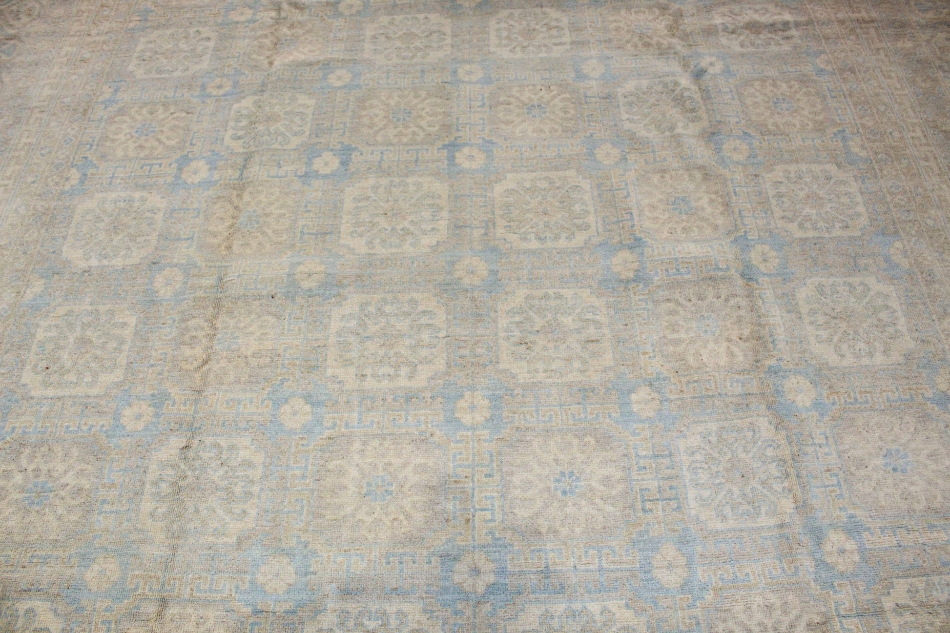 This exquisite Khotan rug (10.1 × 13.5 ft) from Afghanistan offers a delicate and refined presence, blending traditional Central Asian motifs with a cool, modern palette. The repeated geometric medallions across the field are intricately formed, arranged within a softly contrasting border that echoes ancient latticework. Pale ivory and misty blue hues mingle to create an almost frosted appearance, perfect for bringing light and calm into any grand interior.