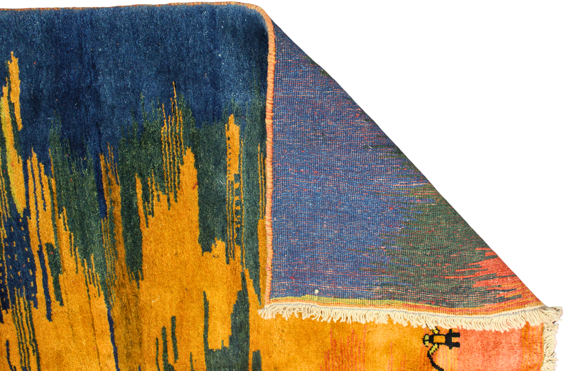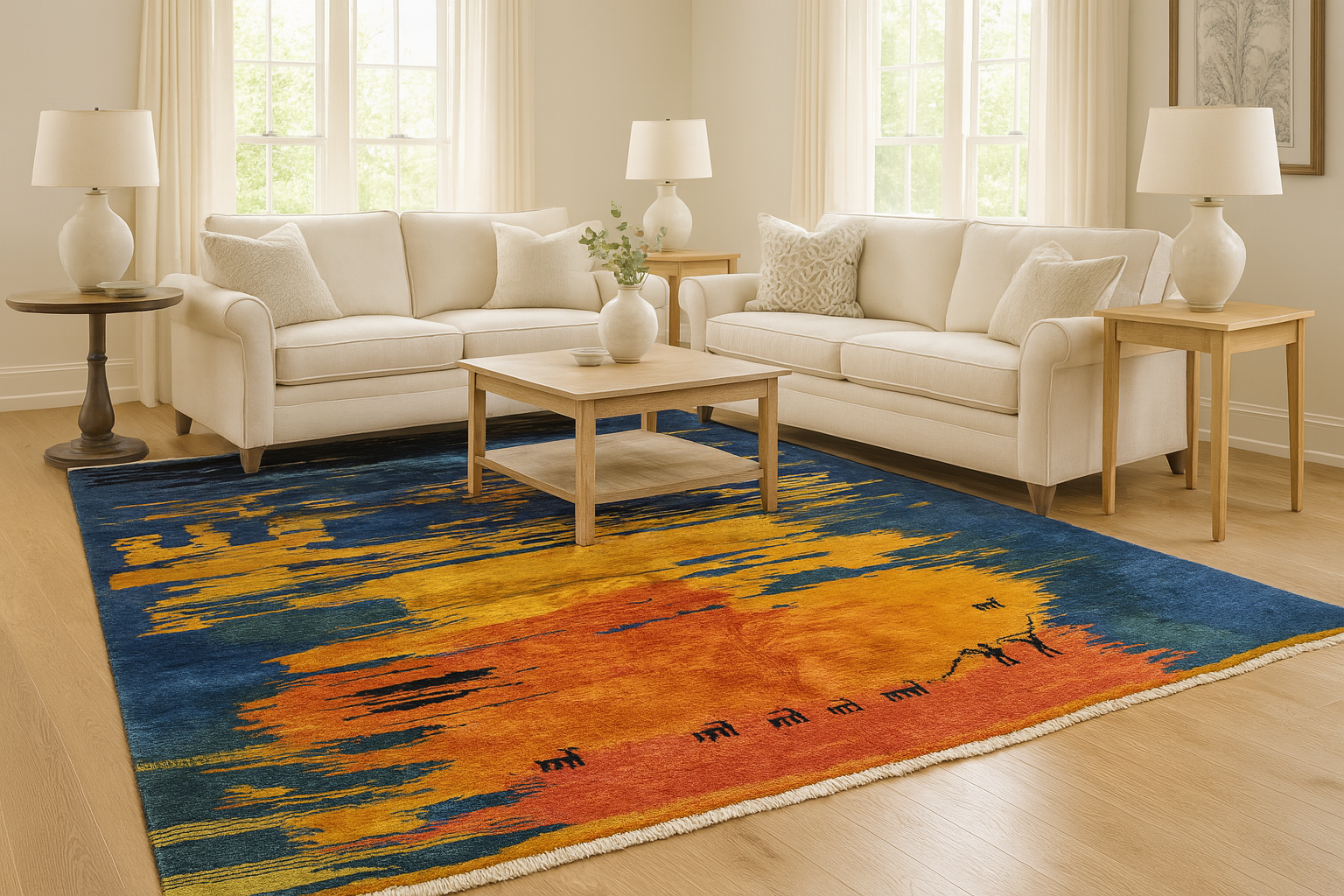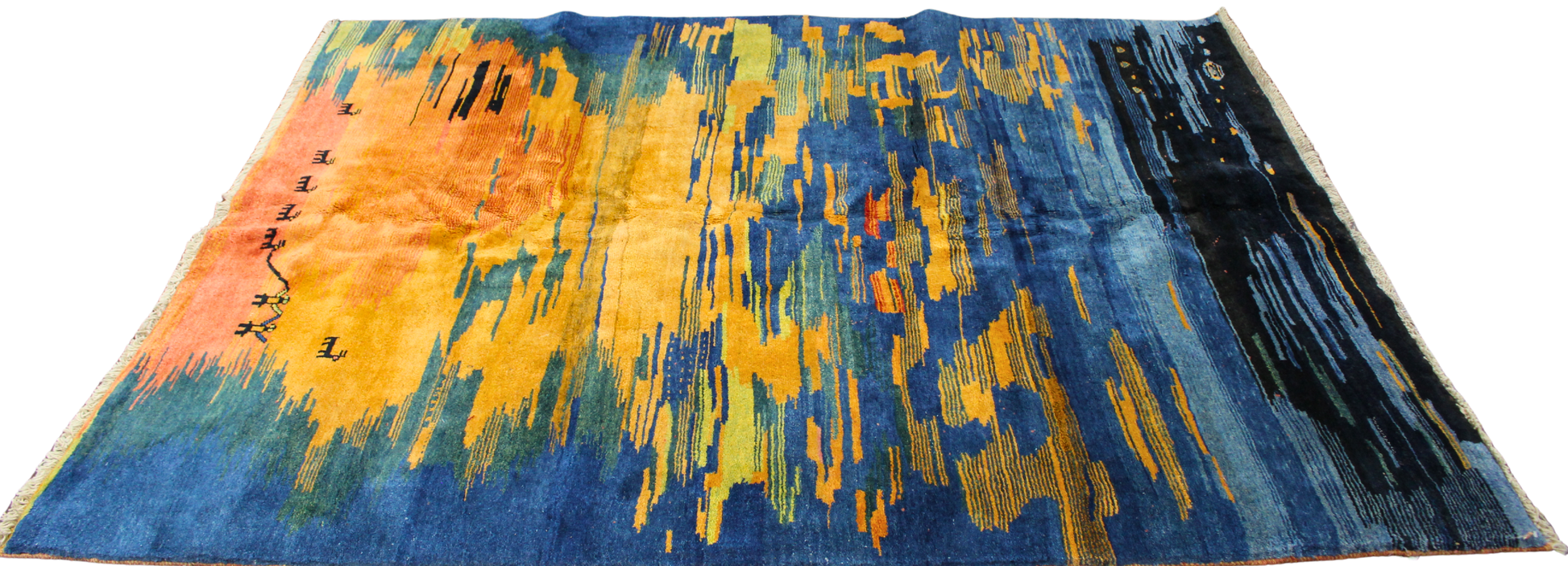Alive with color and storytelling, this hand-knotted Persian Gabbeh rug (6′9″ × 8′6″) captures the poetic glow of a desert sunset over a nomadic landscape. A mesmerizing gradation of fiery saffron, burnt orange, and deep indigo washes across the wool surface like watercolors bleeding into one another, evoking a twilight sky mirrored on calm waters.