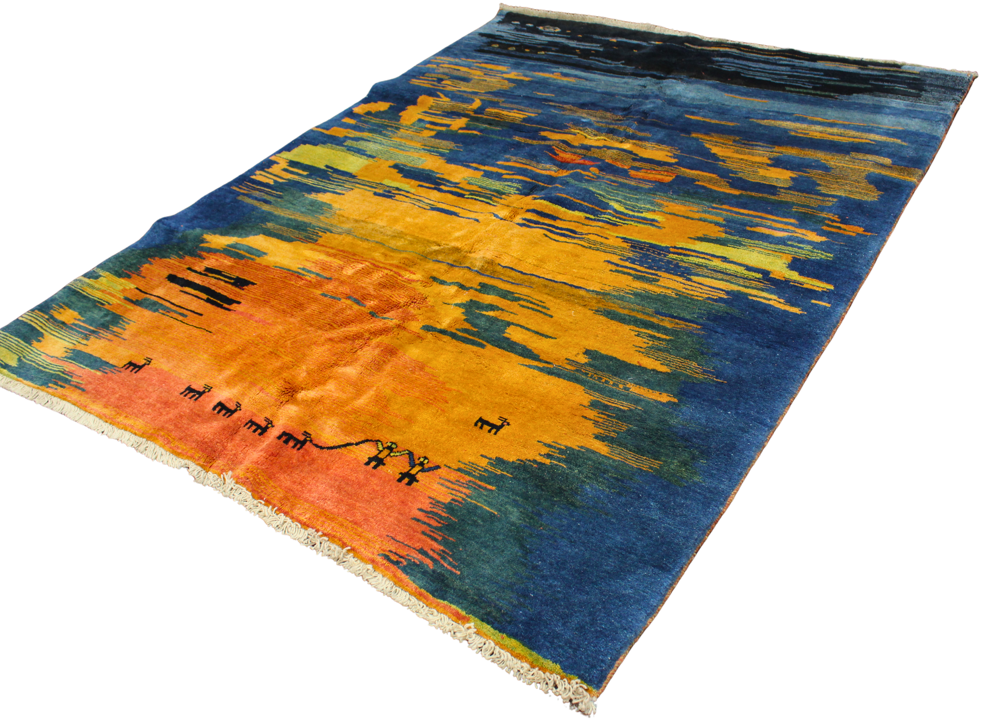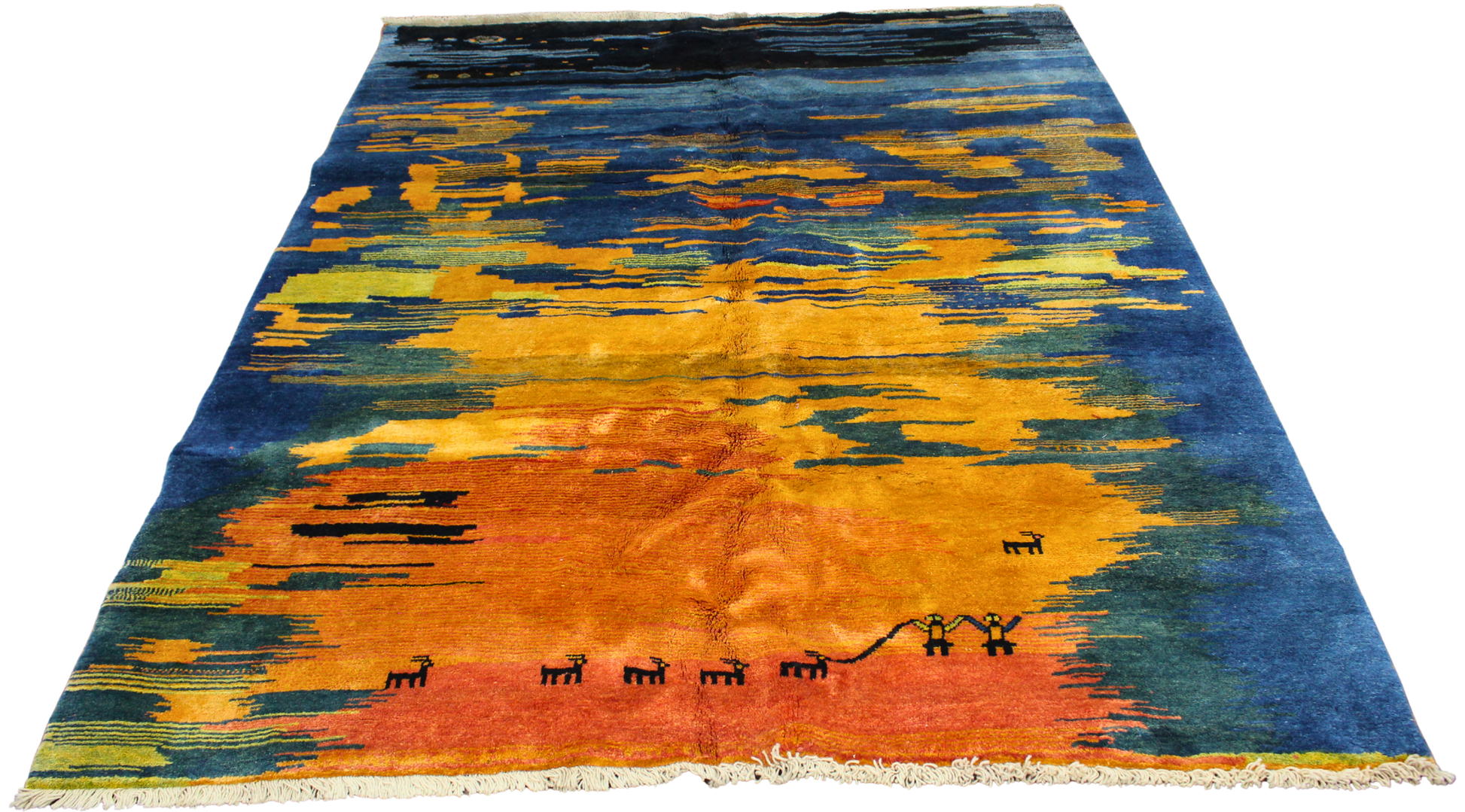 Toward the base, a row of miniature tribal figures and animals dances across the field — a signature of Gabbeh’s folk-art tradition and a quiet nod to the lives and legends of the nomads who inspired it. The palette’s energy is balanced by the richness of the wool pile, giving the piece a luminous softness both visually and underfoot.