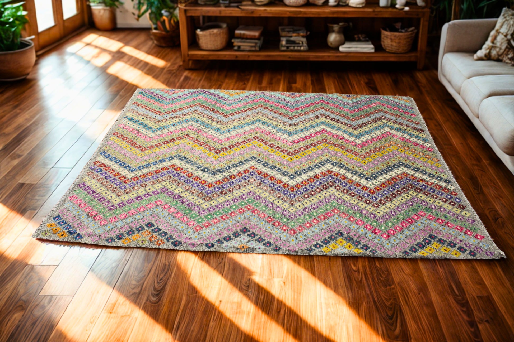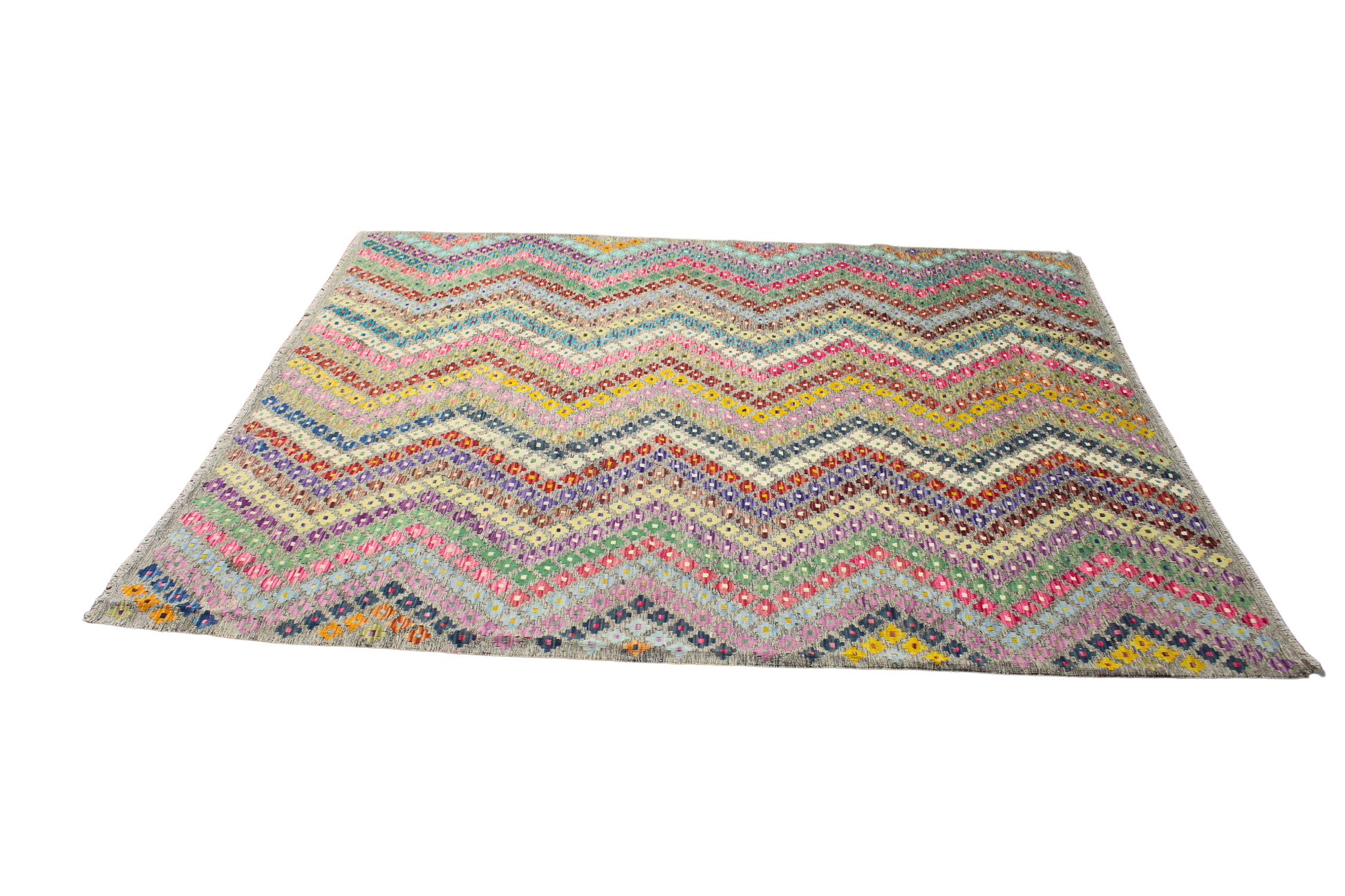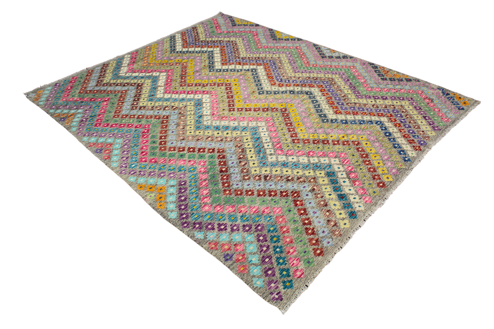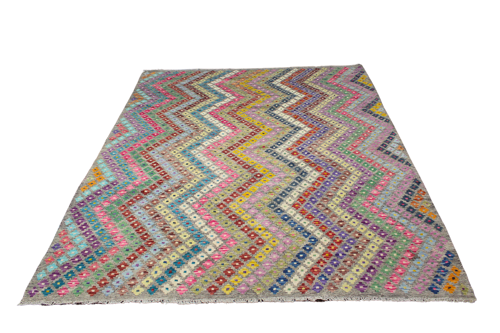 Bold movement and joyful color come together in this 6.11 x 8.4 ft handwoven Afghan Kilim. Its standout feature is the striking chevron pattern — a rhythmic sequence of zigzag stripes in multicolored tones that dance across the surface. Each band is composed of tiny diamond-shaped motifs, adding texture and intricacy to the vibrant geometry.