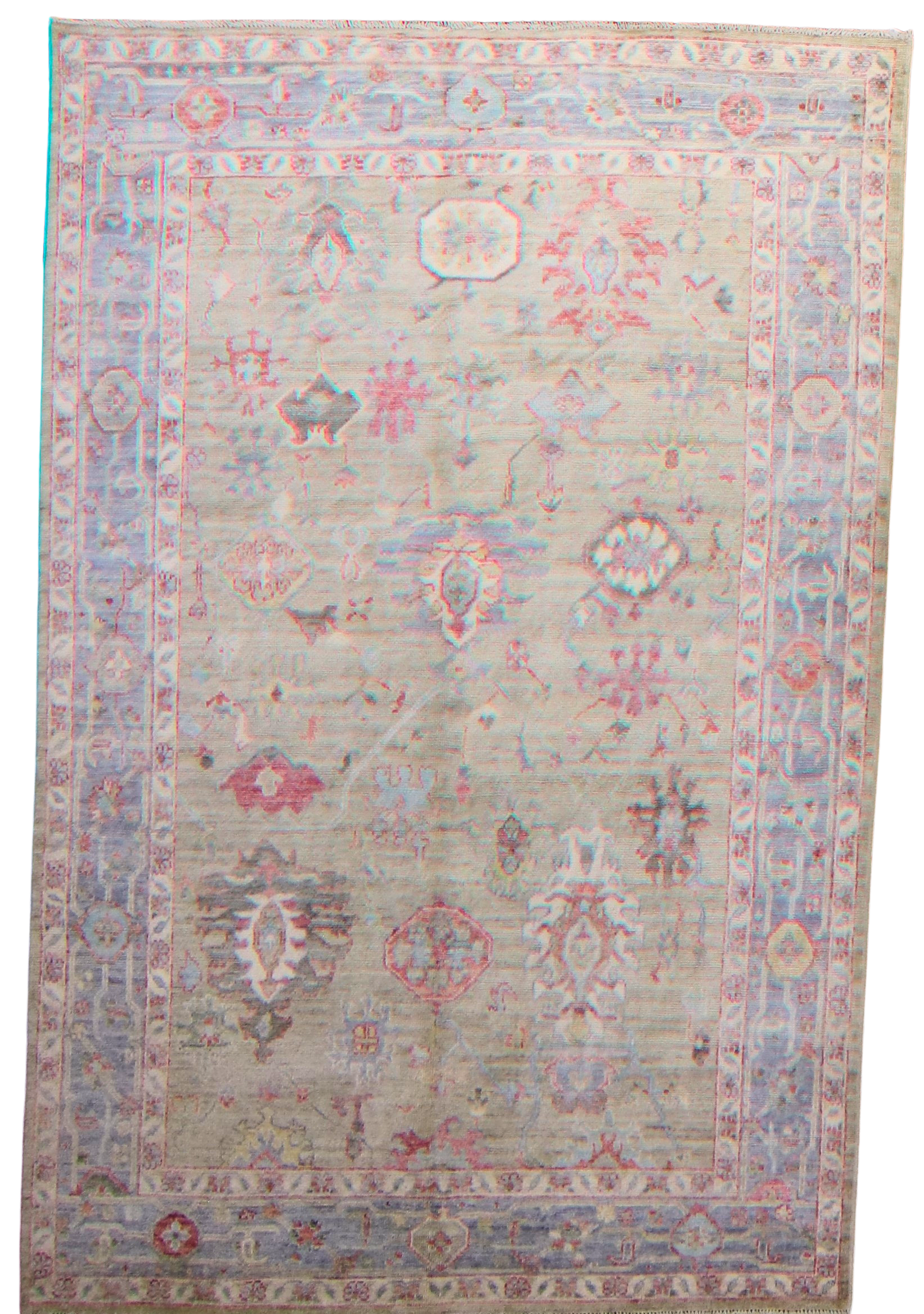 A symphony of subtle hues and antique styling, this Afghan Oushak rug (5.8 × 8.10 ft) radiates quiet sophistication. Its soft sage field is adorned with an eclectic mix of tribal-inspired motifs octagonal medallions, stylized leaves, rosettes woven in muted tones of blush red, dusty lavender, parchment, and periwinkle. The faded blue border, filled with floating floral forms and ornamental shapes, frames the piece with balance and grace.