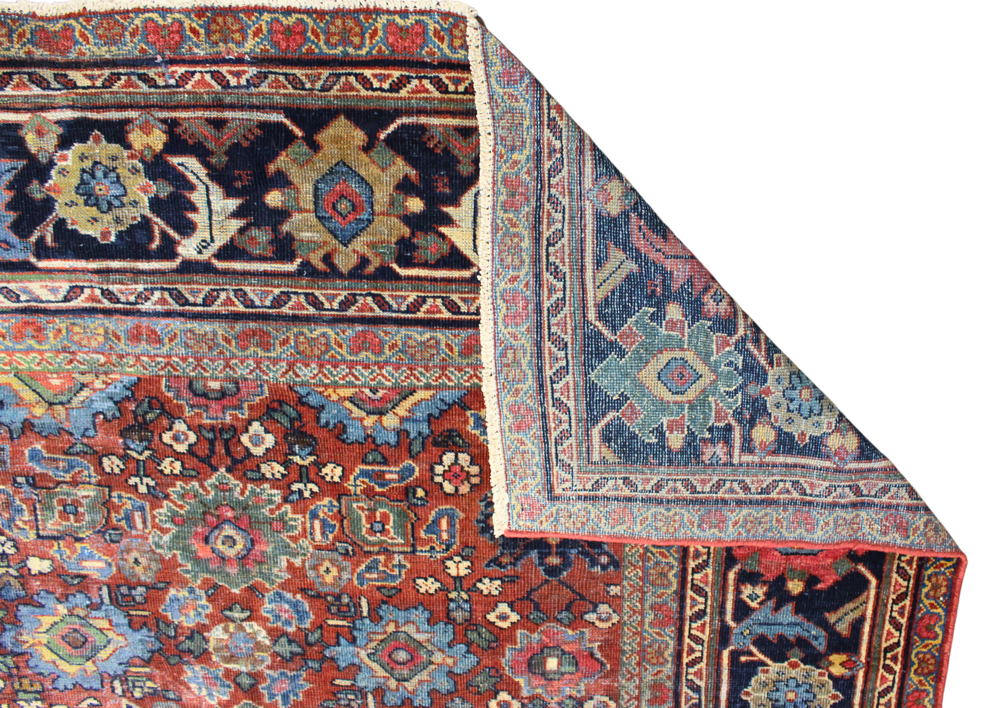 A masterclass in pattern repetition and color harmony, this expansive antique Mahal rug (10.9 × 16.4 ft) dazzles with its jewel-like allover design. The field is densely packed with rows of rosettes, stylized blossoms, and lattice-like motifs - each rendered in rich tones of ruby red, indigo, moss green, pale blue, and soft ivory. This rhythmic floral field creates an almost kaleidoscopic visual effect, balanced by its soft age patina and natural abrash.