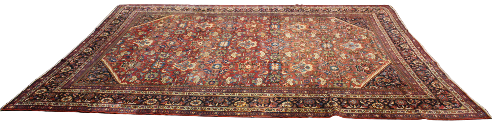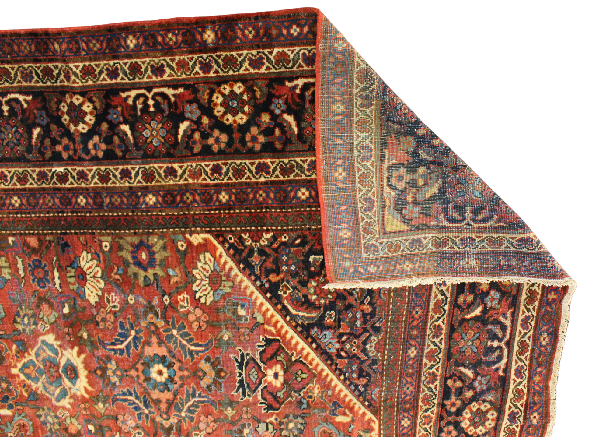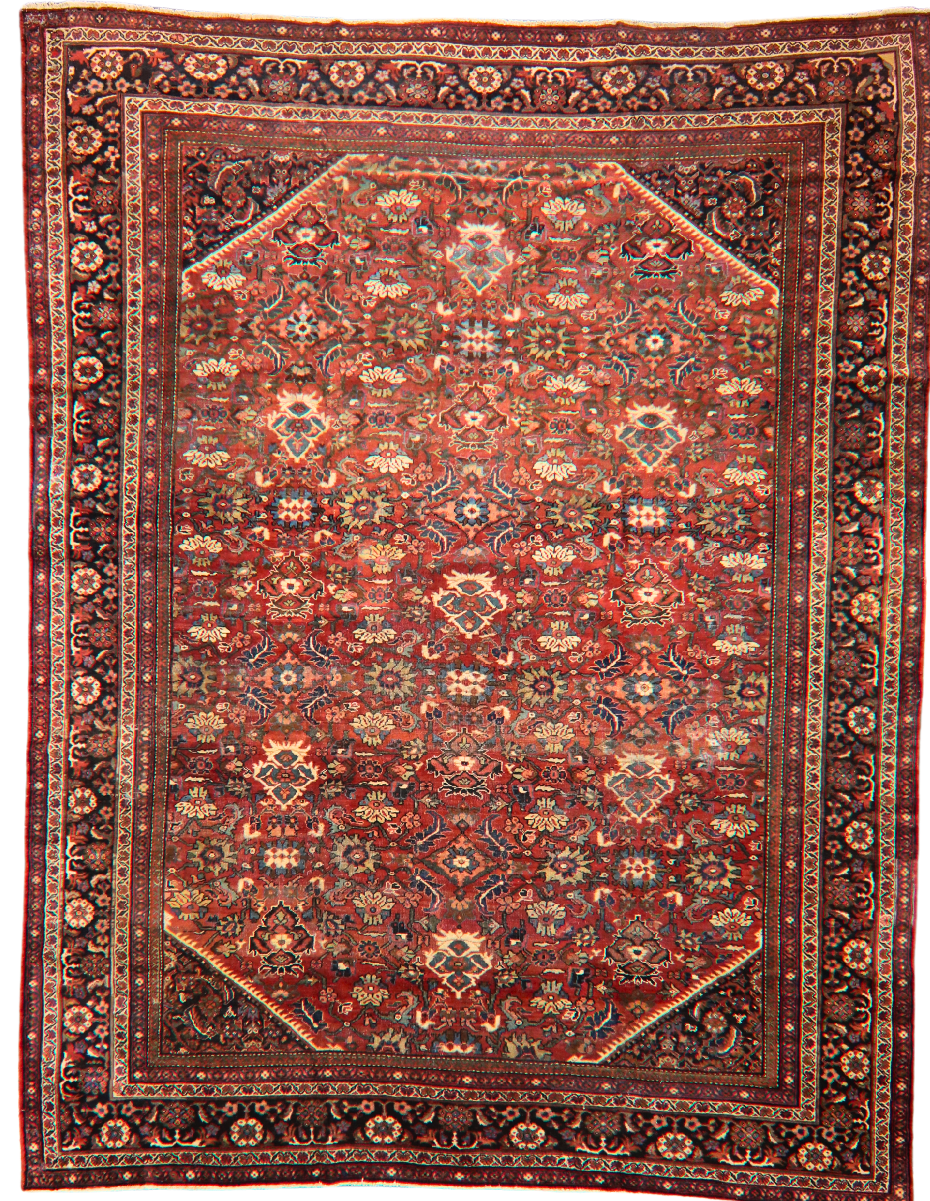This antique Persian Mahal rug (10.6 × 13.8 ft) is a richly detailed celebration of traditional village weaving, bursting with floral density and a harmonious rhythm of pattern. Its allover design features stylized rosettes, curling palmettes, and leafy tendrils set against a warm brick-red ground, bringing movement and warmth to any interior.