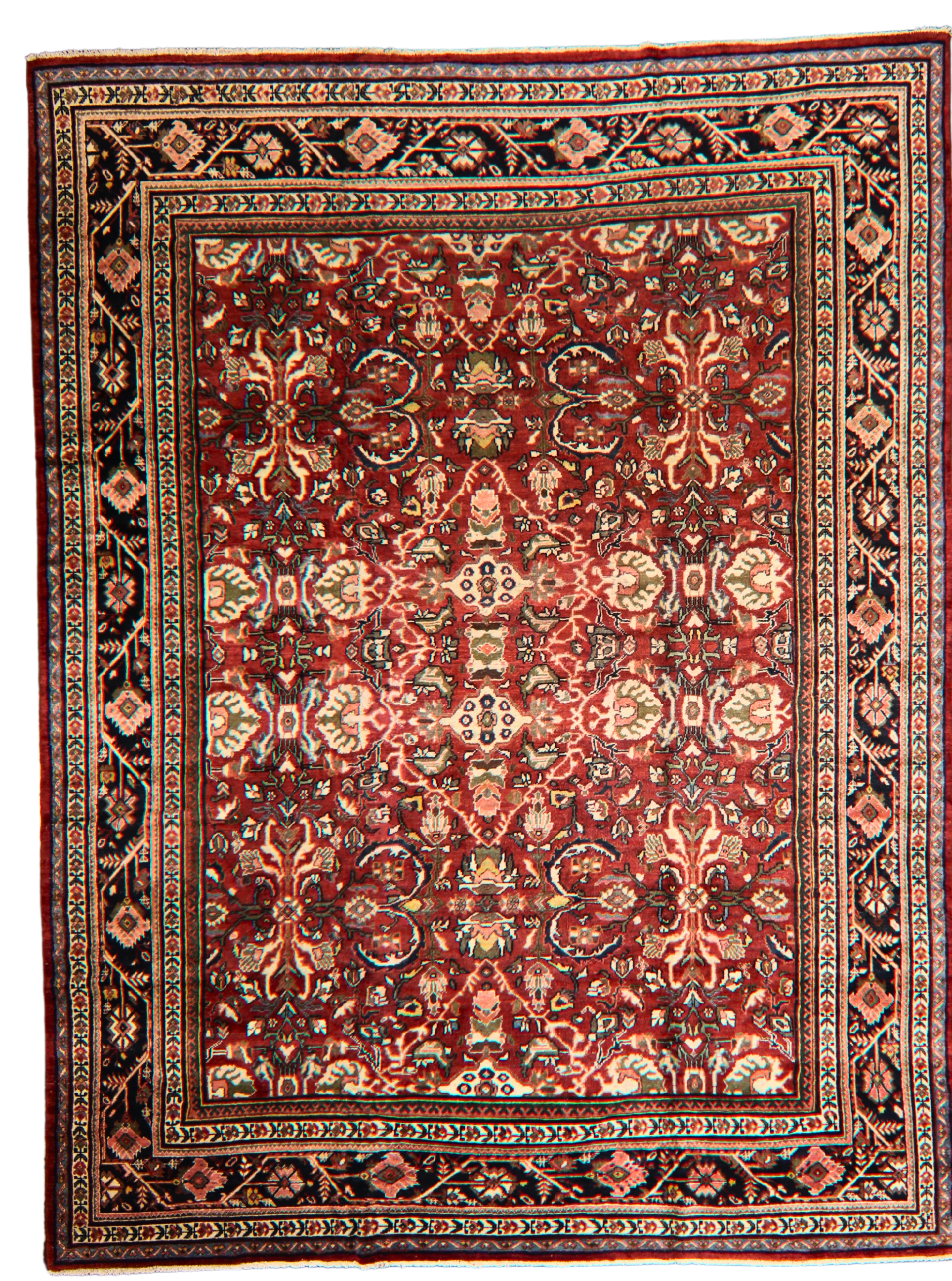 The border frames the design with crisp geometric rosettes and vine scrolls in navy and ivory, offering strong visual contrast against the vibrant red ground. Its structure is robust and harmonious, yet full of organic rhythm - making it ideal for both traditional and eclectic interiors.
