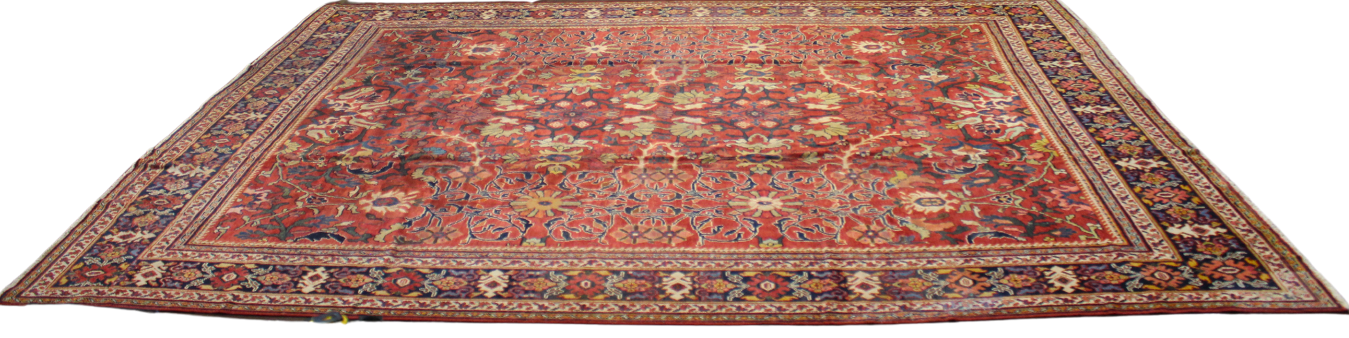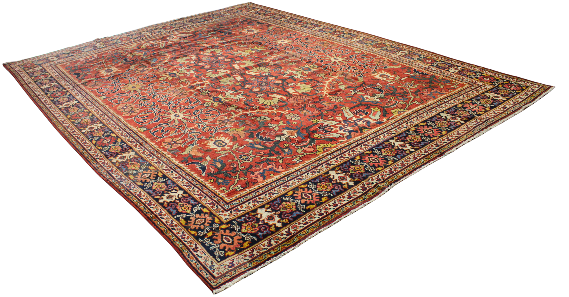 This stunning antique Mahal rug (10.9 × 13.7 ft) captures the lush elegance and rhythmic precision of traditional Persian floral design. Woven with an allover pattern of interconnected rosettes, stylized palmettes, and scrolling vines, the rug blooms in a saturated field of rich crimson. Subtle touches of ivory, sapphire blue, olive green, and golden wheat add visual depth and balance, while the intricate lattice structure anchors the floral motifs in perfect symmetry.