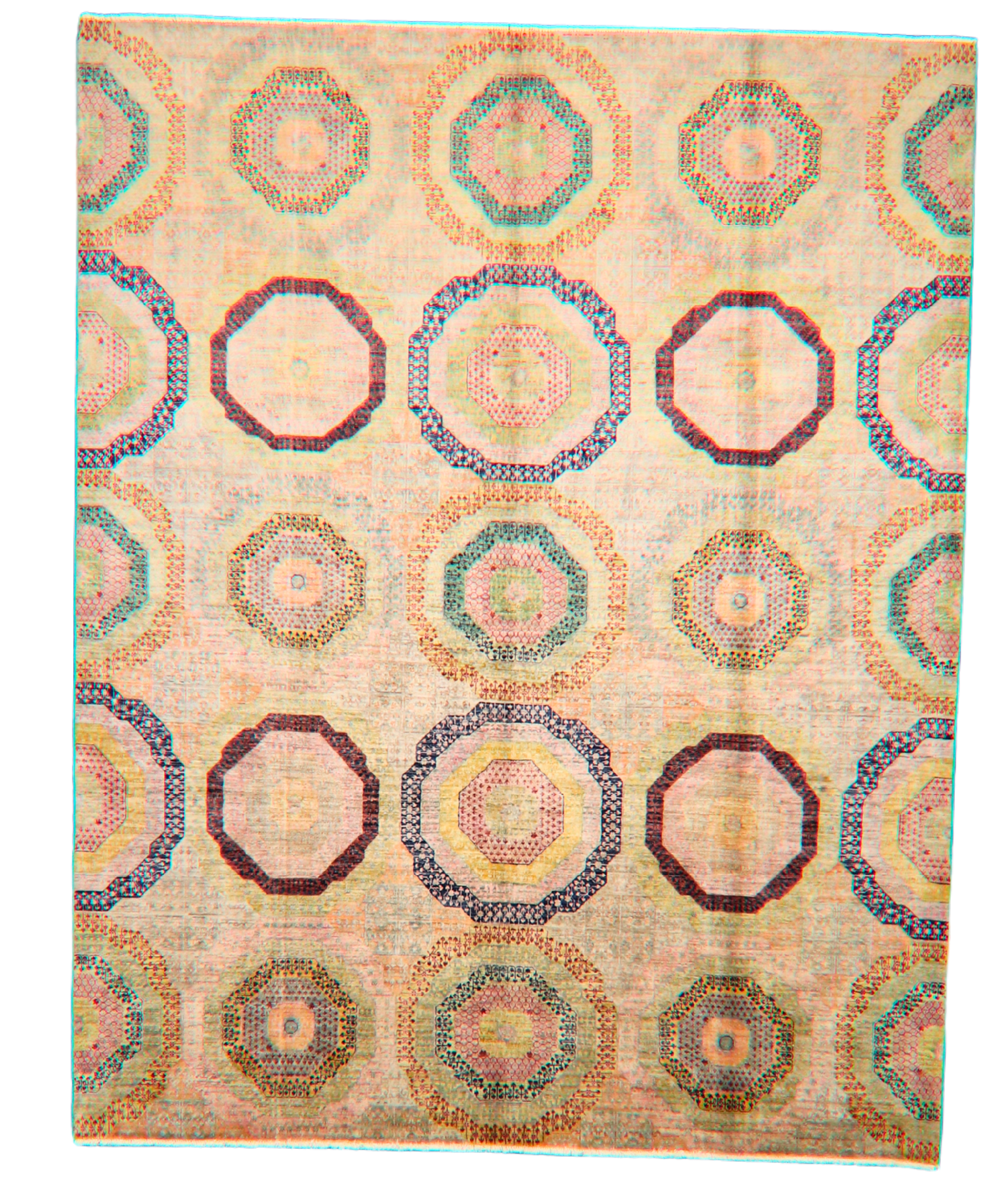 A visual symphony of pattern and precision, this Afghan Mamluk rug (7.11 × 9.11 ft) showcases a mesmerizing all-over layout of concentric medallions. Drawing inspiration from the ancient Mamluk weaving tradition, the design is built from repeated octagonal rosettes, each intricately composed of thousands of tiny, colorful knotwork elements. Shades of saffron, mint green, indigo, coral, and blush softly vibrate against a parchment field, creating a dynamic yet balanced composition.