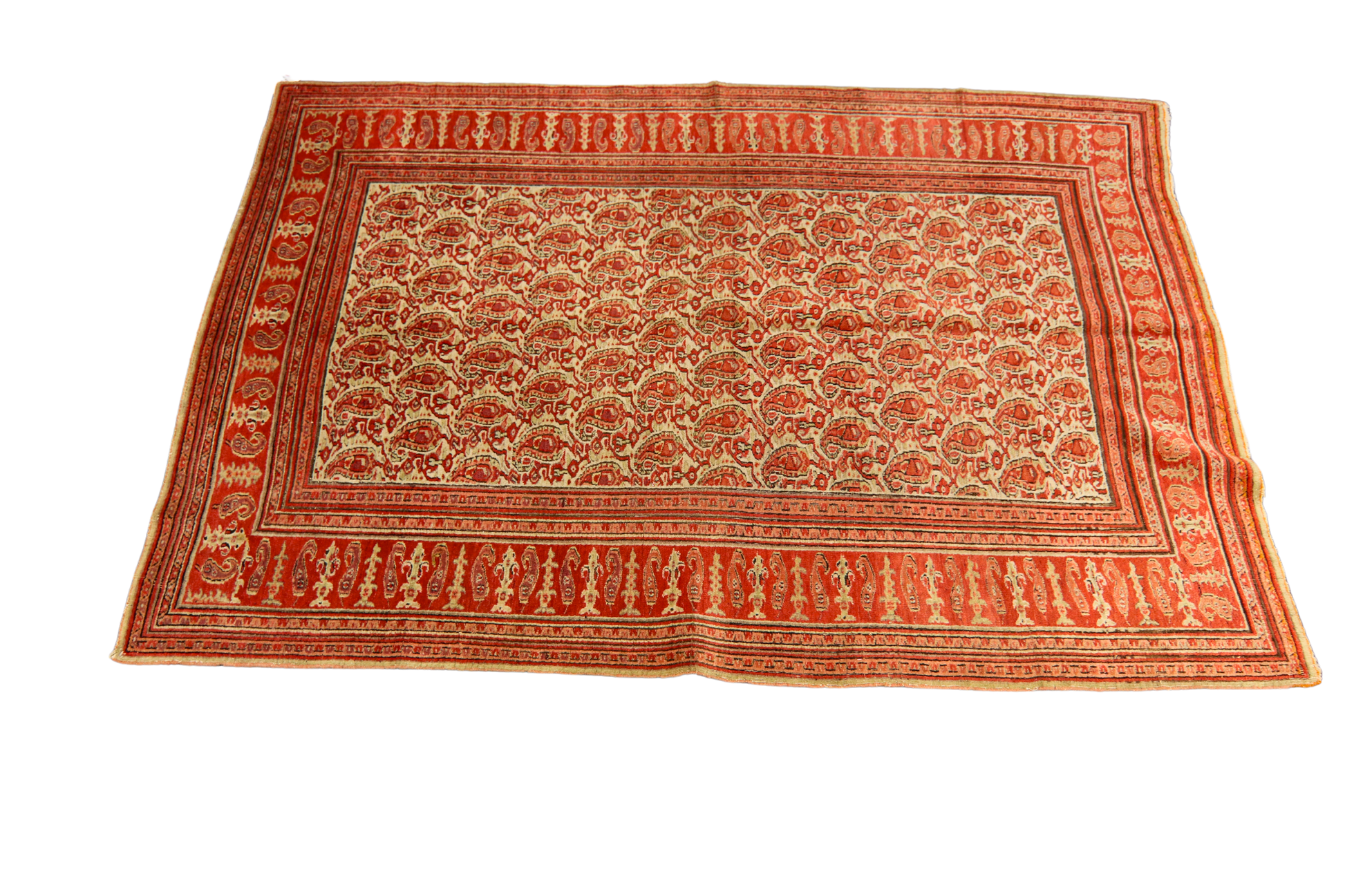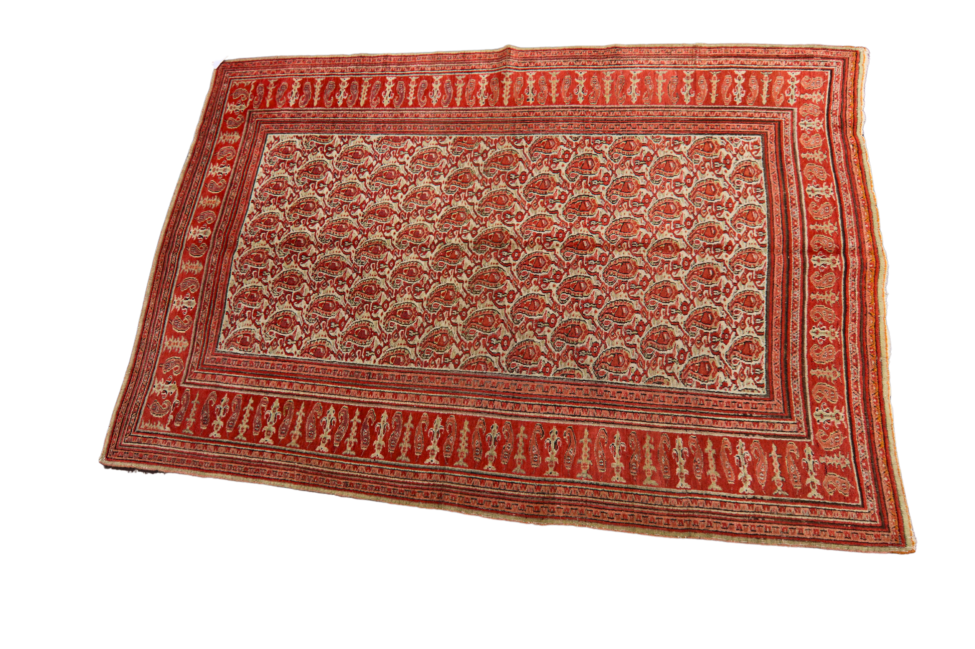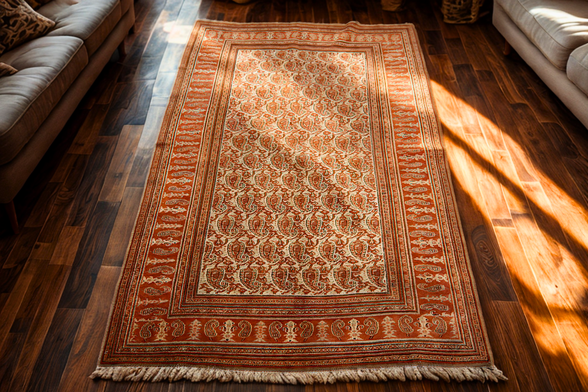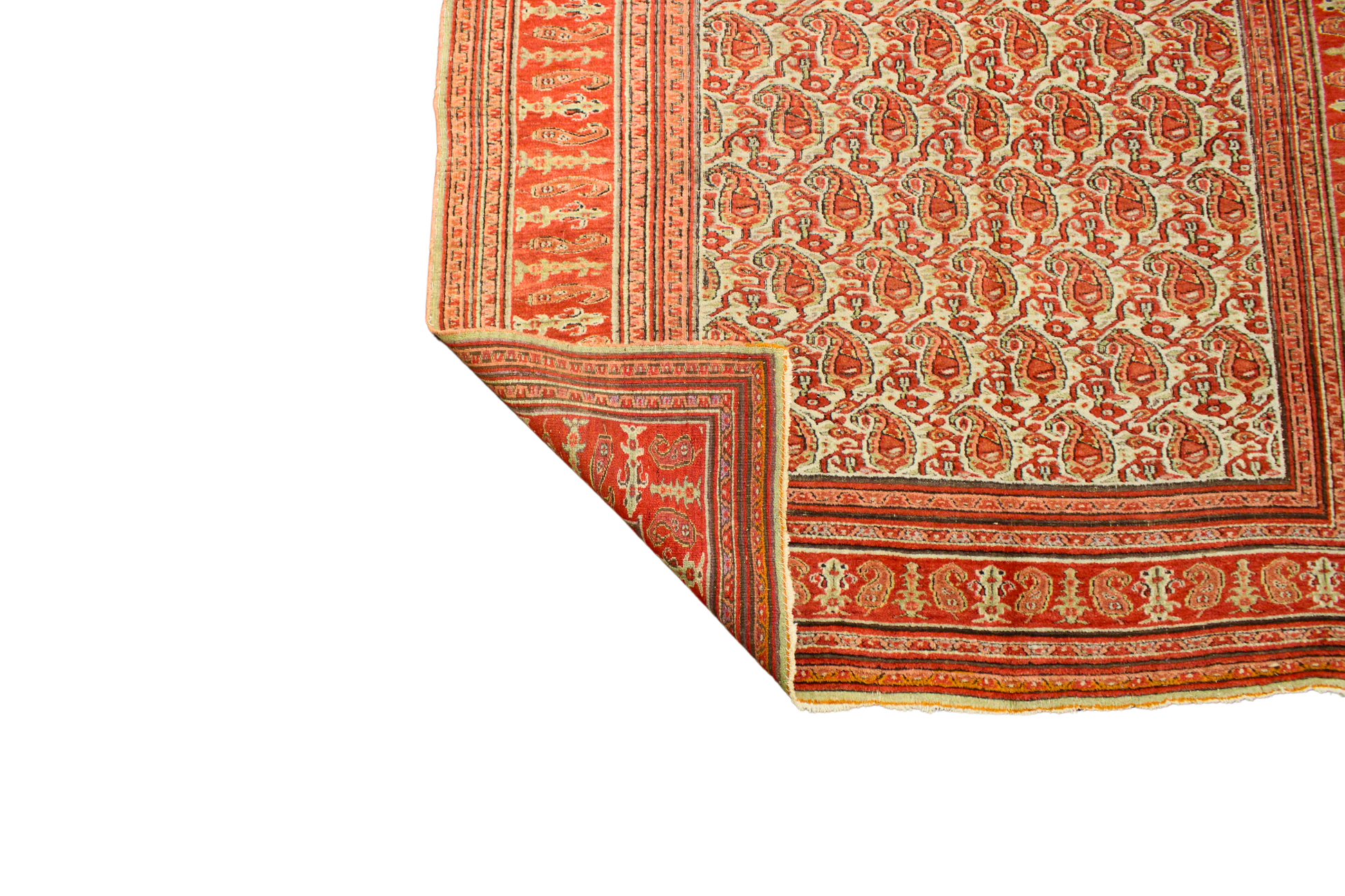 This antique Persian Seneh rug (3.11 × 5.9 ft) is a masterclass in repetition and refinement, showcasing the intricate boteh motif—an ancestral symbol of life and eternity—arranged in precise rows across a warm ivory ground. The vibrant red field gives the rug a regal energy, while the layered border of fine stripes and stylized floral bands creates a rhythmic frame.