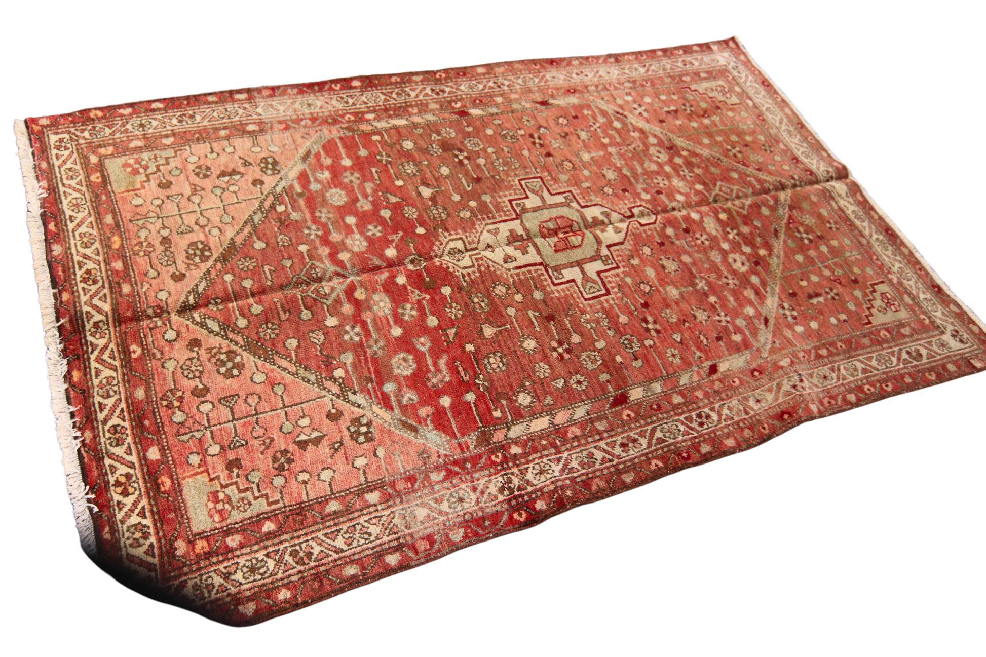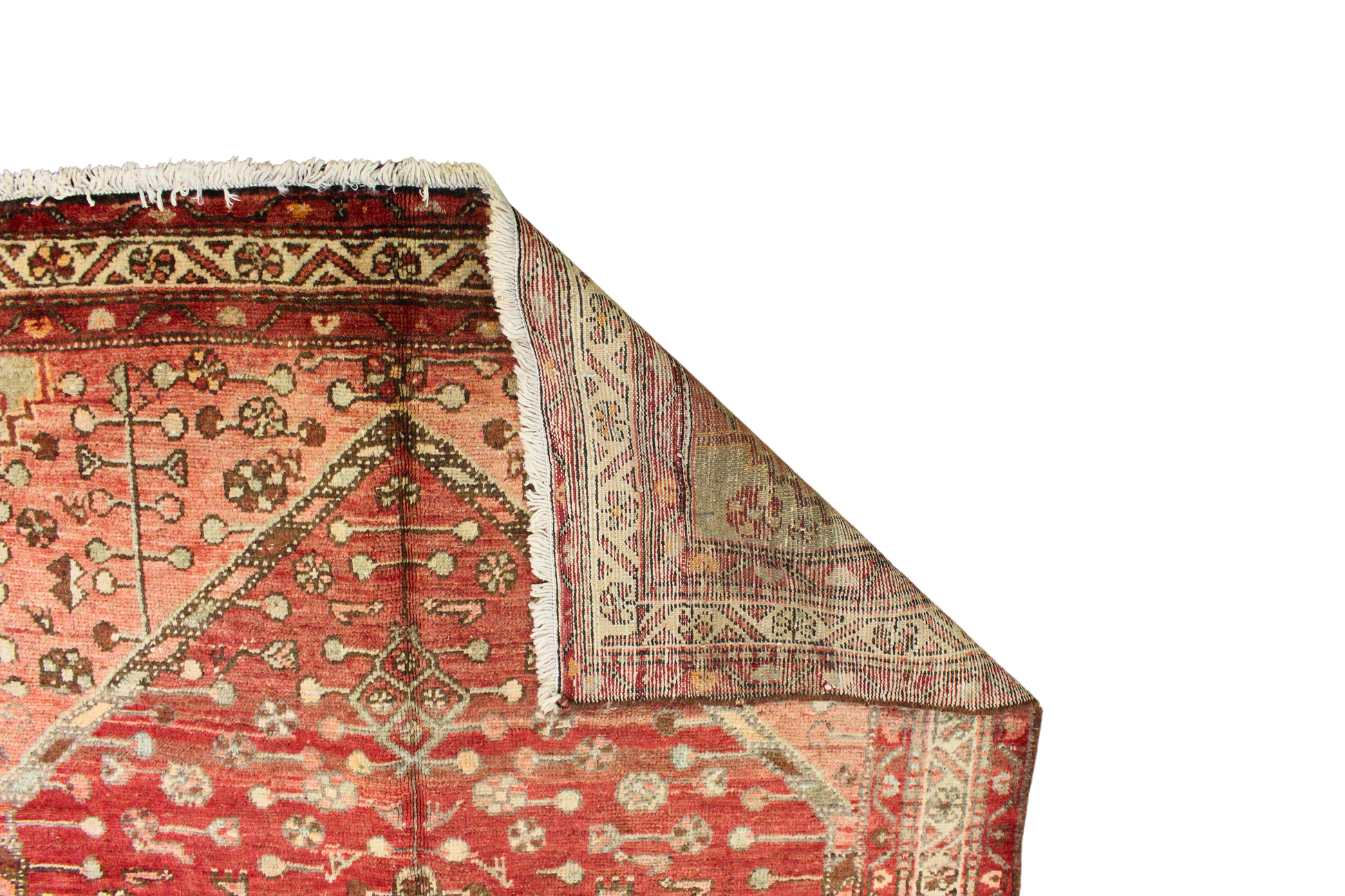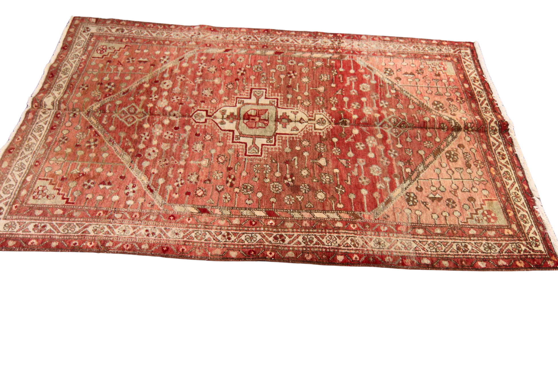 A beautiful example of tribal refinement, this antique Hamedan rug (4.4 × 7 ft) offers rich rustic charm with a distinctive geometric flair. Its deep terracotta-red field is grounded by a single angular medallion, framed within an elongated diamond that echoes the layout of Persian village weavings. Scattered across the field are abstract botanical motifs resembling sprigs and blossoms, adding organic softness to the structured format.