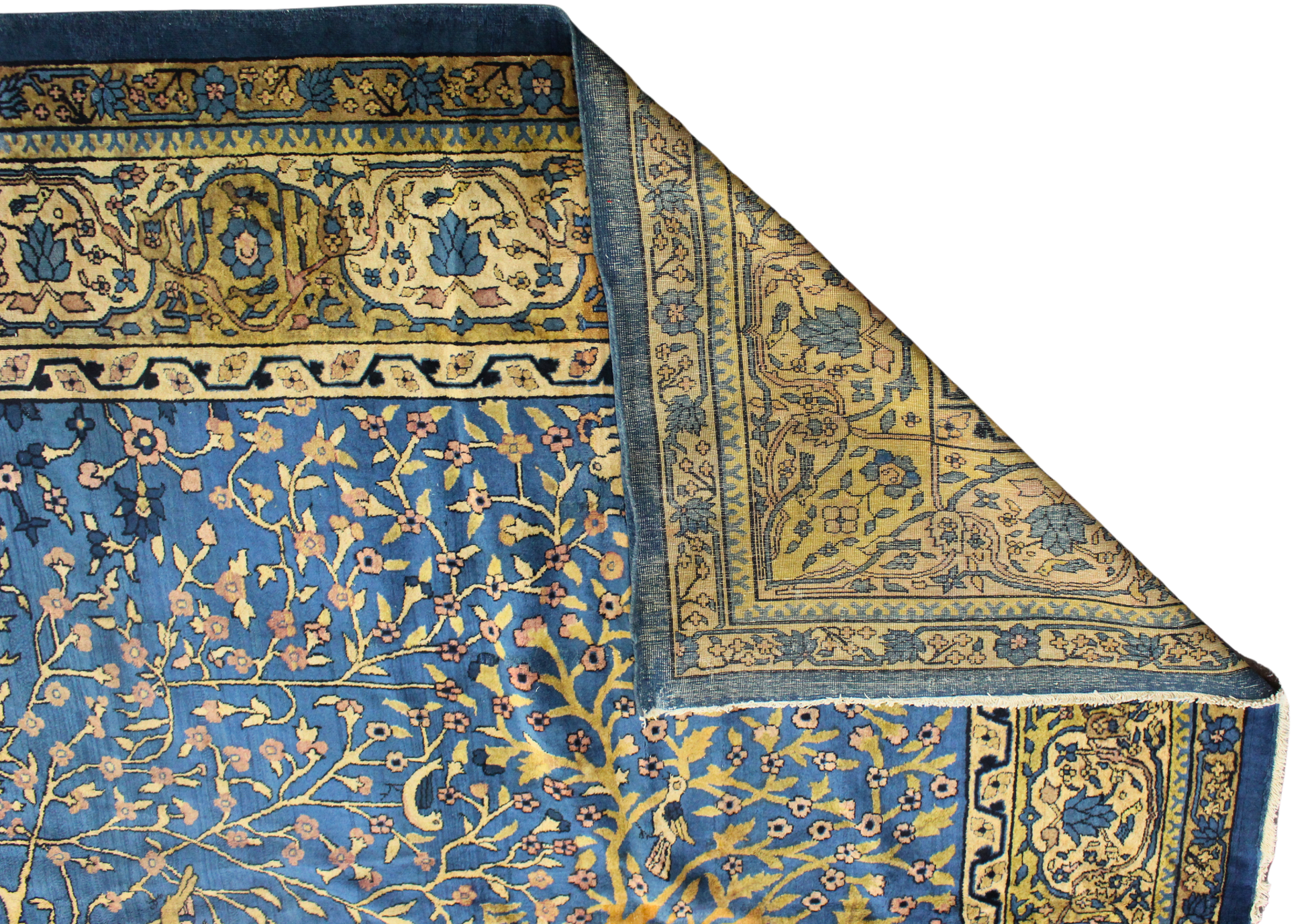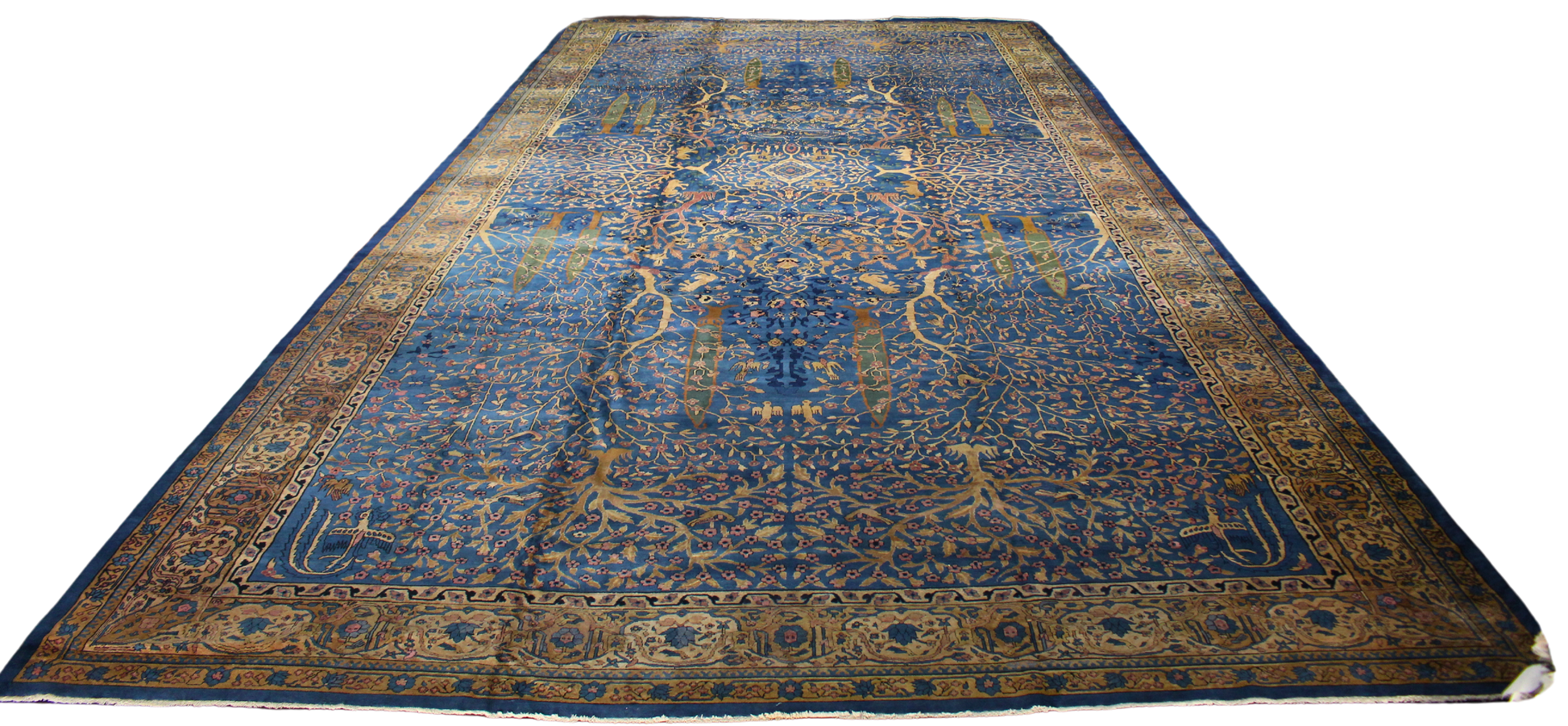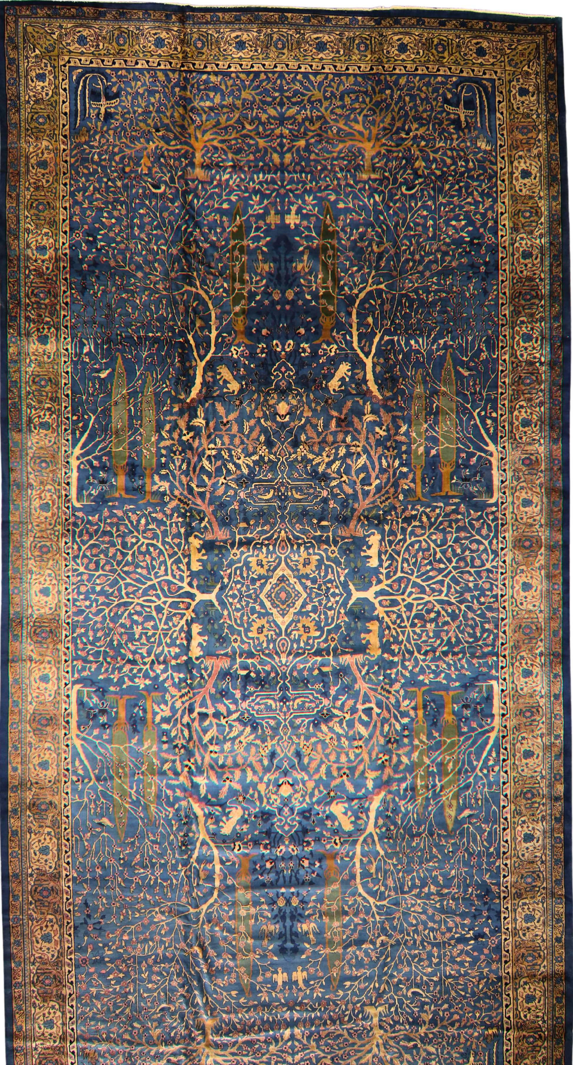 A true work of art on a monumental scale, this antique Agra rug (11.6 × 23.1 ft) evokes the elegance of India’s royal past through its lush, painterly design. The deep indigo field is a garden in full bloom - where symmetrical vines, trees of life, and regal flora intertwine with delicate animals, architectural columns, and arabesques. Its vertical balance and mirrored layout reflect the influence of Mughal artistry and Persian symmetry, creating a composition that’s both majestic and serene.