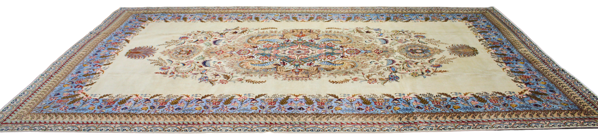 Crafted with regal precision and a master weaver’s touch, this Antique Persian Tabriz rug (10 × 16 ft) is a grand statement of elegance and order. The luminous ivory field sets the stage for an extraordinary central medallion surrounded by a harmonious explosion of palmettes, rosettes, and arabesques - all anchored symmetrically within a delicate field of scrolling vines and stylized peacocks.
