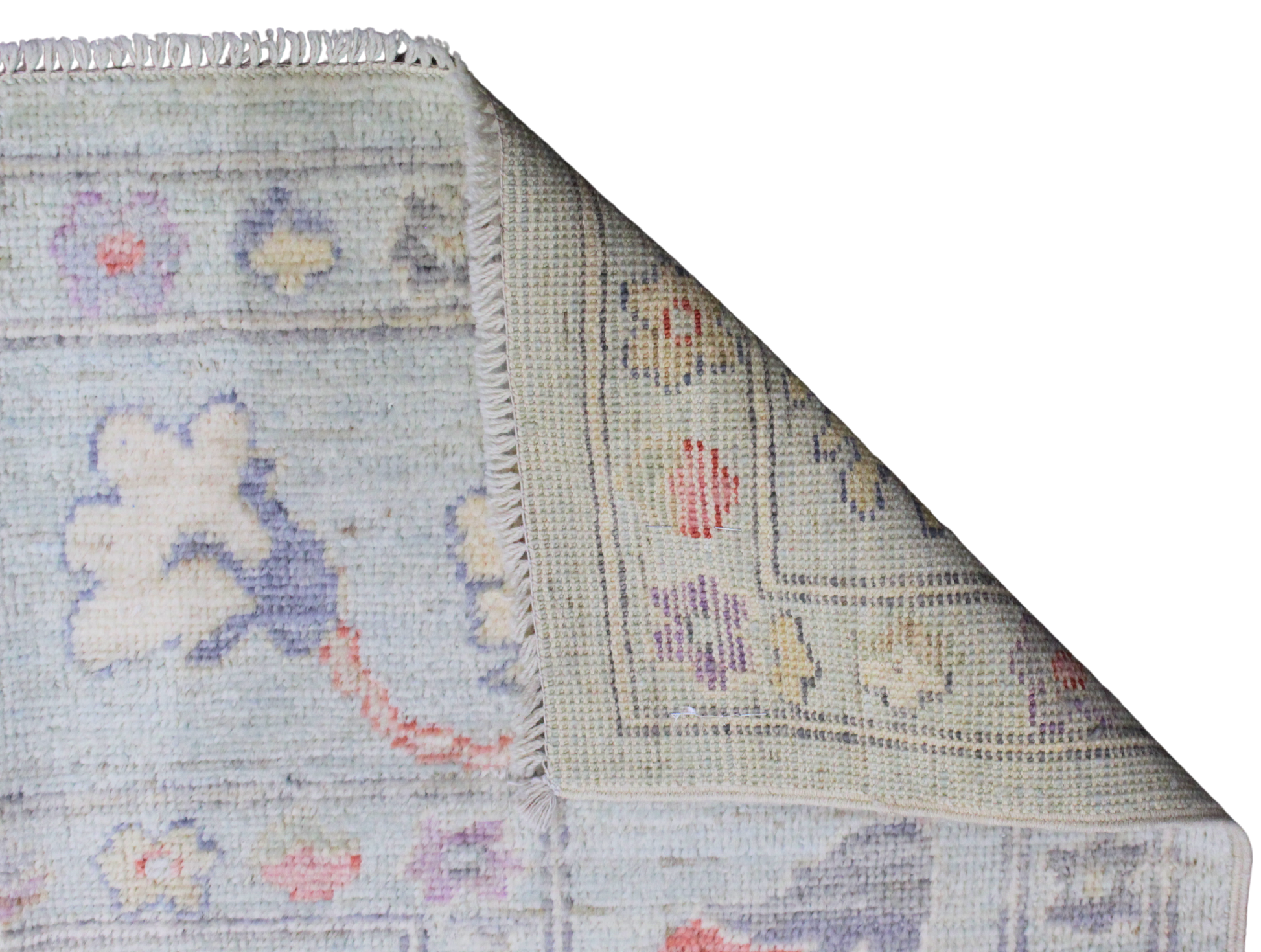 Bursting with playful charm and timeless elegance, this Afghan Oushak rug (8 × 9.10 ft) is a celebration of color and tradition. A soft, pale celadon field is animated by a whimsical array of stylized florals and tribal motifs, each rendered in a lively mix of coral, lavender, indigo, buttercream, and rose. The vibrant hues appear delicately faded, giving the piece a well-loved, heirloom quality while preserving its cheerful character.