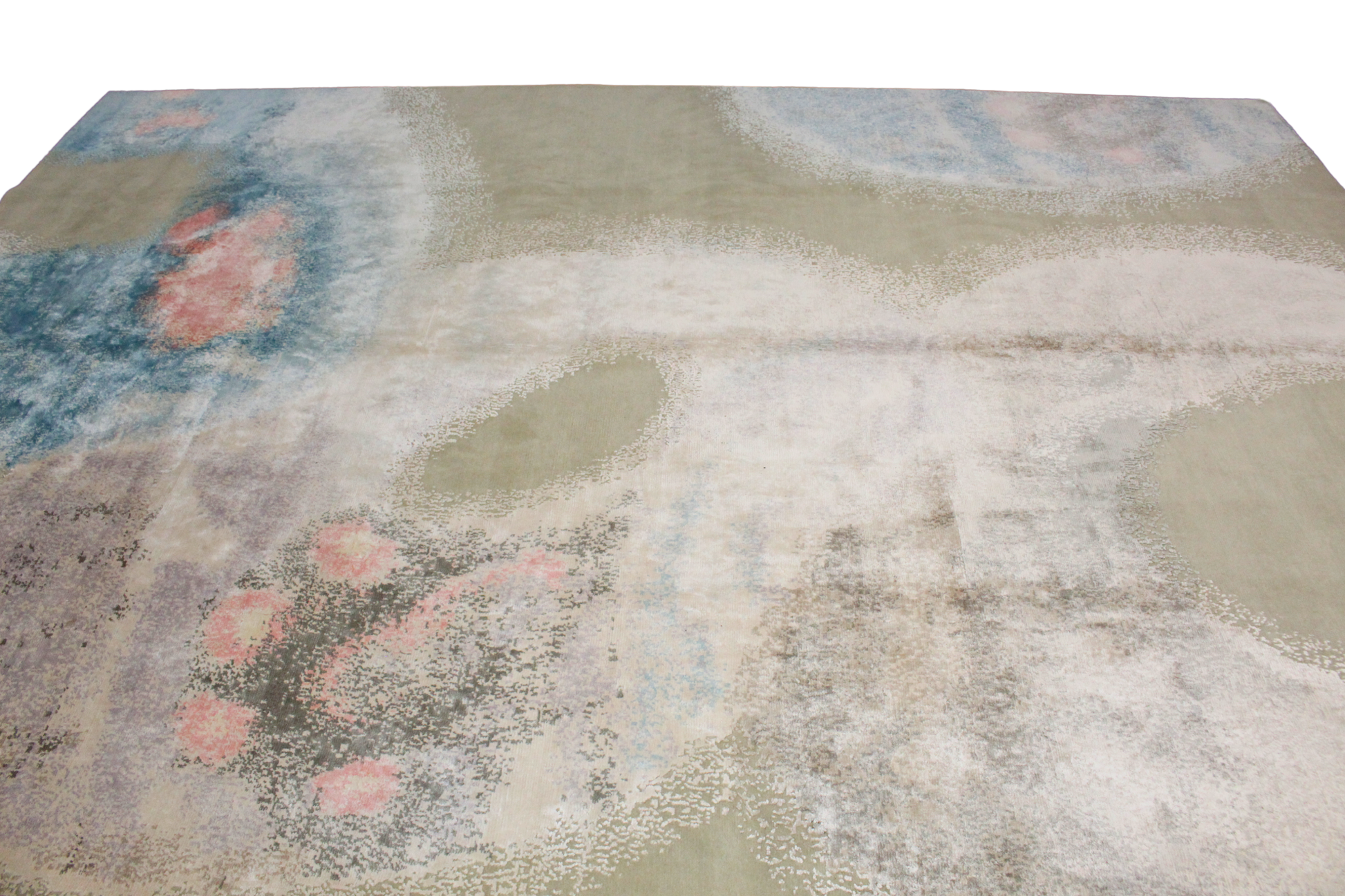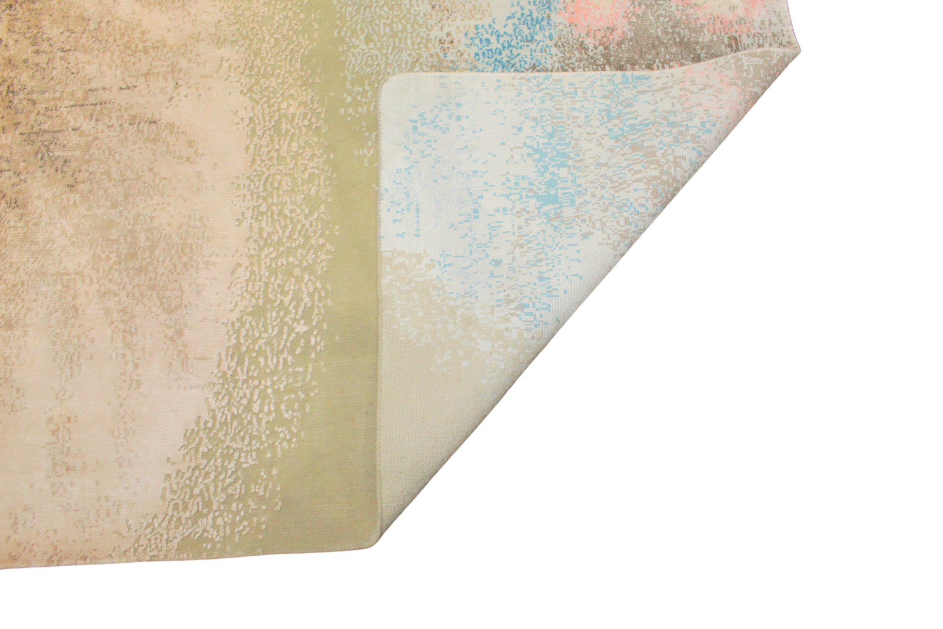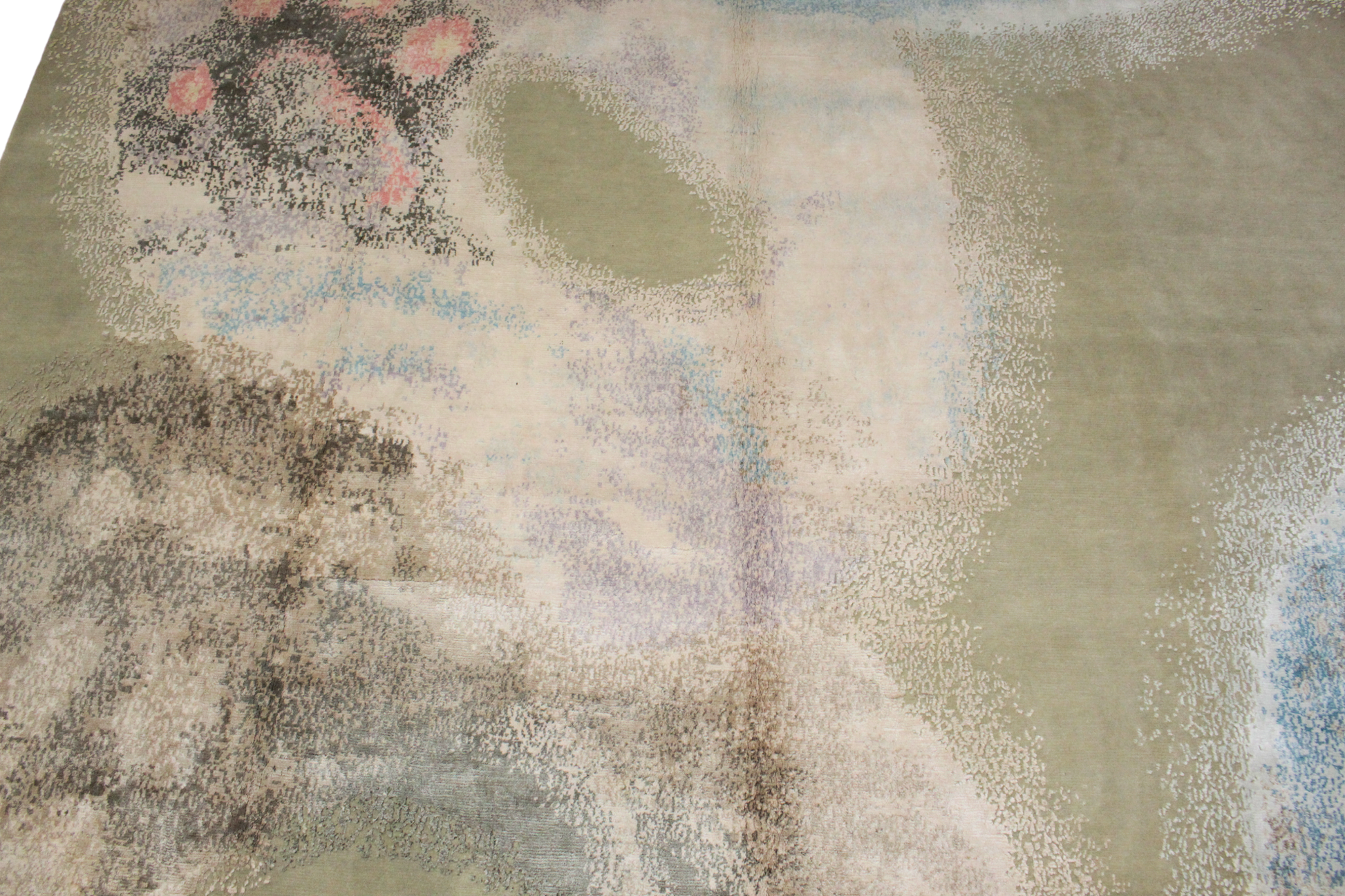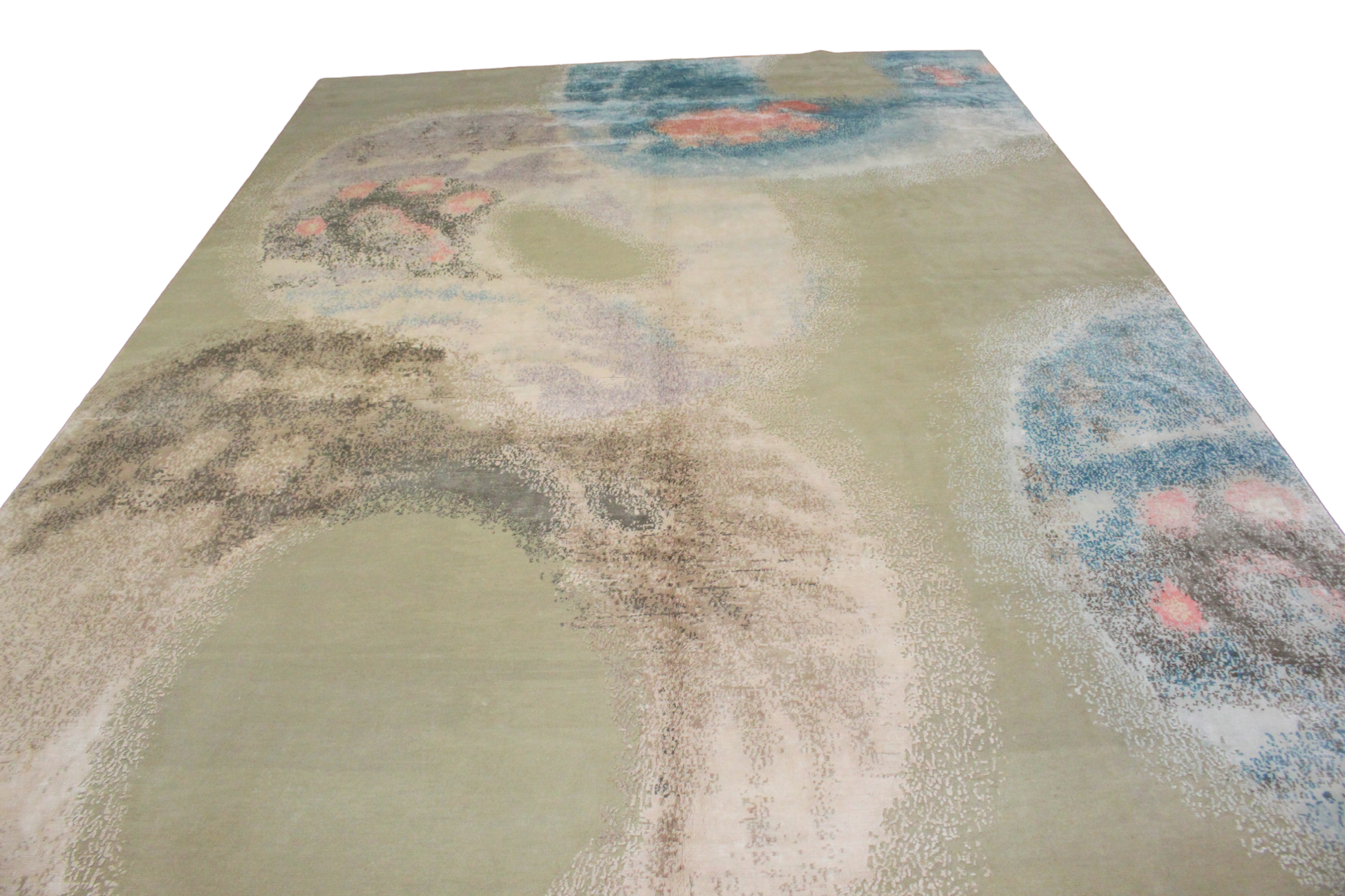A celebration of abstract motion and blurred boundaries, this hand-knotted modern rug from Nepal (9.1 × 12.3 ft) evokes the feel of painted pastels in motion. Pale sage green forms the tranquil base, while abstract ring and oval forms in muted ivory, sky blue, blush, and violet gently overlap with impressionistic texture.